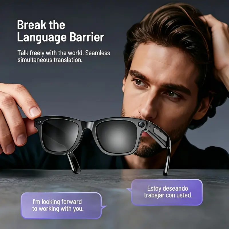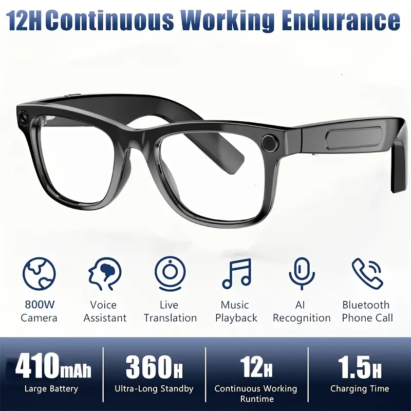 AI Smart Glasses with Camera, 8MP HD Bluetooth Camera Glasses, 2K Video Recording Sunglasses for Women Men, Real Time Translation, Voice Assistant, Open-Ear Audio for Travel, Work Vlog
