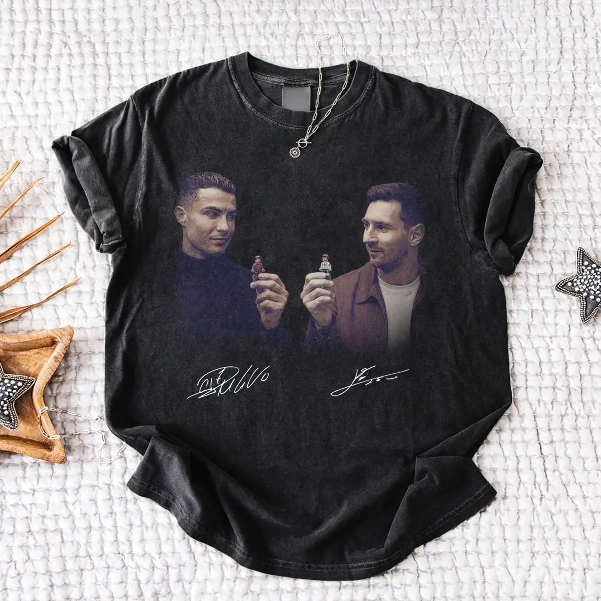 Retro Messi Chritiano Graphic Wash Shirt, Casual Sporty T-shirt, Football Goat Signature, Soccer Champ Legend Street Style Washed t-shirt IOA