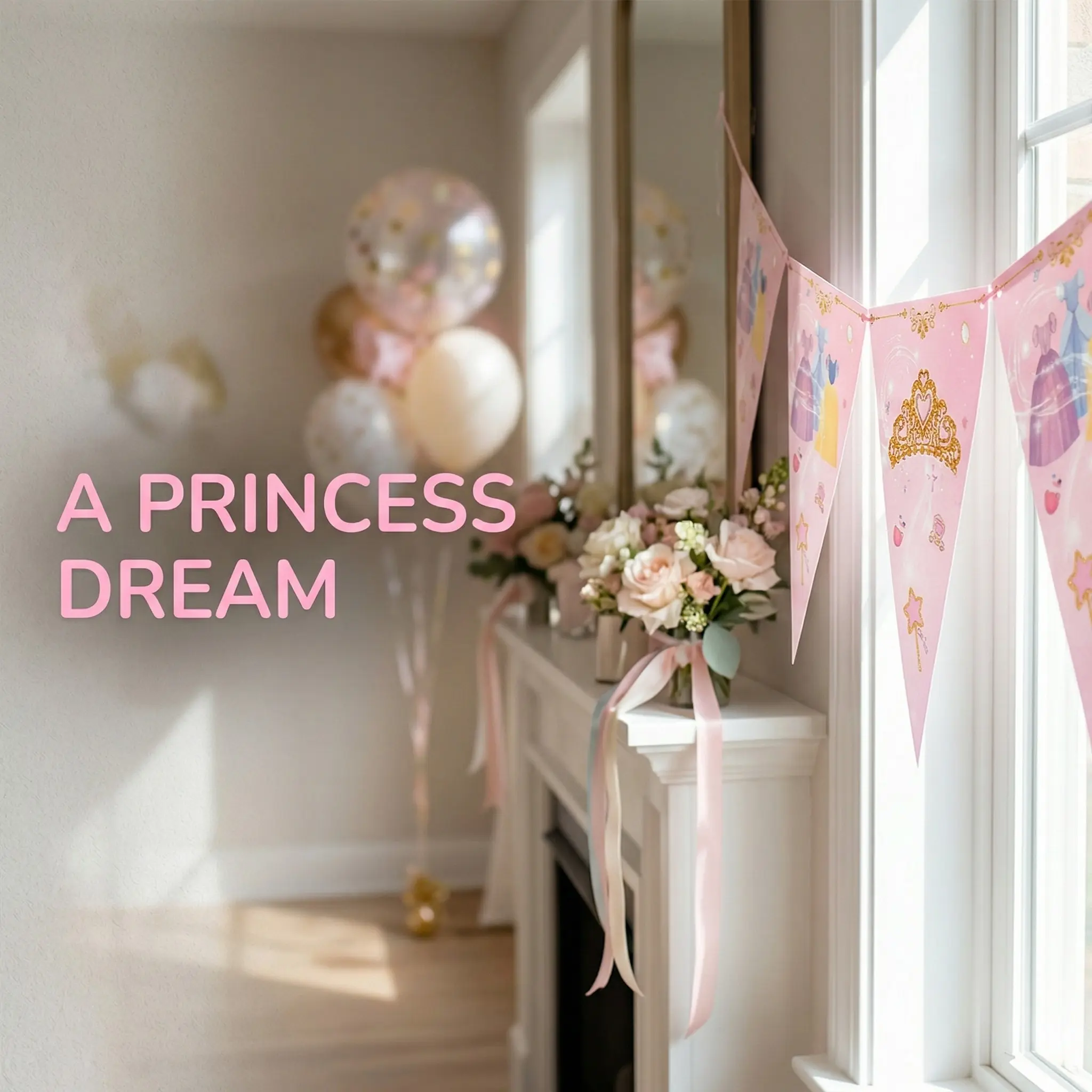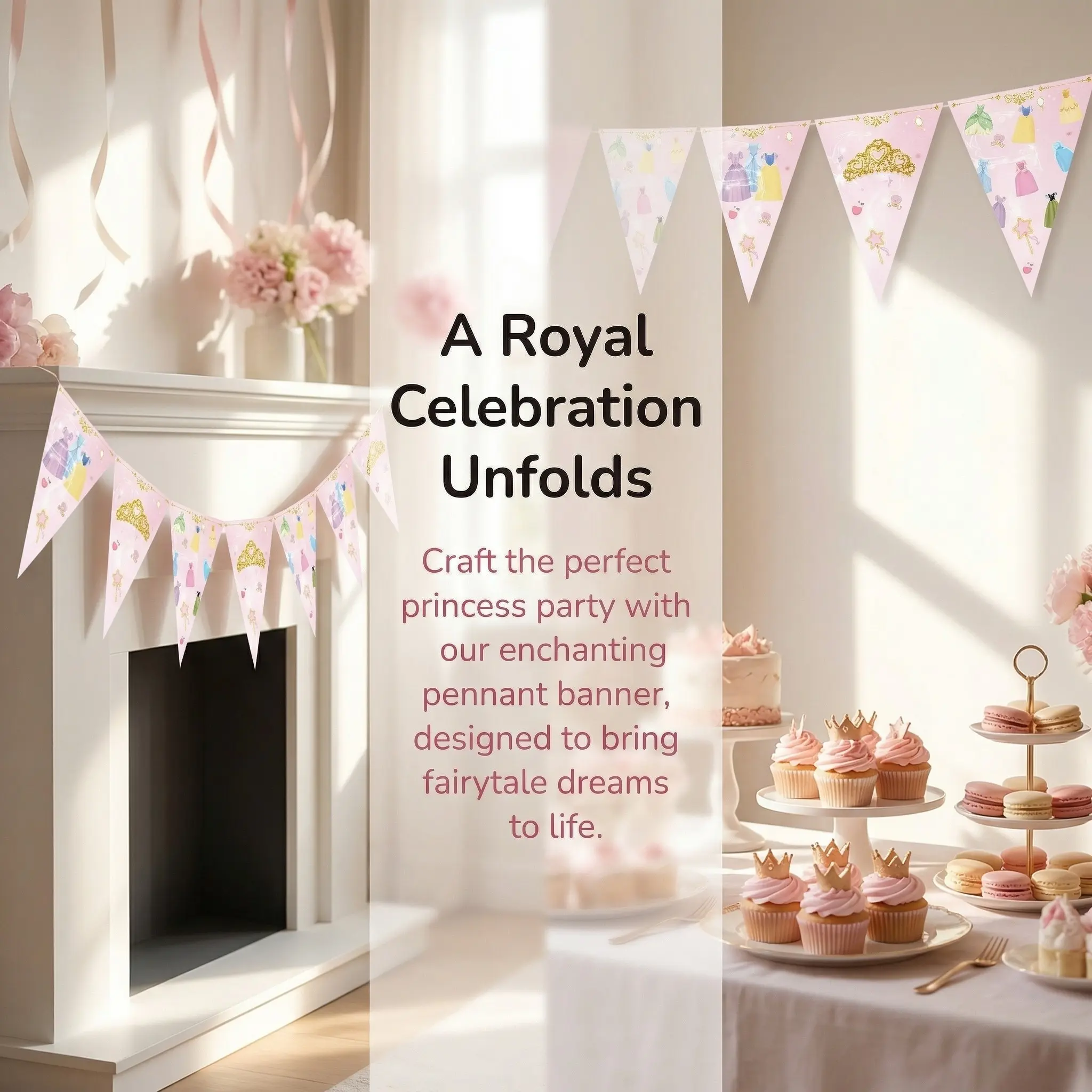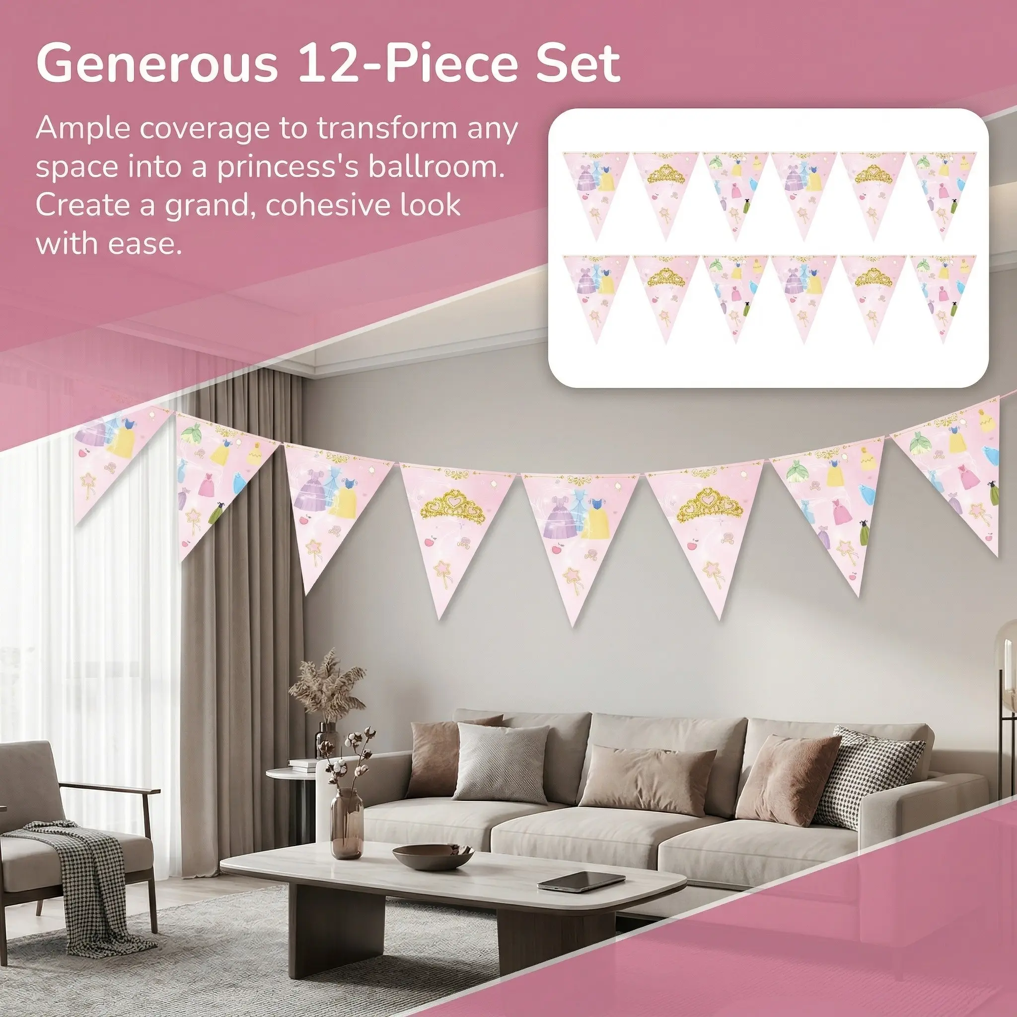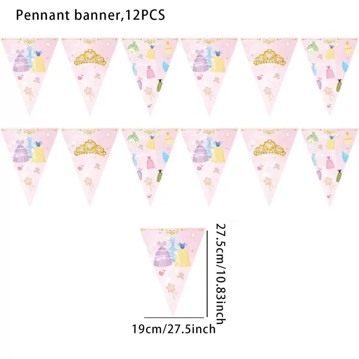 【Pink Triangular Flags】: Features pink triangular flags with crown and dress prints, perfect for festive celebrations.