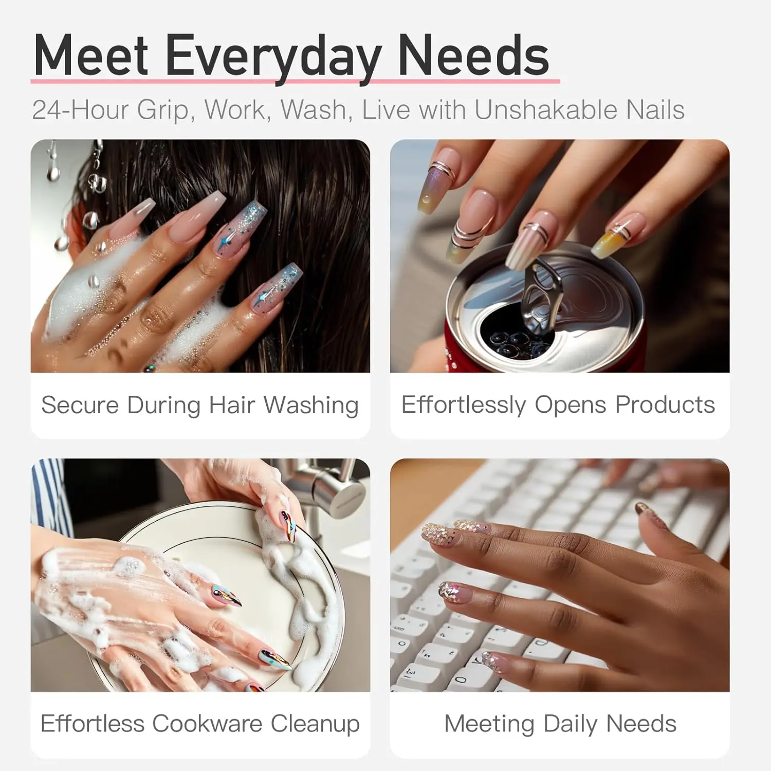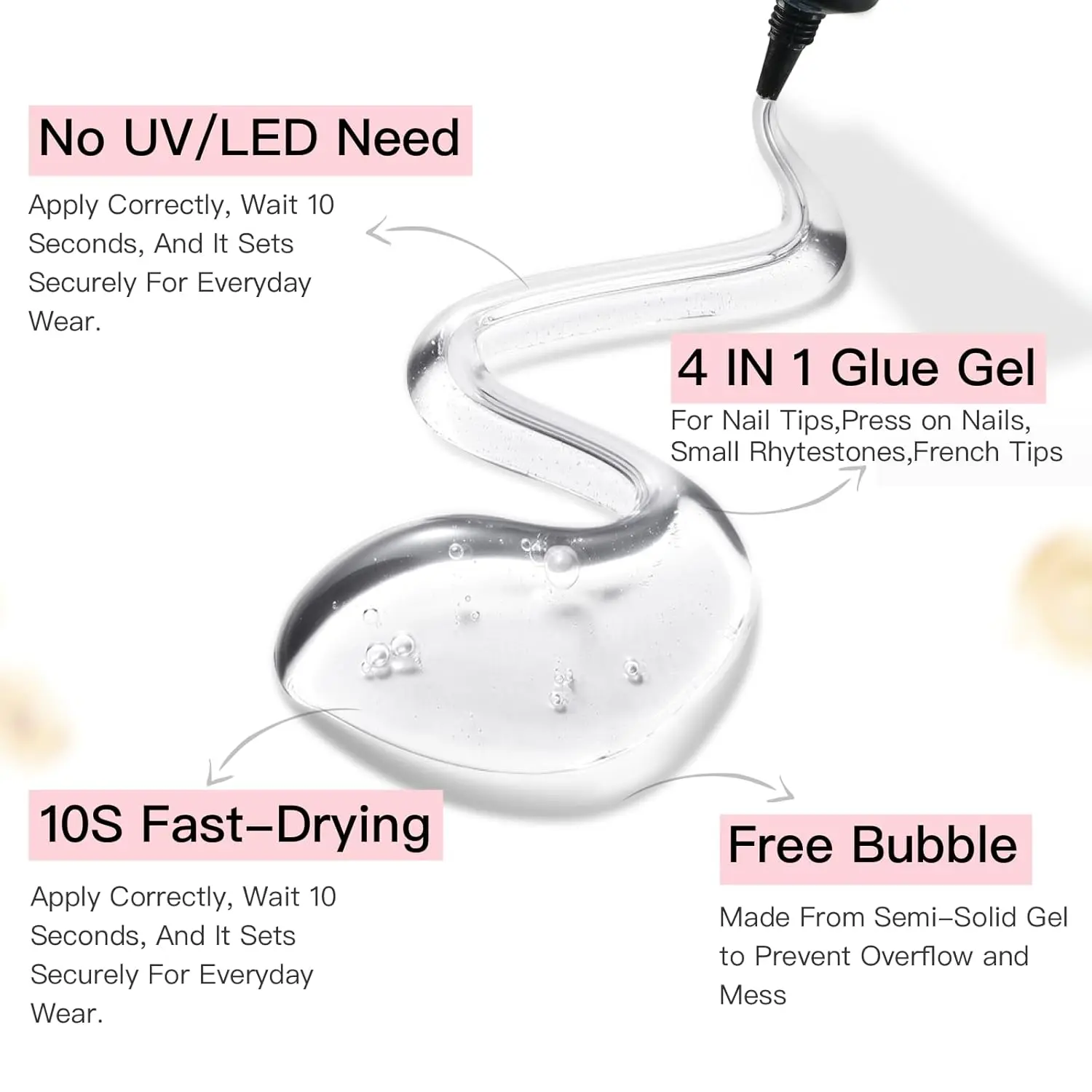 Fast drying: Only 10s NO NEED UV/LED light The semi solid glue adhesive dries quickly for quick application and manicure.