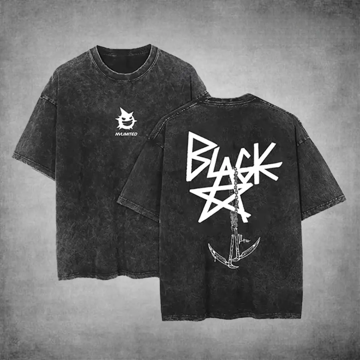 Blackstar X Chain Scythe Soul Eater Anime Oversized Cotton T-Shirt Vintage Washed Loose Fit Casual Tee Unisex Short Sleeve Streetwear Hip Hop Urban Retro Tops Soft Comfortable for Anime Fans