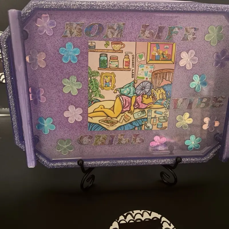Resin Art Tray - Purple Glitter Design with Floral Patterns and "Mom Life" Text - Versatile for Various Uses