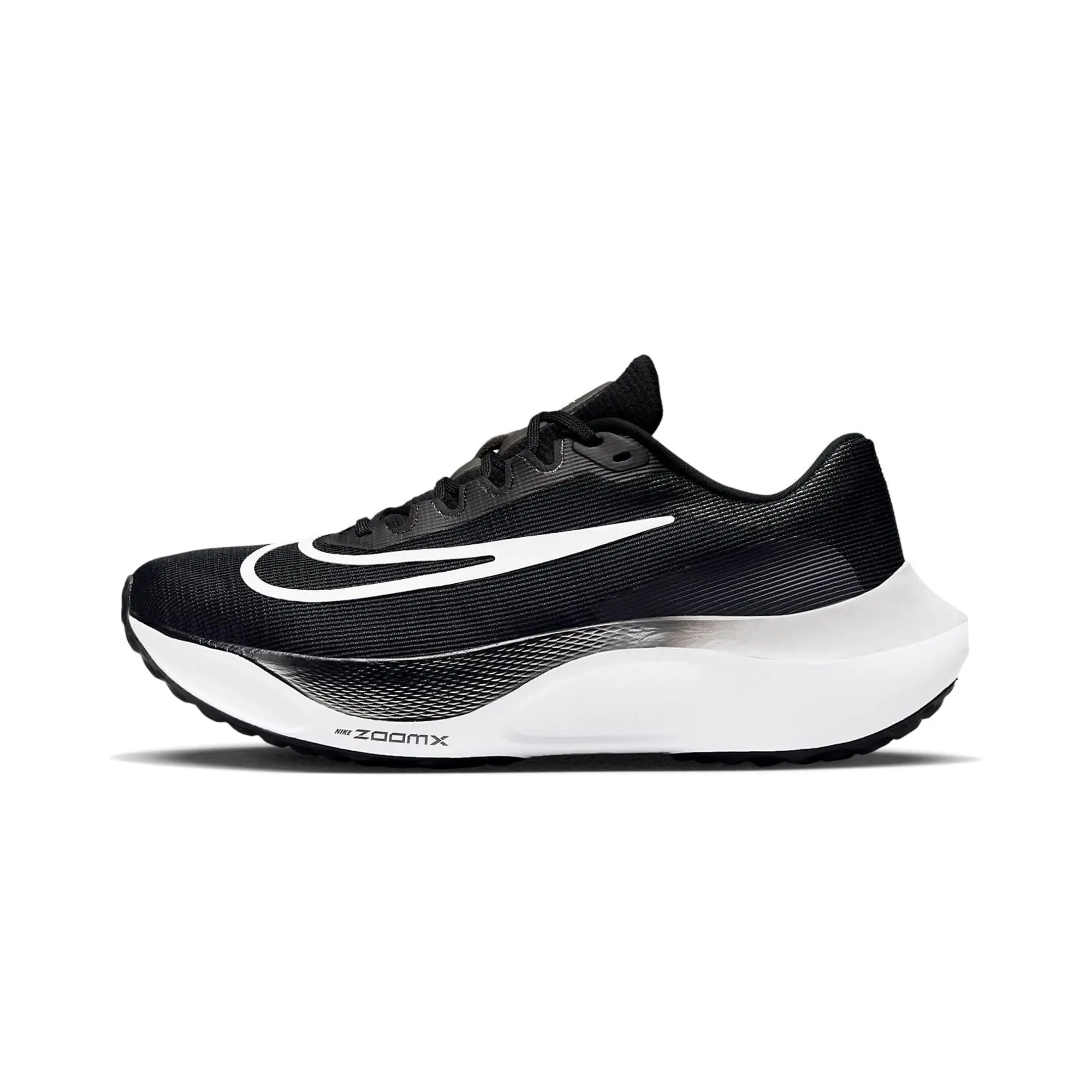 The Nike Zoom Fly 5 "Black White" delivers a clinical, high-status execution of the brand’s elite training DNA, masterfully blending marathon-grade performance with a radical, monochromatic technicality. This iteration features a premium breathable mesh upper in deep obsidian, providing a lightweight, aerodynamic foundation for the model’s complex landscape. The design is defined by its radical, sculptural profile, utilizing a massive ZoomX foam midsole that integrates a full-length carbon fiber plate for an explosive, multi-dimensional strike. Grounded by a high-traction rubber outsole and finished with an oversized, high-contrast white Swoosh that wraps from the toe to the midfoot, this release successfully pairs the raw energy of the Breaking2 project with a sophisticated, "stealth-wealth" aesthetic suitable for both the track and the modern urban rotation.