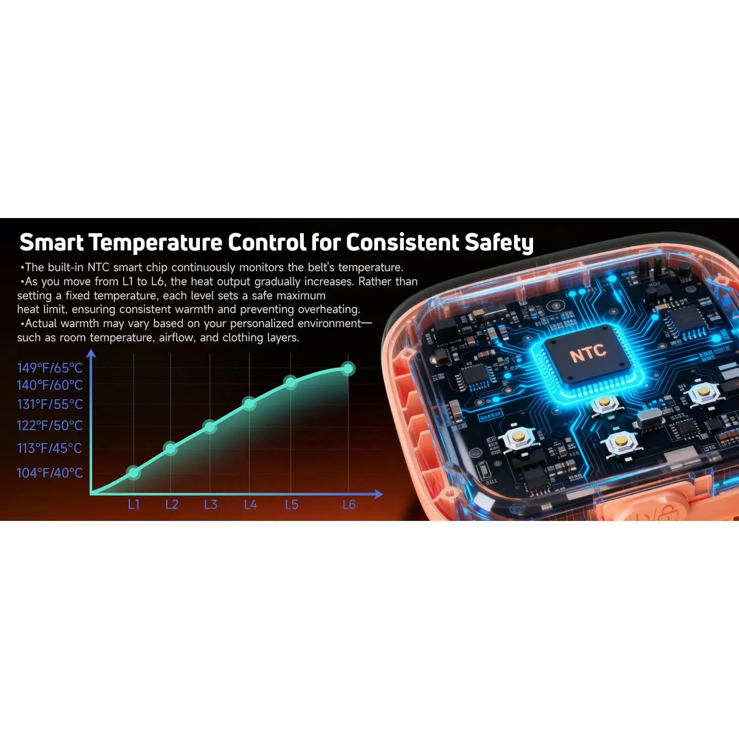 [Ultra-Comfortable & Unnoticeably Thin]Experience the gentle comfort of our yoga-wear fabric in this electric heating pad designed for menstrual cramp relief.Weighing just 94g, the ultra-thin menstrual heating pad stays invisible under clothing, while the compact controller is half your phone's weight - delivering soothing warmth that’s easy to wear all day.[Wide-Area Heating for Lasting Menstrual Cramp Relief]This menstrual heating pad covers nearly double the area of typical belts, providing broad warmth where you need it most.The 5000mAh battery supports long sessions of menstrual cramp relief, while the Type-C port supports 5V/2A fast charging for your convenience.[6 Heat Settings with Real-Time Temp]The built-in NTC smart chip continuously monitors the portable heating pad's temperature.As you move from level 1 to 6, the heat output gradually increases.Rather than setting a fixed temperature, each level sets a safe maximum heat limit, ensuring effective menstrual cramp relief without overheating risks.Actual warmth may vary based on your personalized environment-such as room temperature, airflow, and clothing layers.[Auto Shut-Off Timer for Safe & Customized Use]Customize your warmth session by setting the automatic timer from 10 to 99 minutes in 10-minute intervals (default: 30 mins).This heating pad allows you to freely define the shut-off time to perfectly fit your schedule.For your safety and comfort, we recommend limiting use to 30 minutes when enjoying higher temperatures above 113°F(45°C.[No More Tangled Wires & User-Friendly Design]The control box connects securely to the menstrual heating pad with a snap-on design, using Pogo Pin power transfer instead of messy cables.The easy-read screen faces you for a quick glance.Tactile buttons allow hassle-free operation without looking.You can also Check Battery Life, Switch between°C/°F, Lock Keypad and Mute Beeps-all designed for effortless daily use.