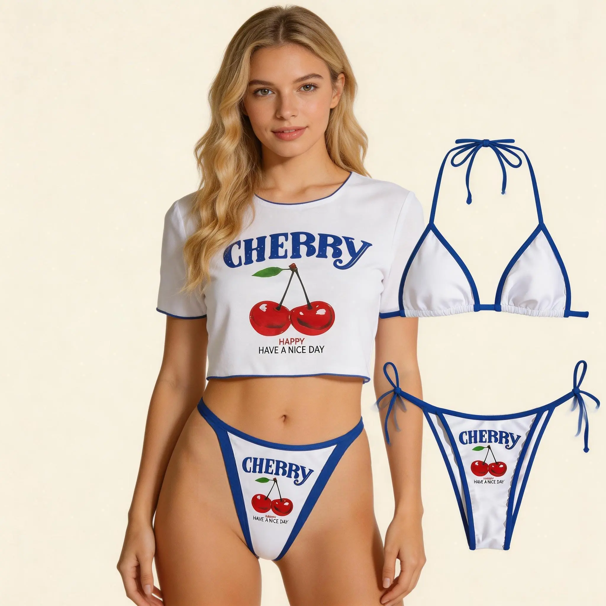 Chic Print: Features a playful cherry and letter print, offering a unique visual appeal that distinguishes it from standard swimwear.