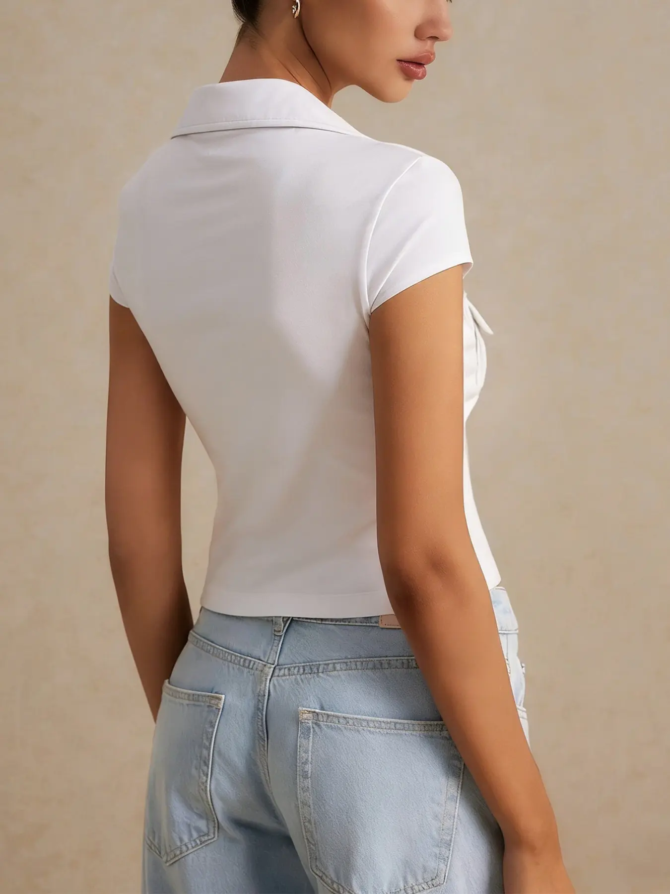 1 Pc Women's White Cropped Button Down Shirt Short Sleeve with Dual Chest Pockets Slim Fit for Casual Office Daily Wear