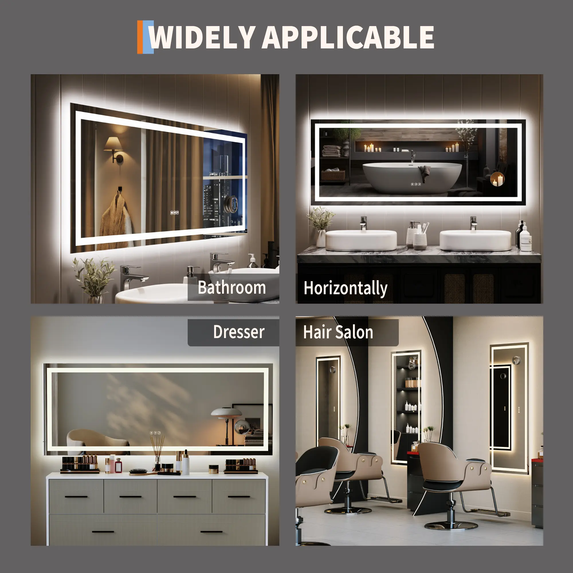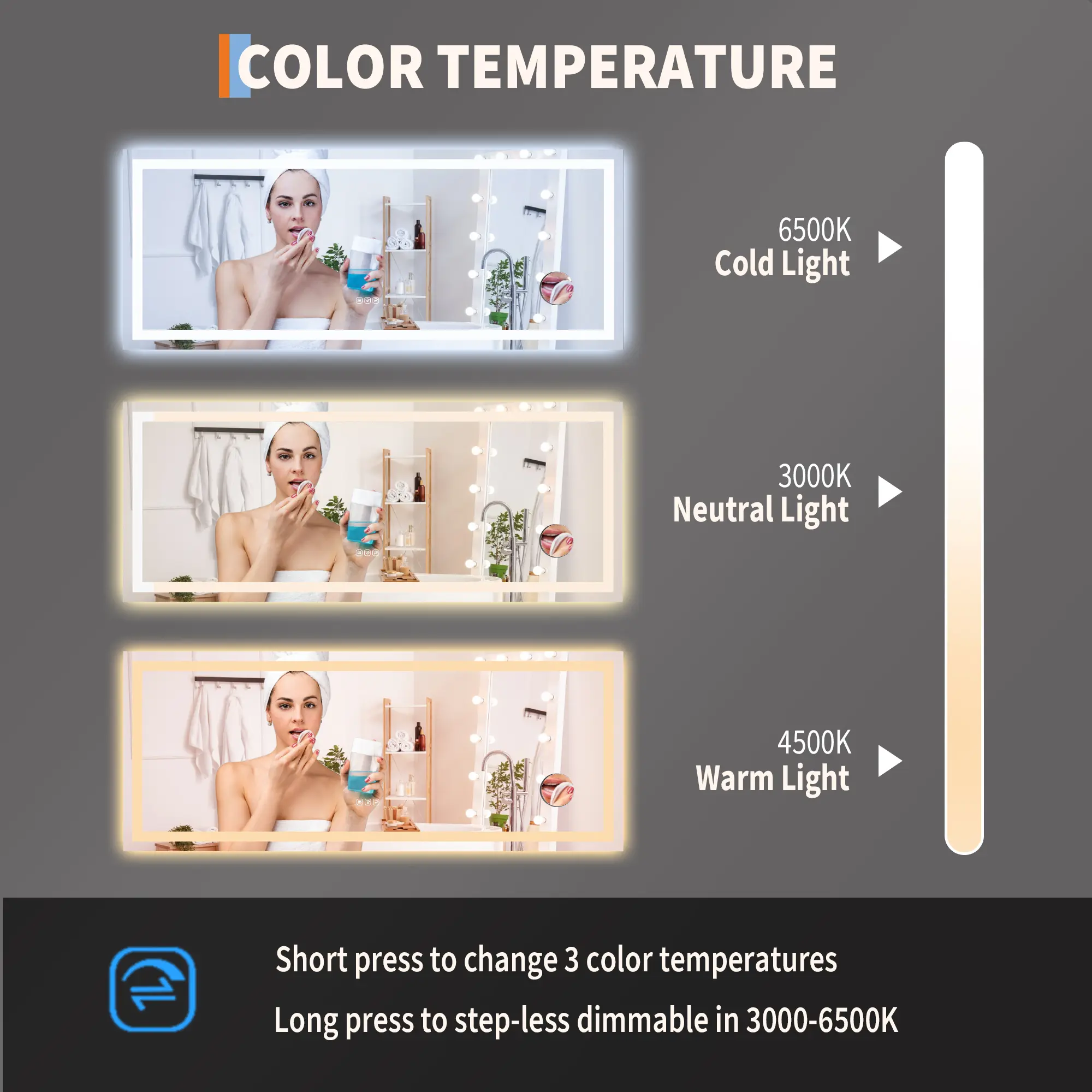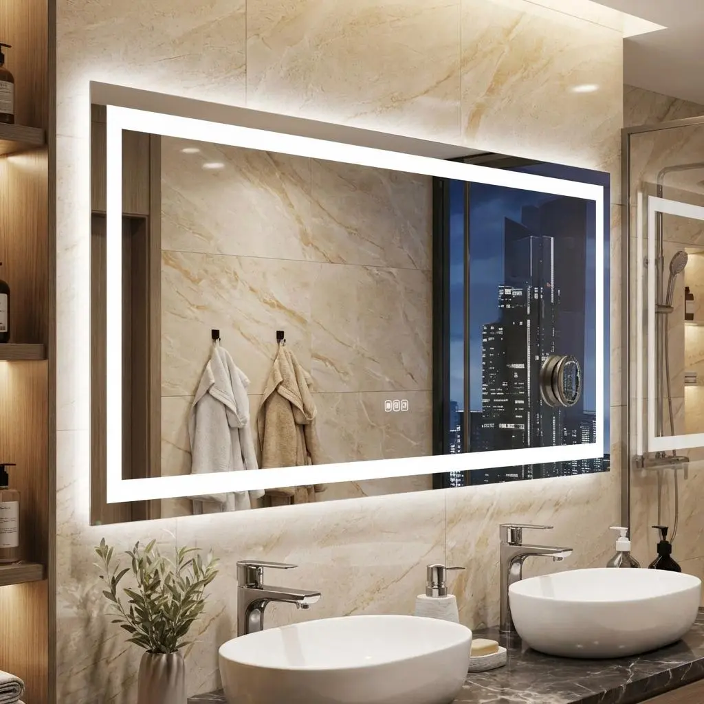 ·✨【Fully Adjustable Lighting with Memory Function】 lighted mirrors for bathroom wall features multiple light settings that are easily controlled with sensitive touch buttons.Personalize your glow with stepless dimming and three color temperatures: warm (3000K), natural (4000K), and bright white (6000K). Use intuitive touch controls to adjust brightness and instantly. The smart memory feature automatically saves your last setting, so your preferred light is ready every time you turn it on.