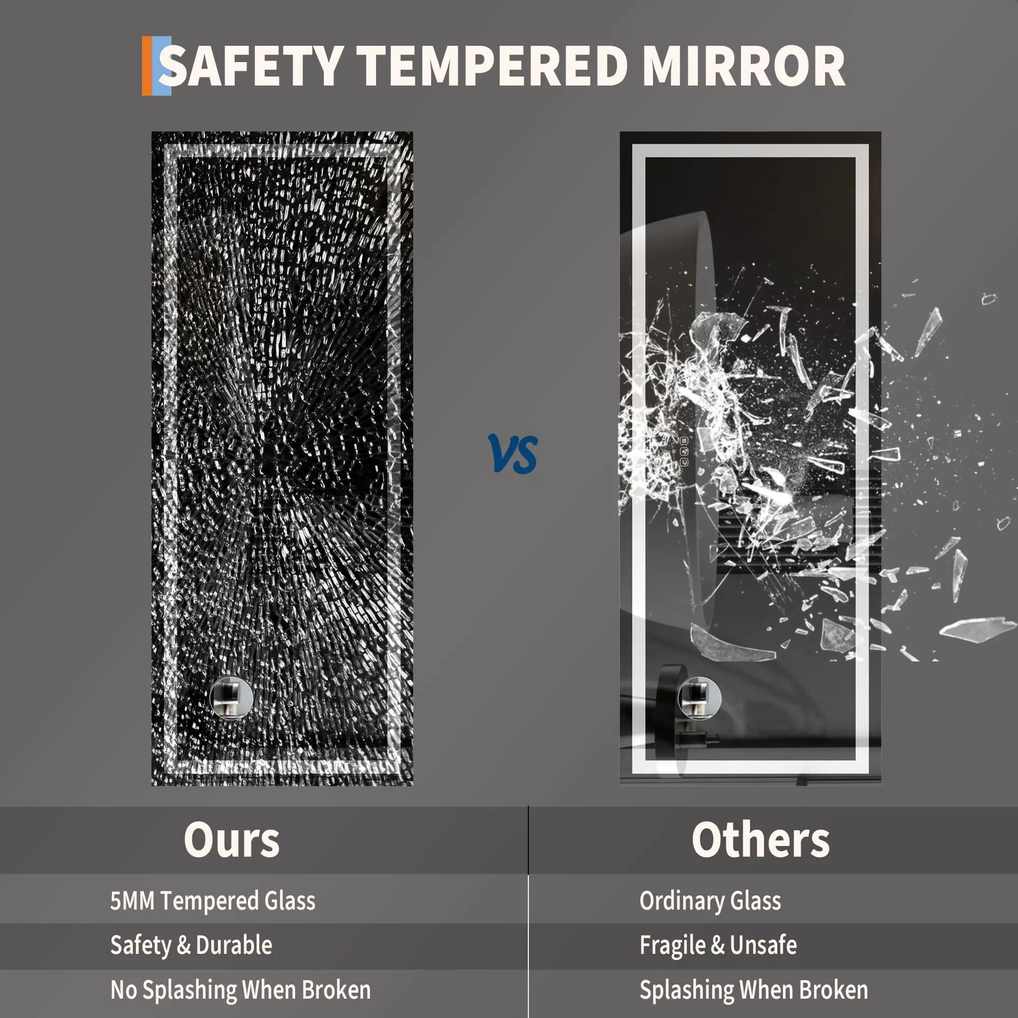 ·👍【Shatter-Proof Tempered Glass for Lasting Safety】 Lighted vanity mirror is made of 5mm thermally tempered glass, this mirror is up to 5 times stronger than ordinary glass. In the rare event of impact, it breaks into small granular pieces instead of sharp shards, significantly reducing injury risks. Built with a rust-resistant aluminum frame, it promises durability and safe daily use.