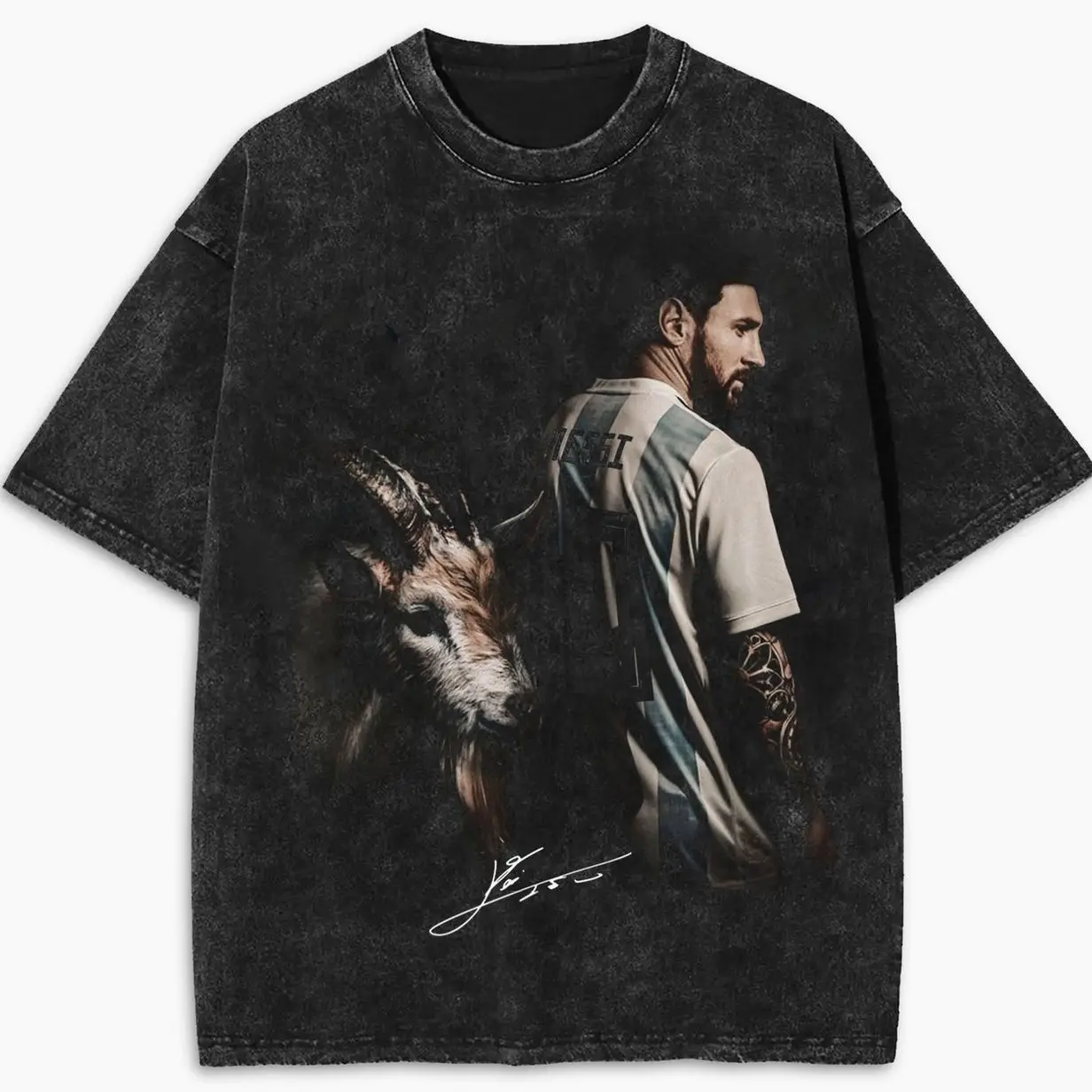 Vintage Messi Graphic Wash Shirt, Casual Sporty T-shirt, Football Goat Signature Outdoor, Soccer Champ Legend Street Style Washed t-shirt 6GO