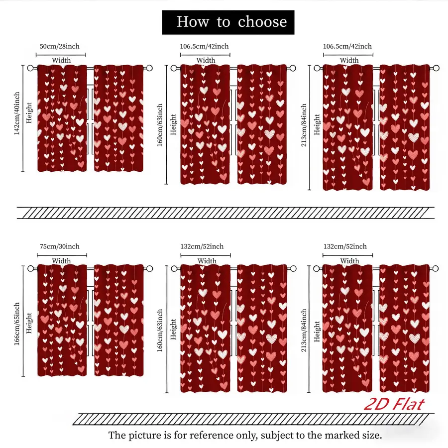 2Pcs Romantic Red Heart Pattern Sun Blocking Curtains Digital Printed Rod Pocket for Bedroom Office Kitchen Living Room Study Home Decor Soft Light Filter Easy Installation