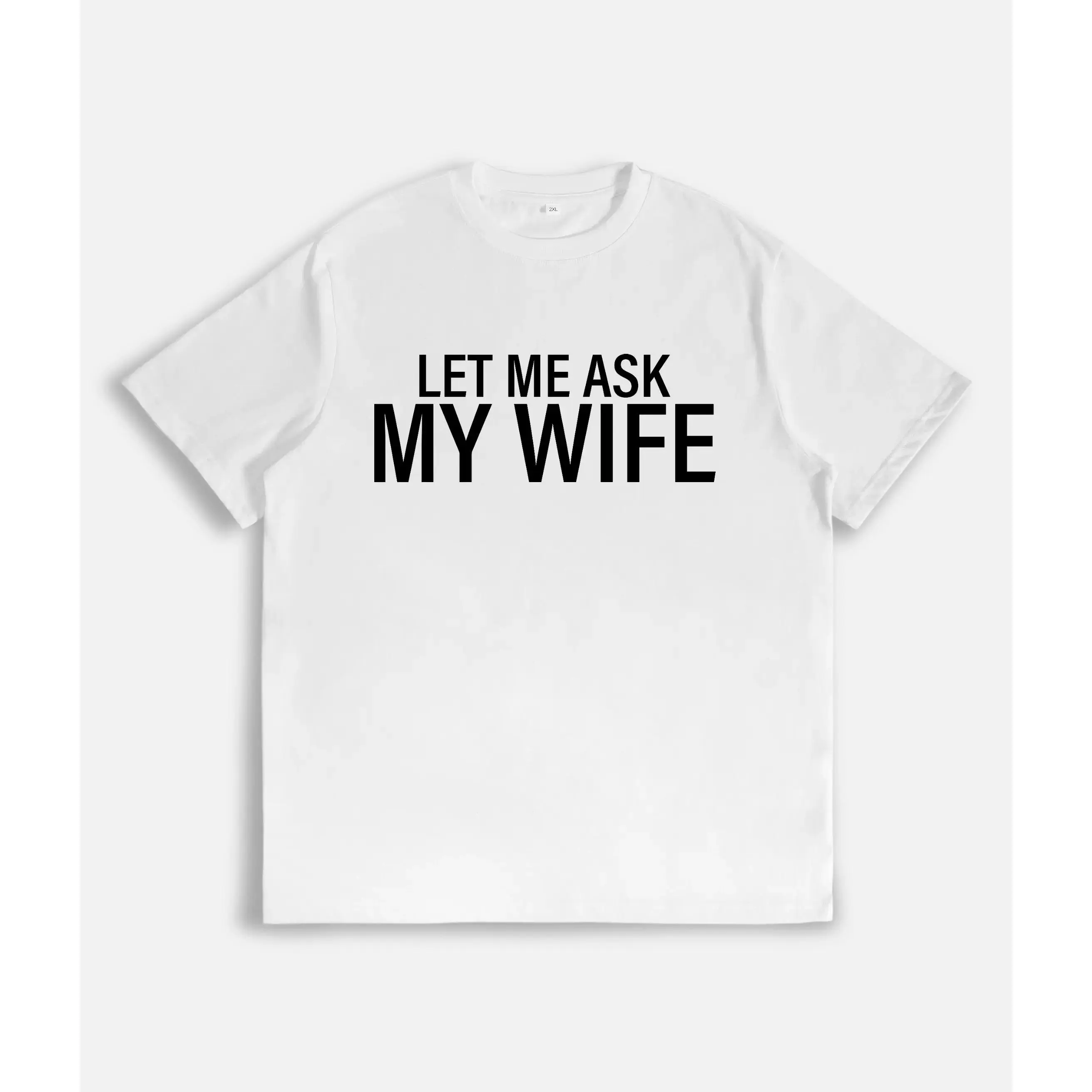 Black Cotton T-Shirt with the humorous quote "LET ME ASK MY WIFE" printed in white font