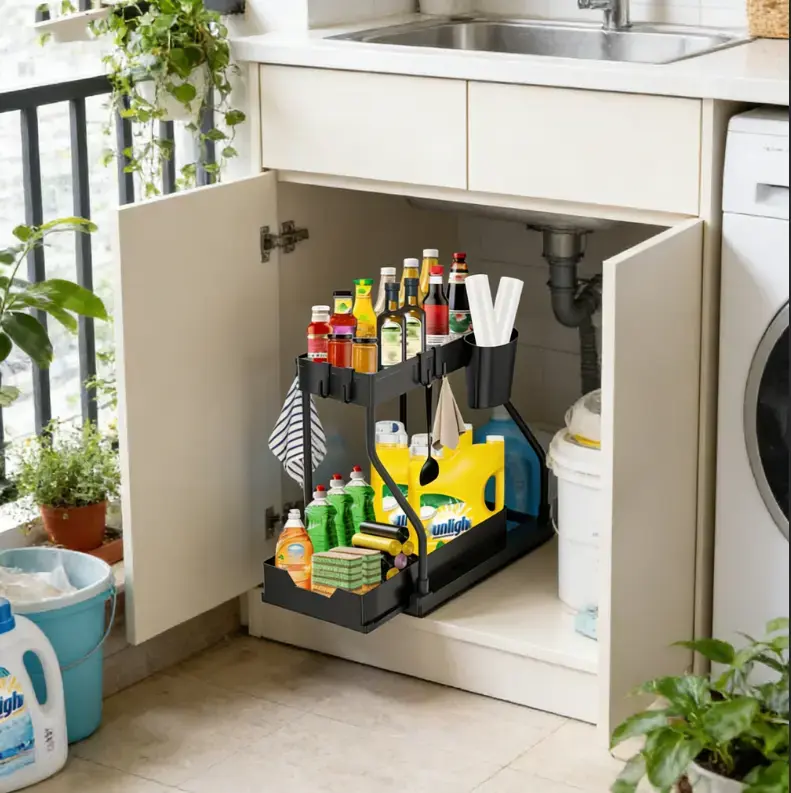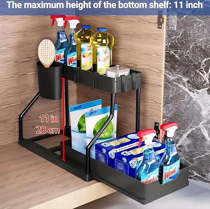·2-Tier Design: Maximizes vertical storage space with two sliding baskets that provide easy access to items stored in the back of cabinets