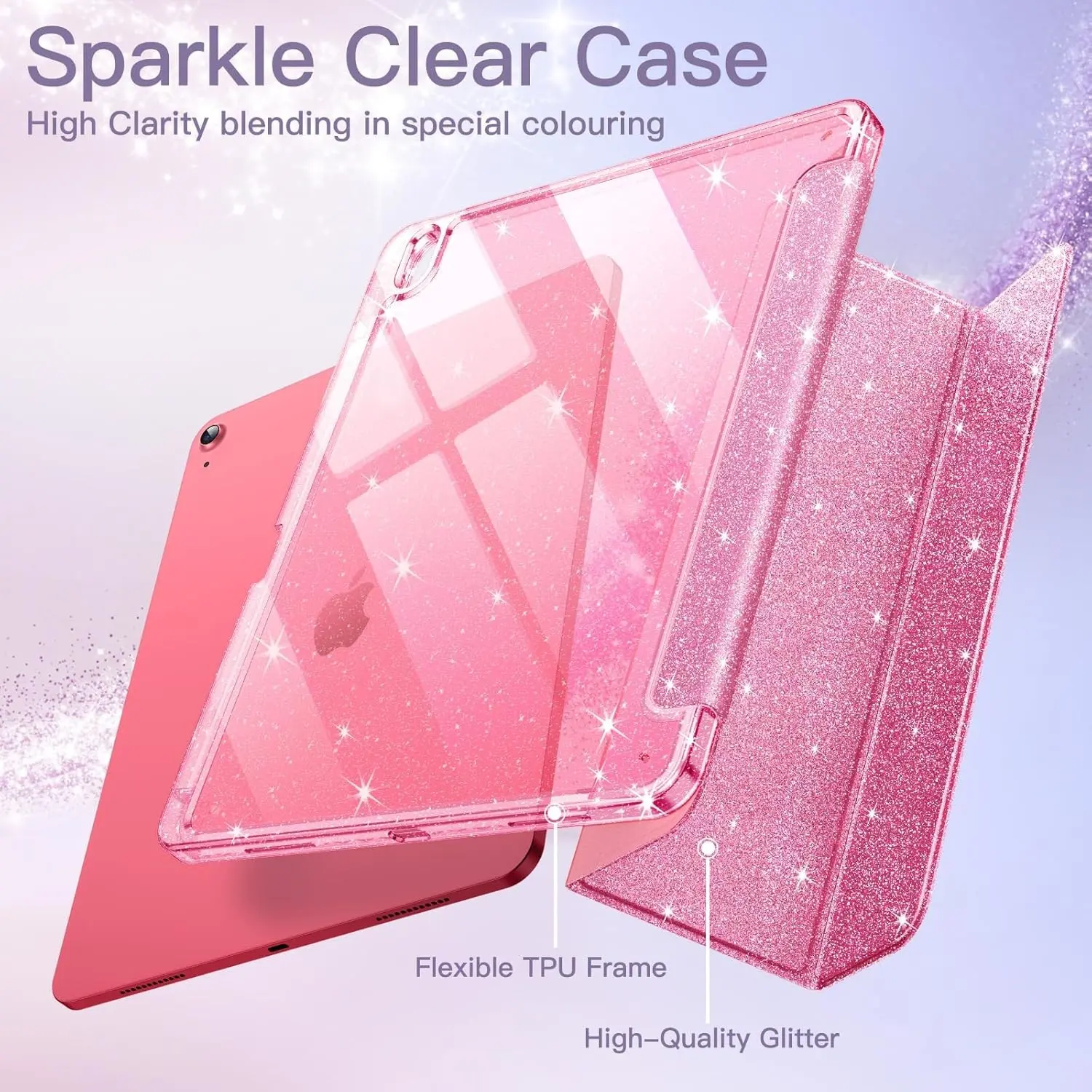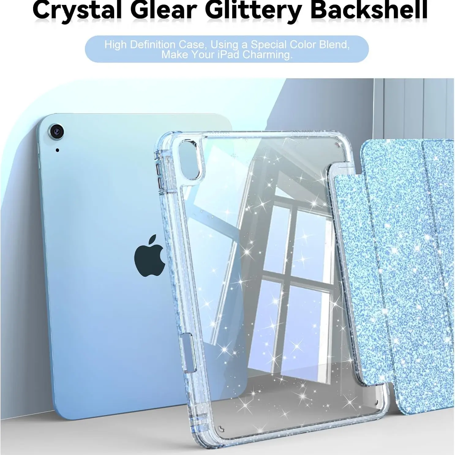 iPad A16 Case 11th/10th Gen 2022, Sparkly Slim Cover with Pencil Holder, Shiny Clear Back Shell for Kids and Girls