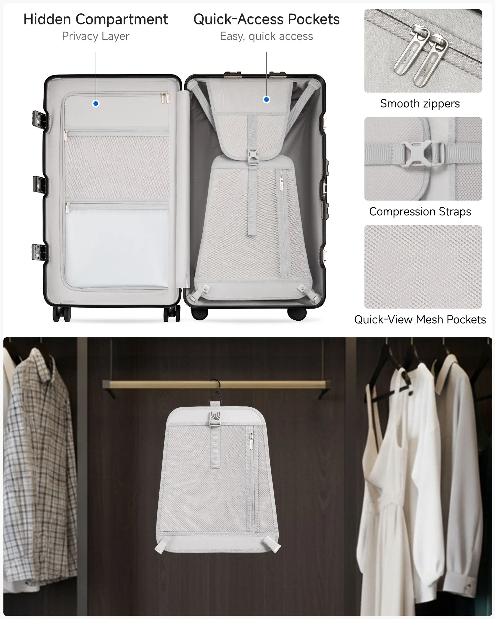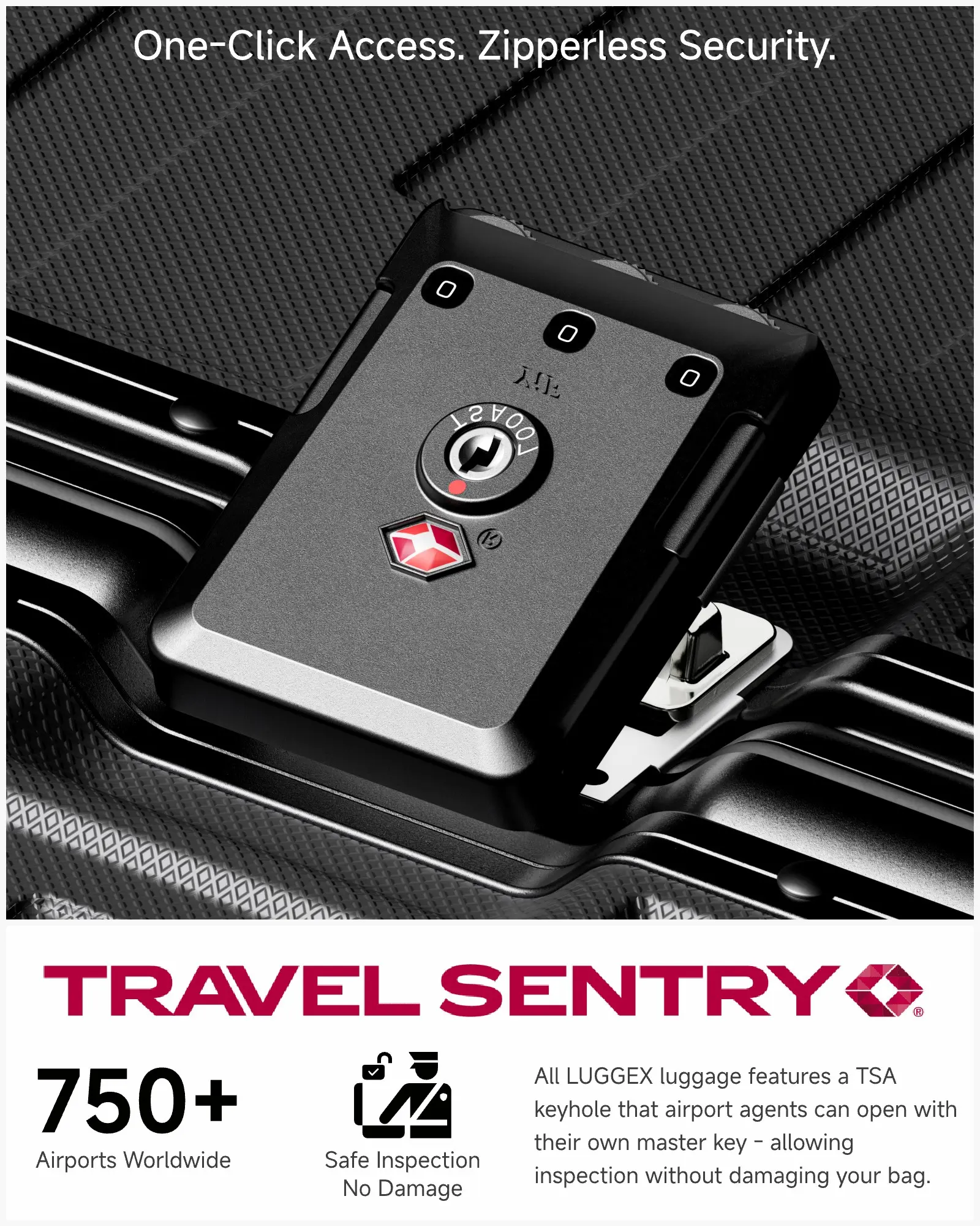·Enhanced Security & Zipperless Access: Features a central safety lock positioned close to the suitcase face, requiring simultaneous pressing on both sides to prevent accidental opening. Combined with advanced TSA latches for one-touch unlocking, this dual‑lock system offers added security and quick, hassle‑free access without zippers.