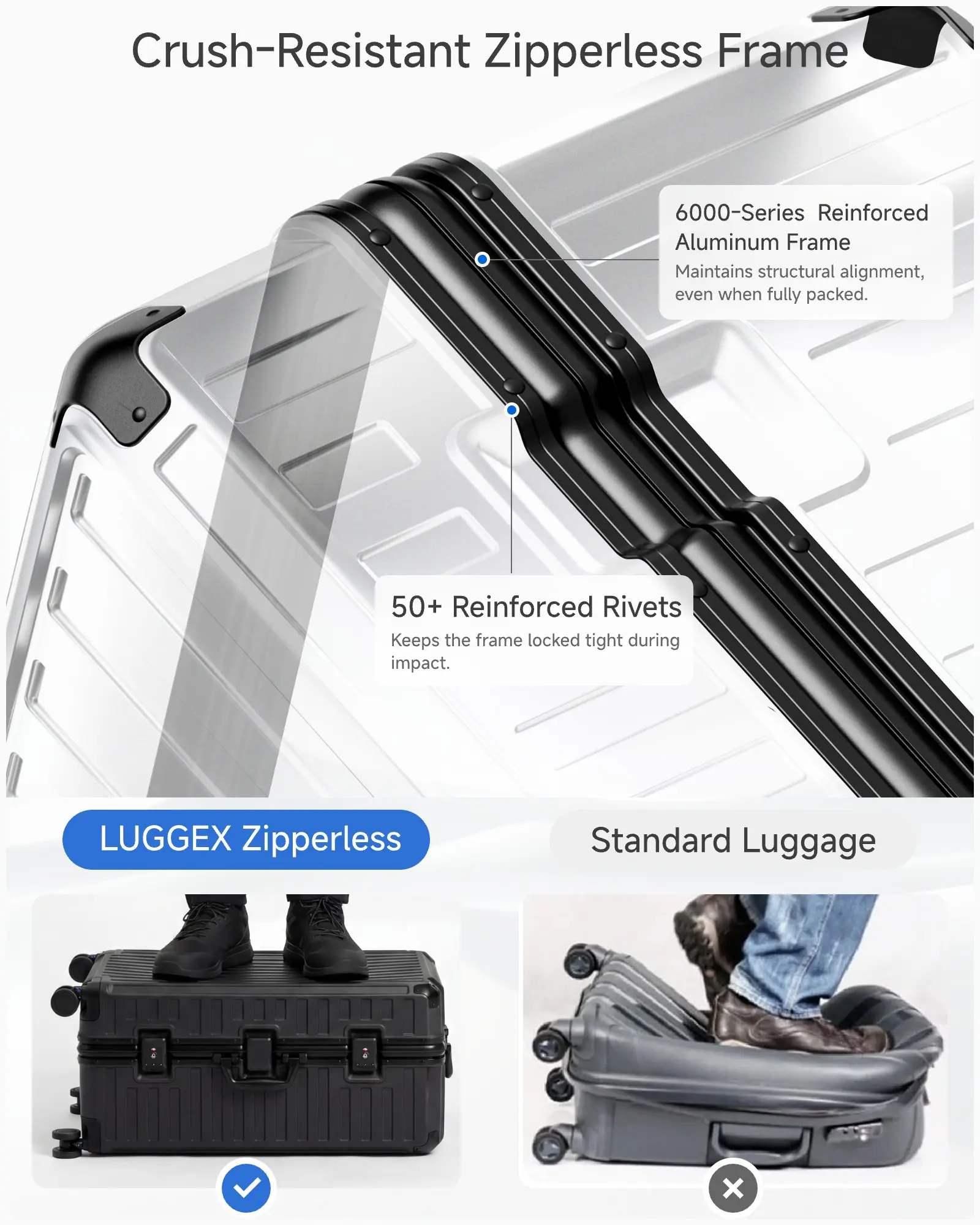 ·Aluminum Frame + 100% PC: One-piece molded aluminum frame for deformation resistance and reinforcement. 100% polycarbonate case with superior toughness and resilience compared to ABS+PC, providing 360° robust protection for luggage safety.