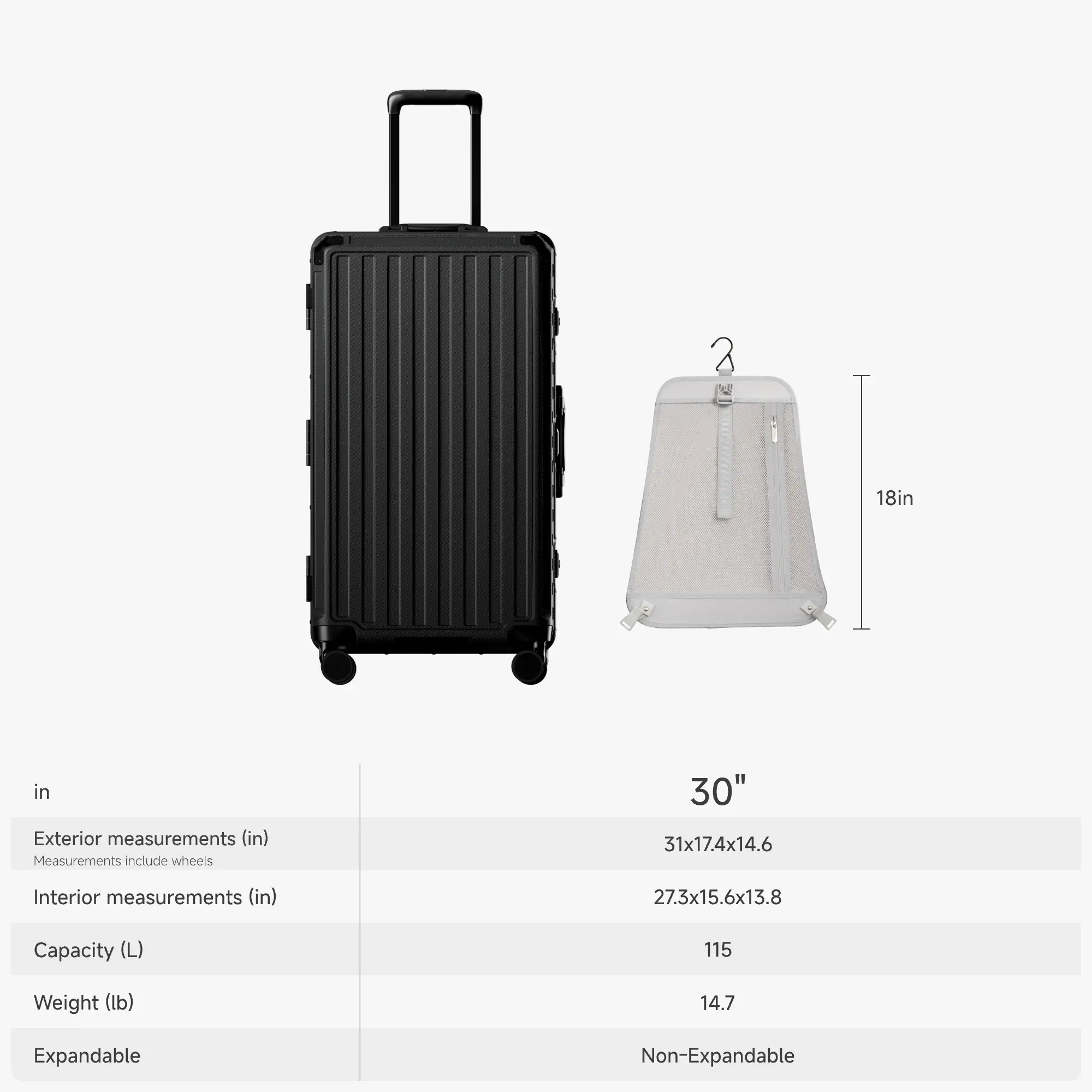 ·Complete Suitcase & Organizer Set: Includes the 8010S aluminum frame checked suitcase, five packing cubes, and a dedicated shoe bag. Suitcase external dimensions: 31 × 17.4 × 14.6 in (including wheels and handles); internal dimensions: 27.8 × 15.9 × 14.6 in; weight: 16.4 lb; capacity: 115 L. The packing cubes and shoe bag help organize clothing, accessories, and footwear separately.