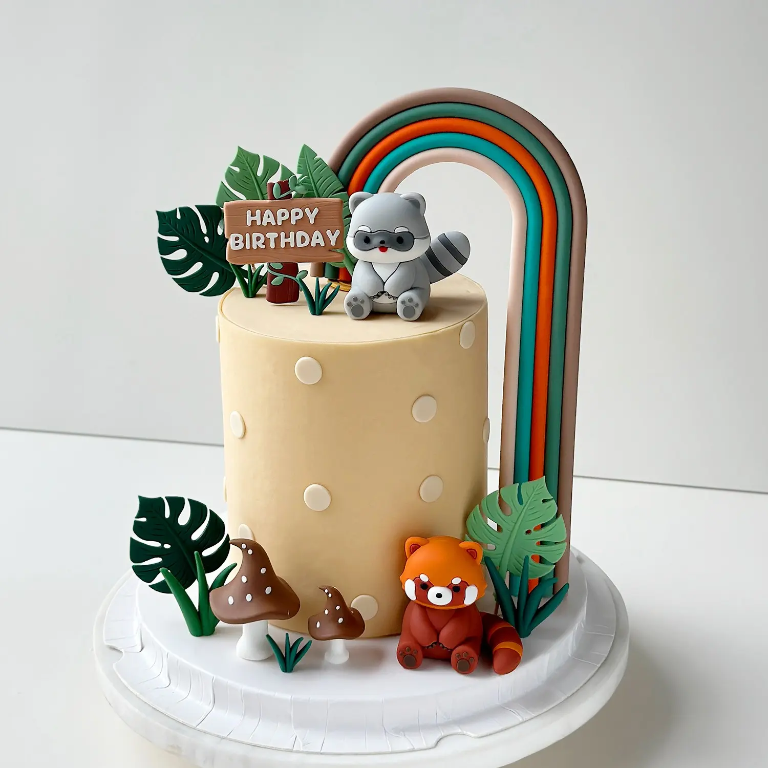 Small Panda Raccoon Forest Cake Decoration Set, Birthday Baking Decorations, Jungle Theme Baby Birthday Dessert Table Decor
