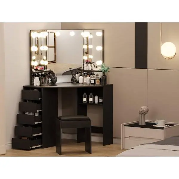 Elegant Space-Saving Corner Design in Classic White Crafted from select wood and MDF in a timeless white finish, this chic corner vanity fits beautifully into bedrooms or dressing rooms. Its smart design maximizes style while minimizing floor space.
