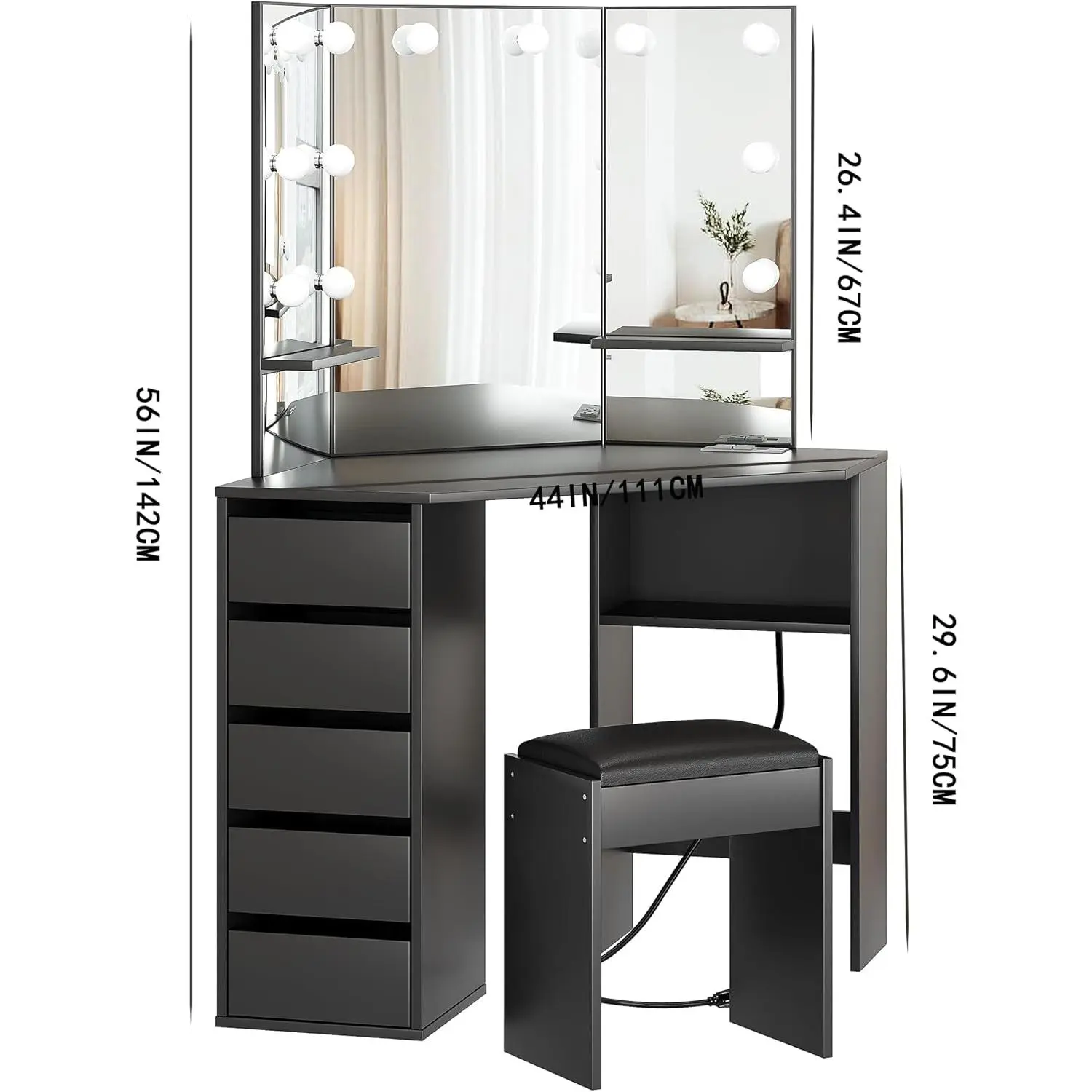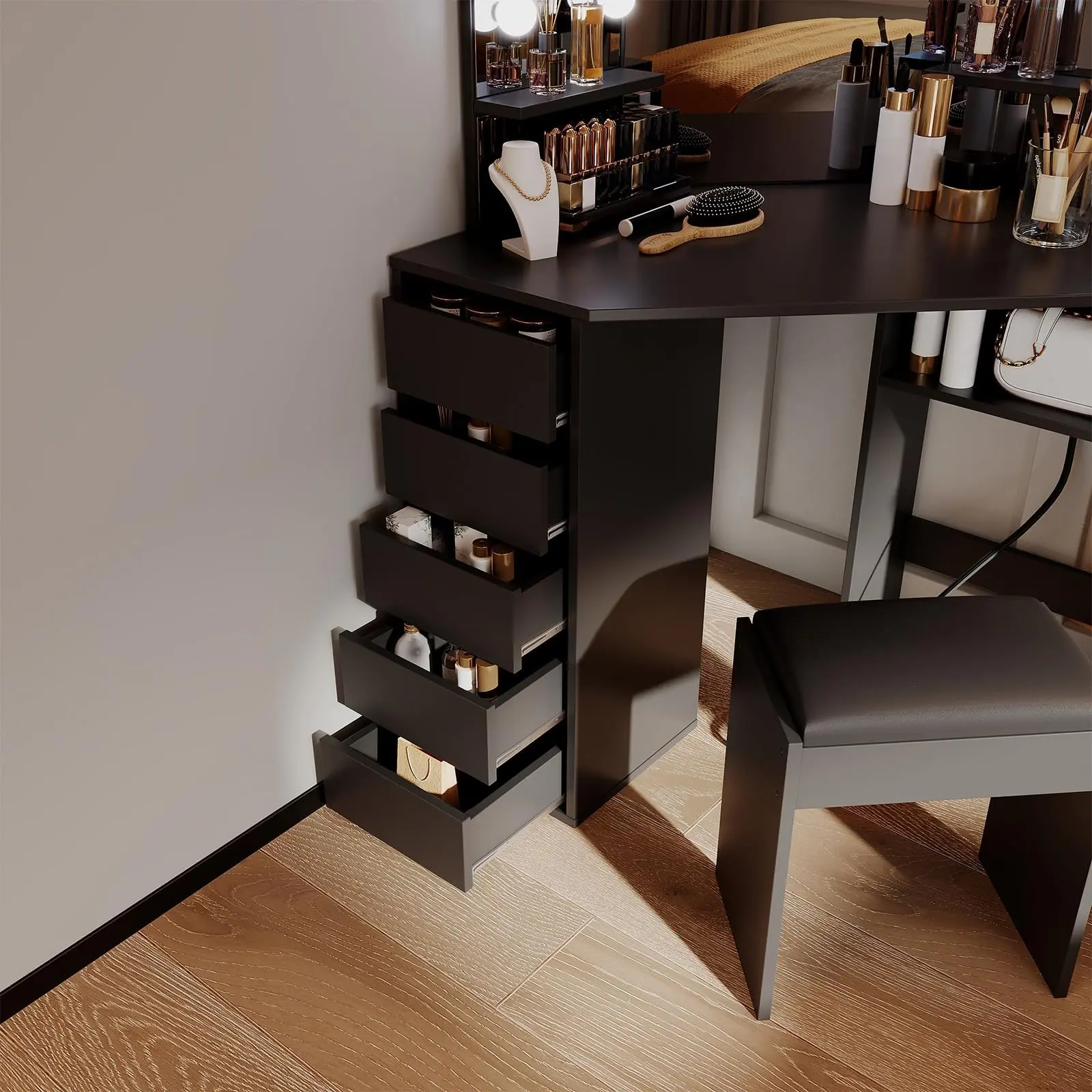 Ample & Organized Storage with 5 Drawers & Open Shelves Stay perfectly organized with generous storage, including 5 spacious drawers, 2 open shelves, and a large desktop. This provides a dedicated, tidy home for all your cosmetics, hair tools, and accessories.