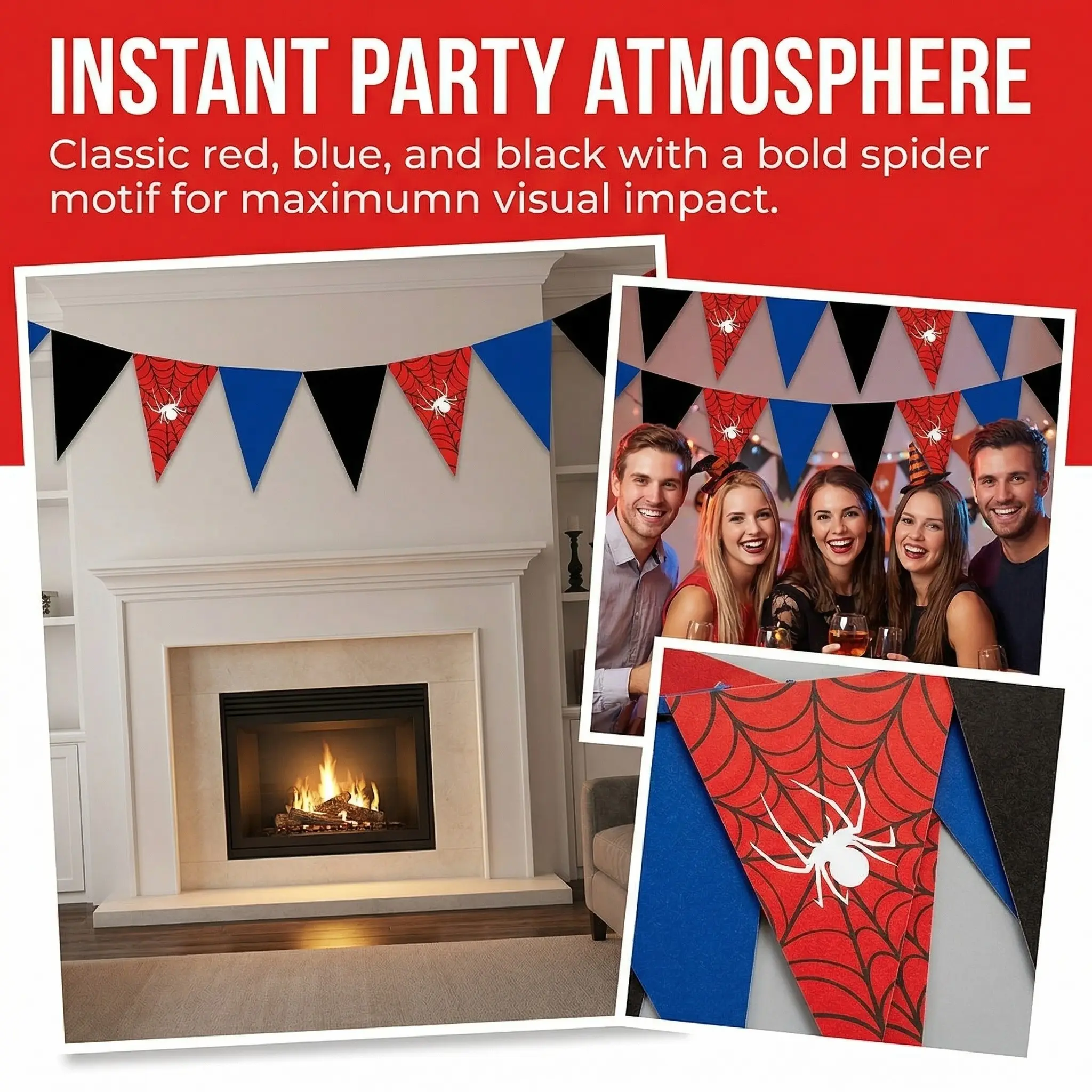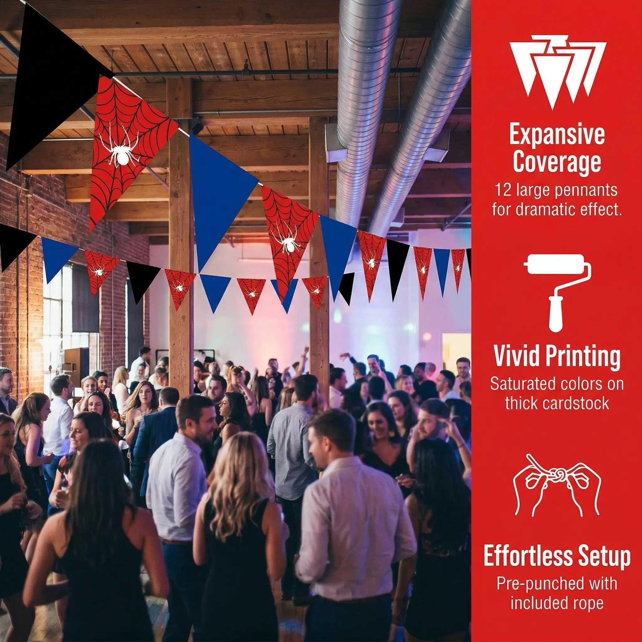 12pcs set of spider-themed Halloween party supplies Happy Birthday banner party decorations, classic red, blue, and black color scheme with Spider Web pattern design triangular flags, home wall decoration, wedding anniversary, holiday celebration supplies