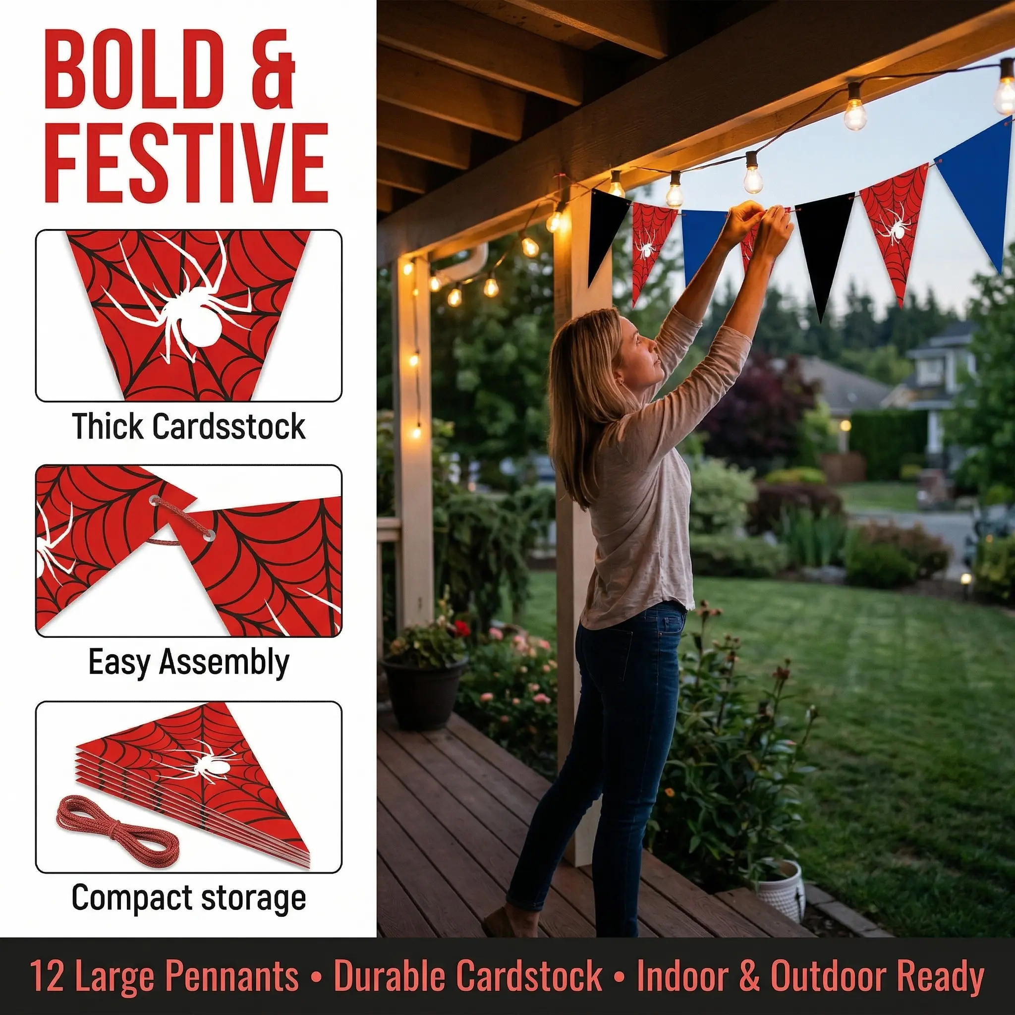 5. 12pcs set of spider-themed Halloween party supplies Happy Birthday banner party decorations, classic red, blue, and black color scheme with Spider Web pattern design triangular flags, home wall decoration, wedding anniversary, holiday celebration supplies