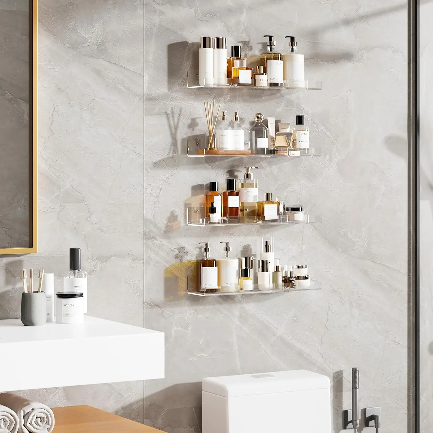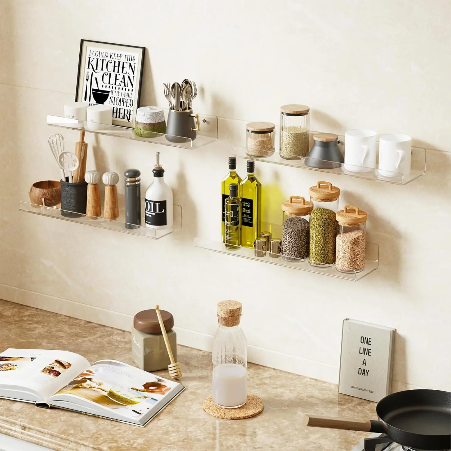 These shelves are versatile and suitable for multiple rooms. Use them in bedrooms for book storage, in bathrooms for toiletries, or in kitchens for spices. Their clear design complements any decor. A practical and stylish addition to your home.