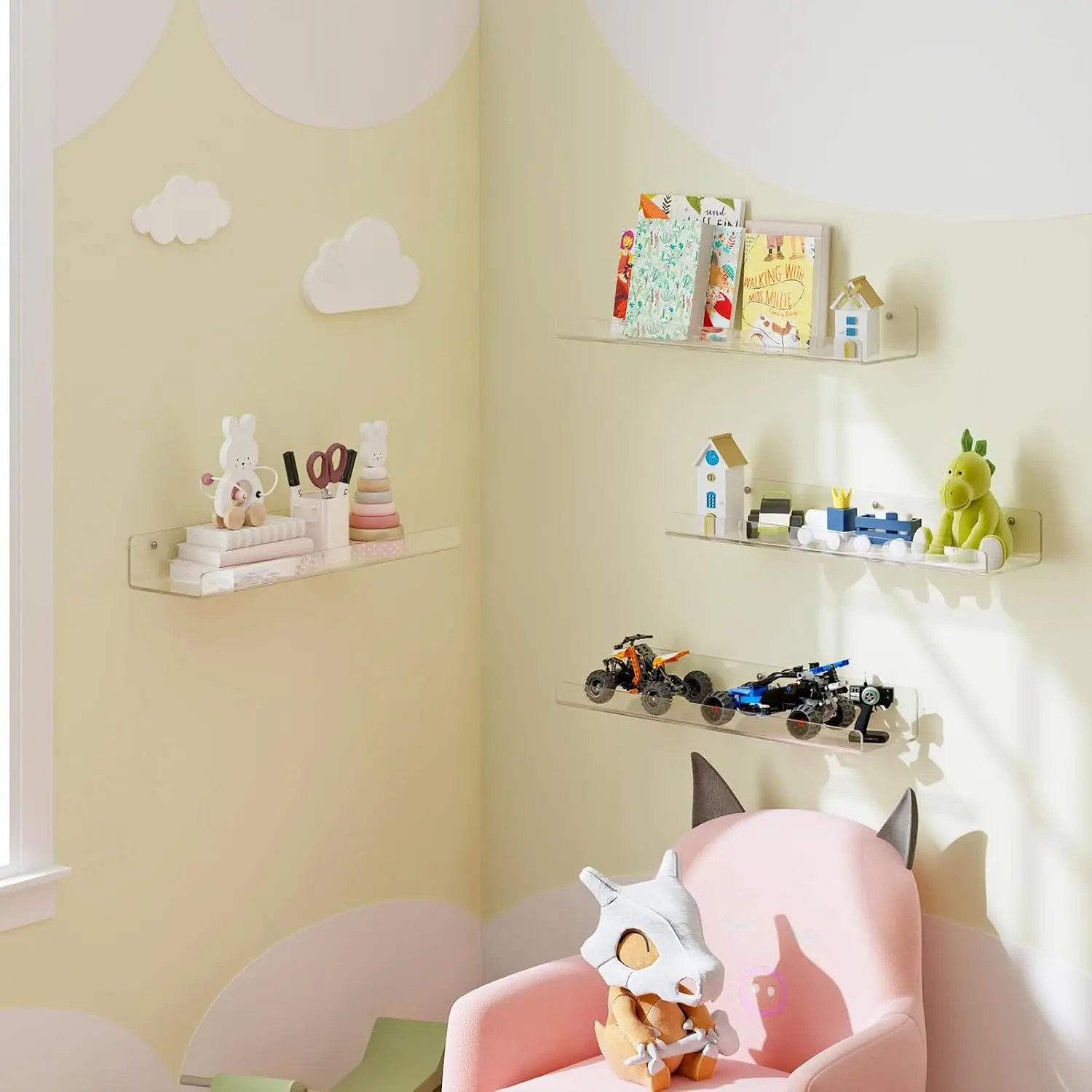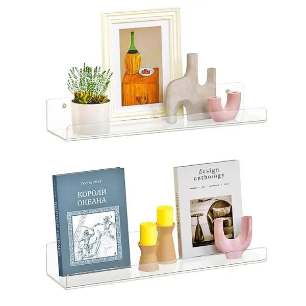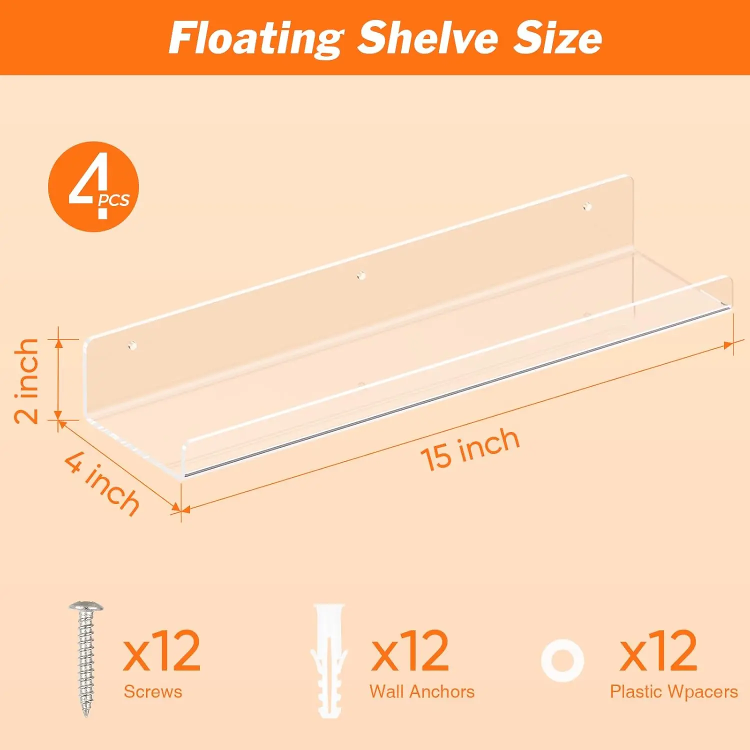Transform your home with these 15” clear acrylic wall shelves. Perfect for bedrooms, bathrooms, and kitchens, these shelves offer a sleek, invisible look. Ideal for organizing books and displaying items, they add a modern touch to any room. A thoughtful gift for home decor enthusiasts.