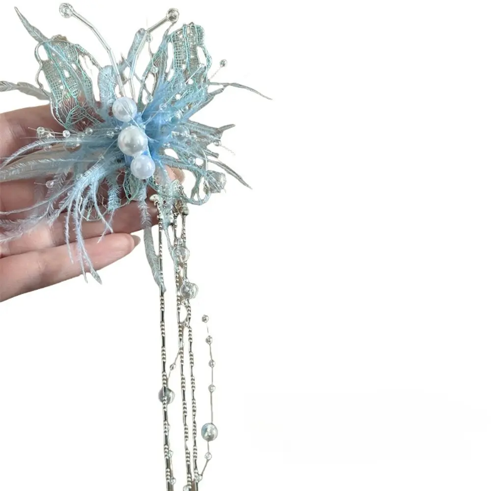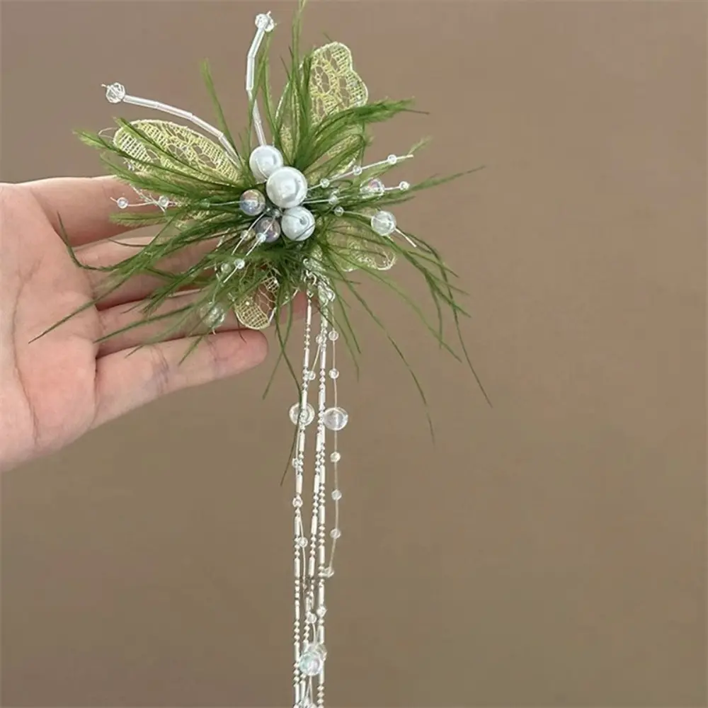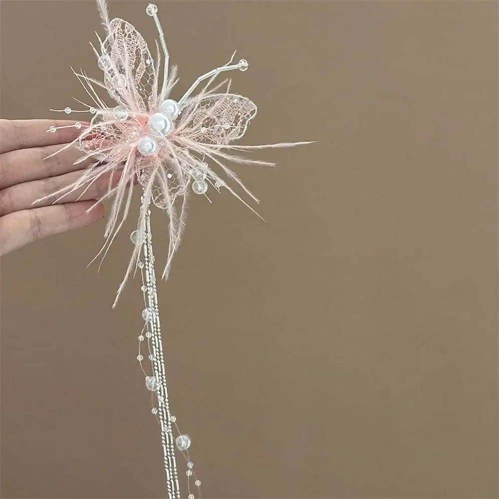 Add ethereal elegance to your hairstyle with this Butterfly Pearl Tassel Hair Clip. It combines delicate butterfly motifs, lustrous pearls and swaying tassels, paired with soft vintage feathers to present a charming blend of Chinese retro aesthetics and fairy-like glamour.