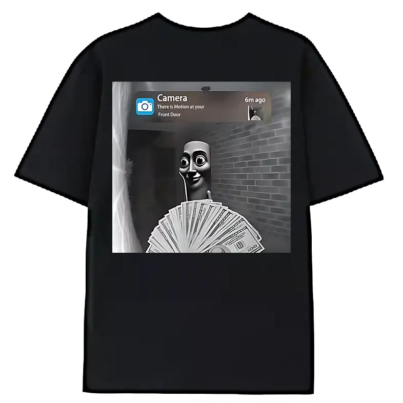 100% Premium Cotton T-shirt Funny Sahur Motion at Your Front Door Meme Graphic T-Shirt - Black Casual Loose Fit Round Neck Tee with Humorous Money & Brick Wall Design for Festive Roleplay & Casual Attire,