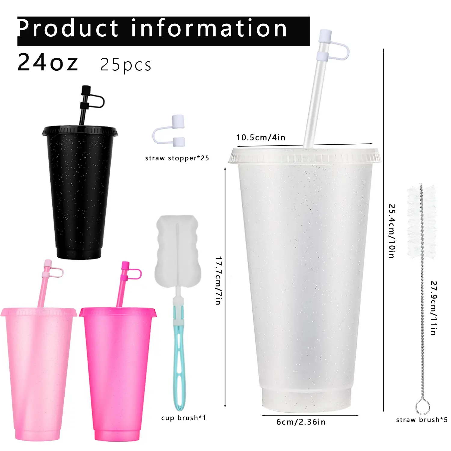 Elevate your spring events with this 25-pack of frosted glitter plastic cups. Each reusable tumbler features a sparkling finish, dust cap, straw, and complete cleaning kit (cup brush, straw brushes)—perfect for Easter parties, spring weddings, or bulk hydration. Shimmering effect adds festive glamour. Dust caps keep straws clean during travel. Lightweight design fits most car cup holders.