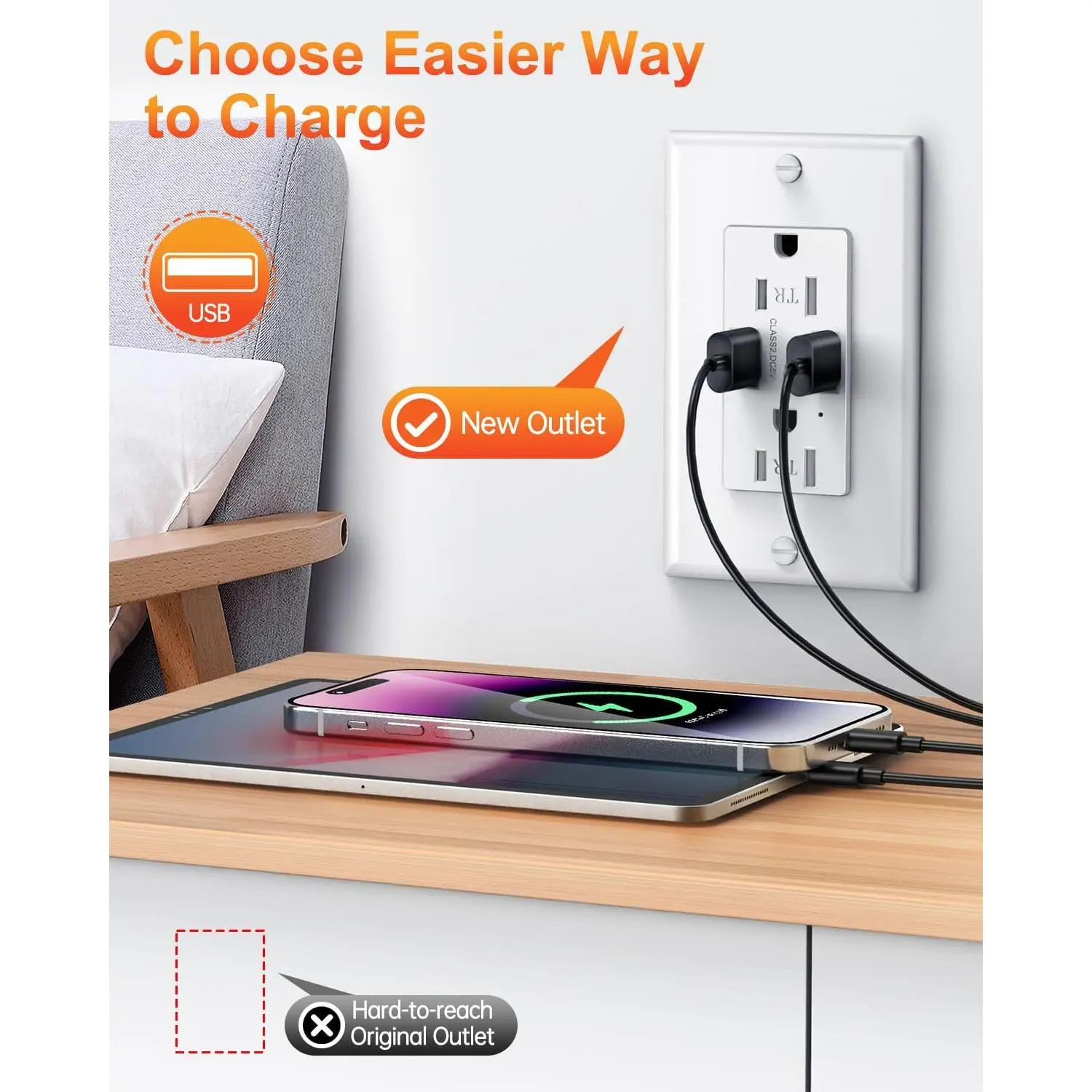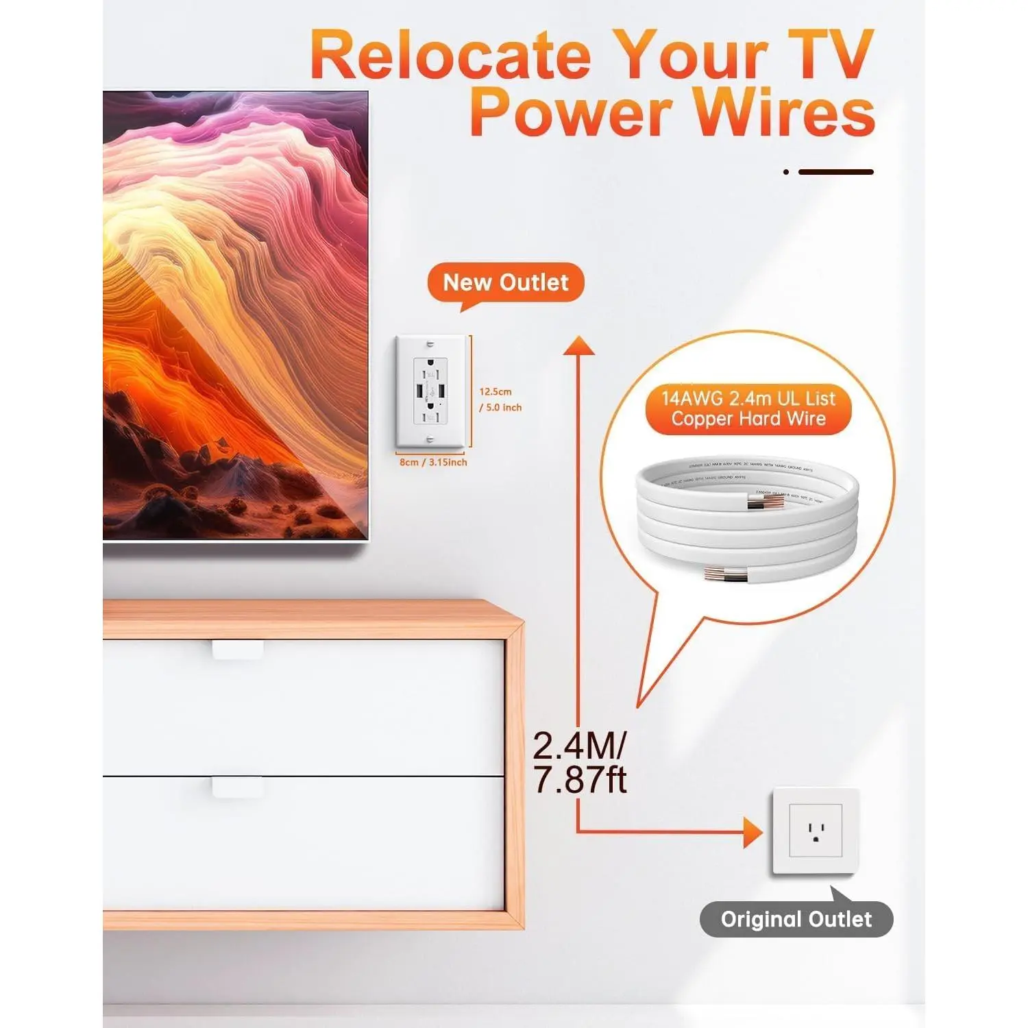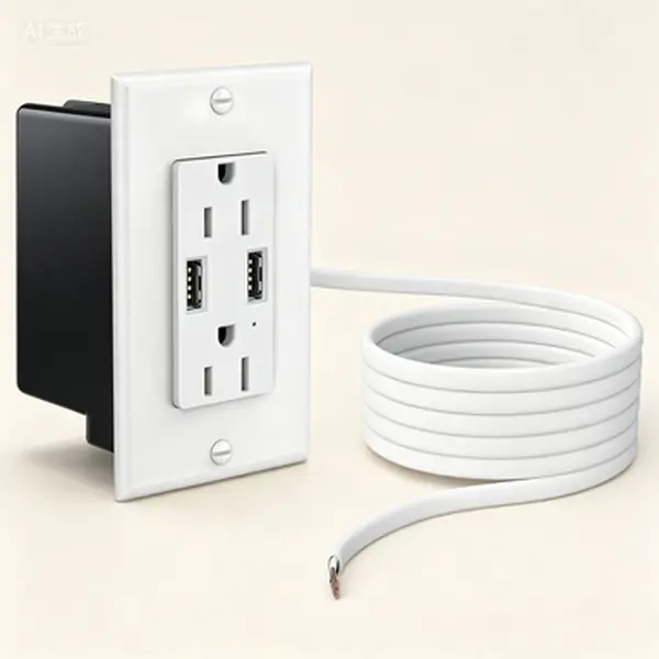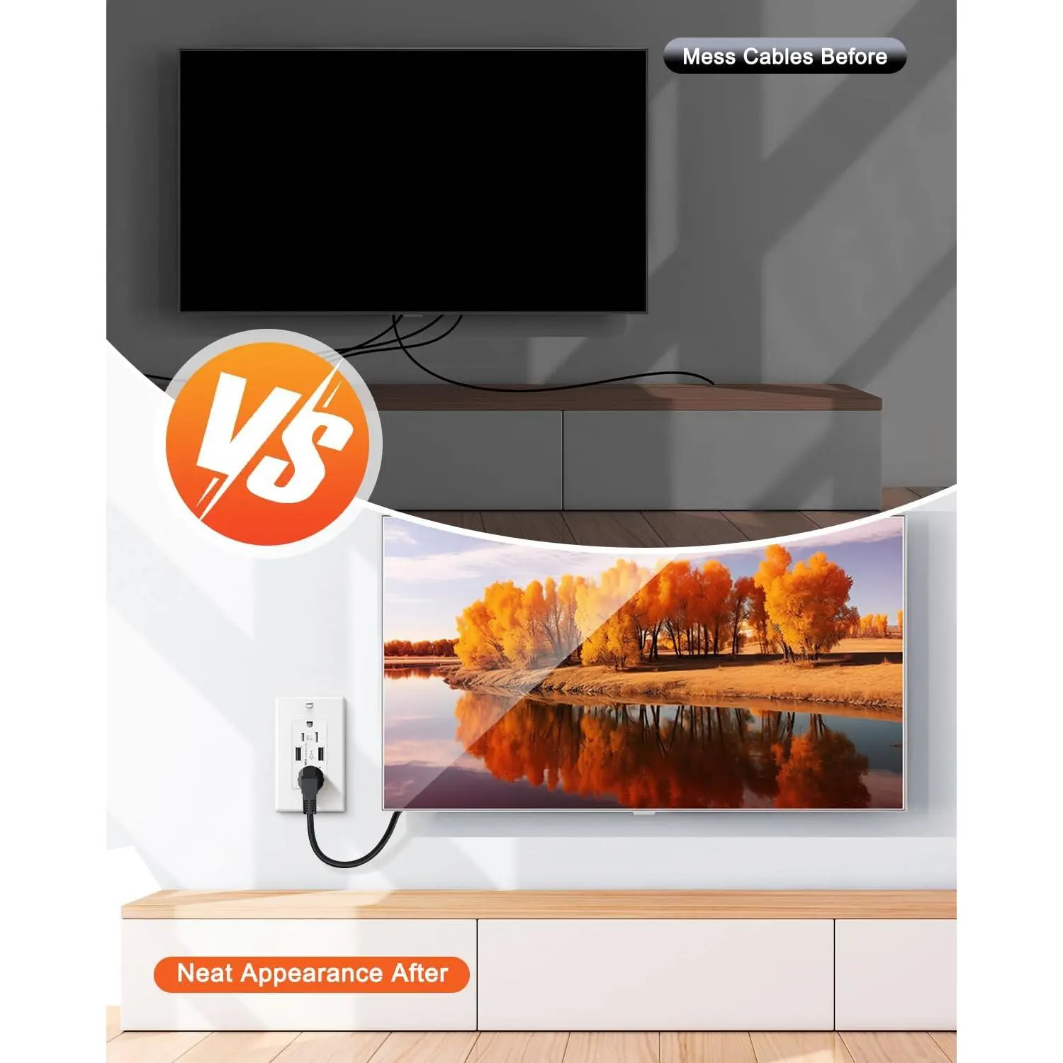 [8 Feet Hardwired & In-Wall Wiring]:The USB wall socket extends power from an existing outlet to a new outlet in your preferred location with 8 feet of cord, neatly arranged behind the wall for easier access to power without the clutter of visible wires.