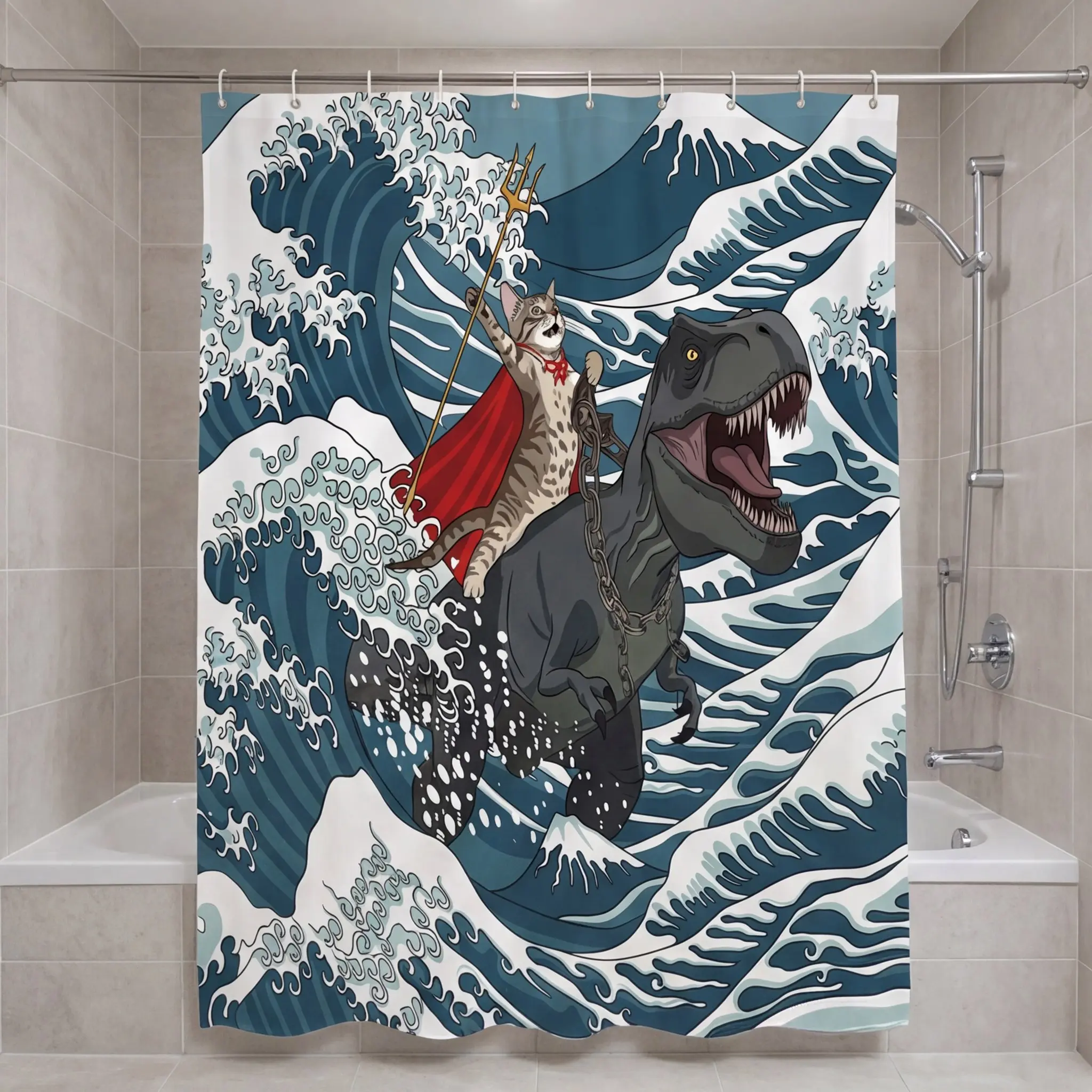 Funny Cat Dinosaur Shower Curtain, Ukiyo-e Japanese Wave with Super Cat Riding Tyrannosaurus, 72" x 72" Durable Mildew Resistant Bath Curtain Set