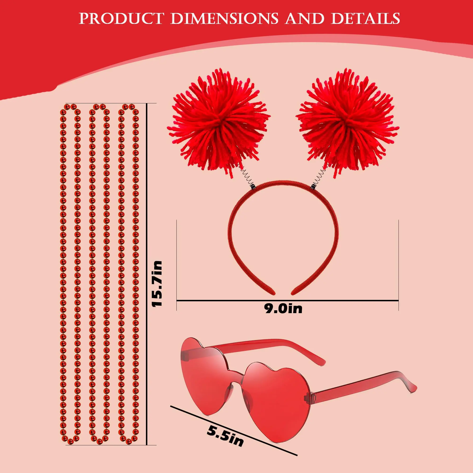 【Red Tutu Set】You will get 1 set of Red Tutu accessories containing a Pom Pom Headband, a Heart Shape Sunglasses, a Tutu Skirt and three bead necklaces, which will bring you the happiness of Mardi Gras party easily.