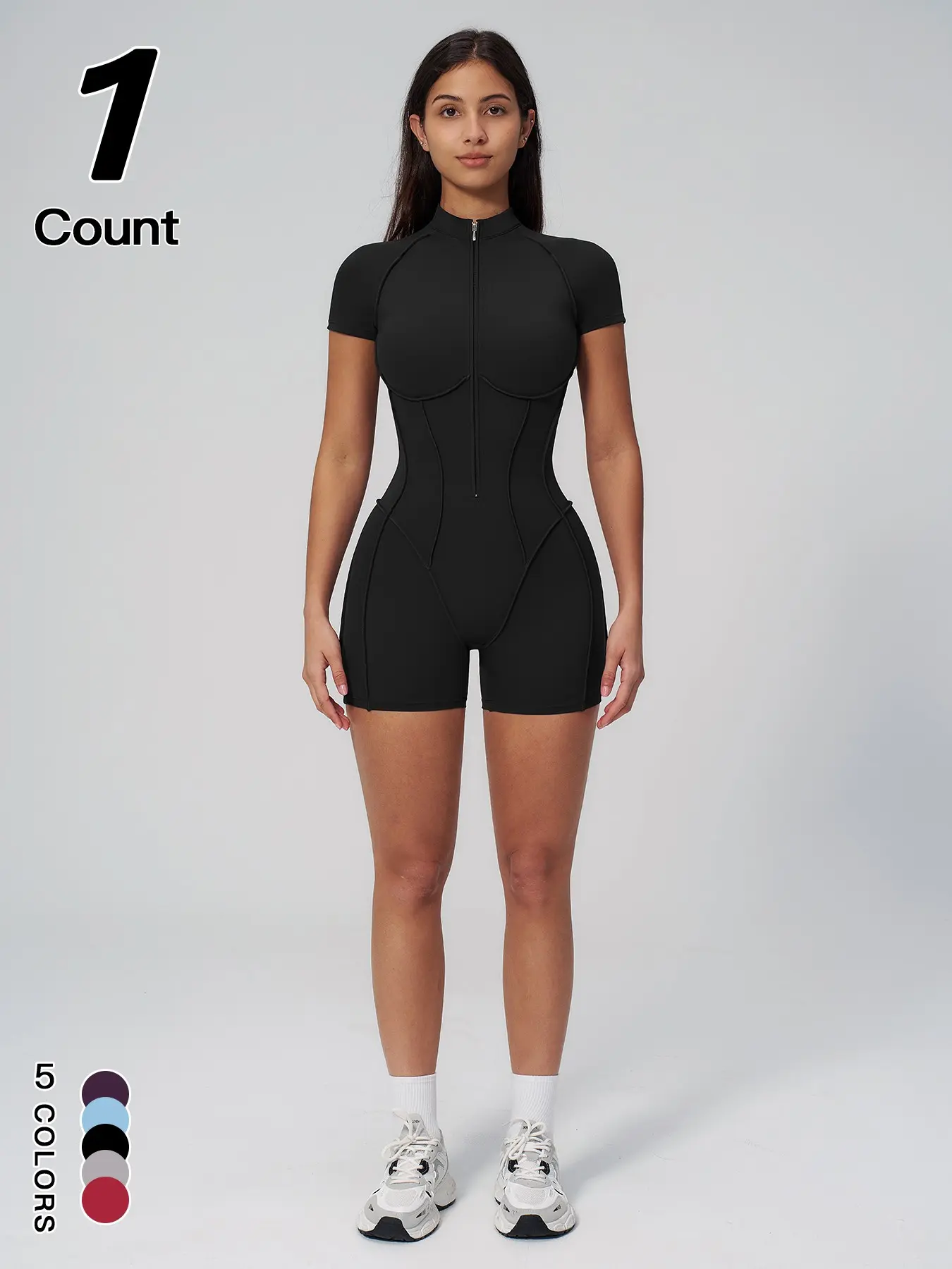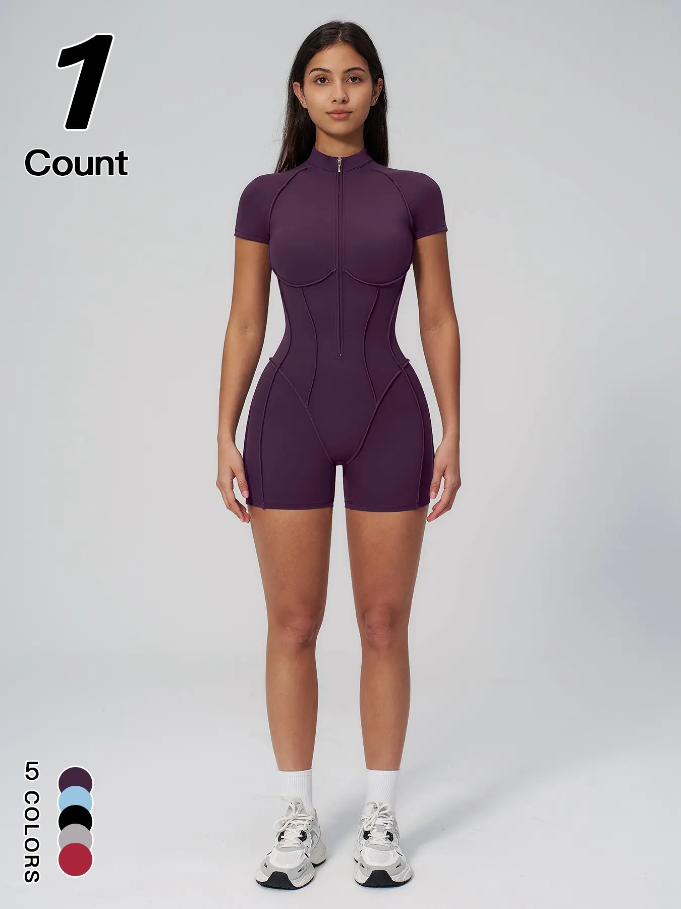 Women's Sportswear Half-Zip Stand Collar Shapewear Jumpsuit, Casual Slim-Fitting Short Sleeve Jumpsuit for All Seasons