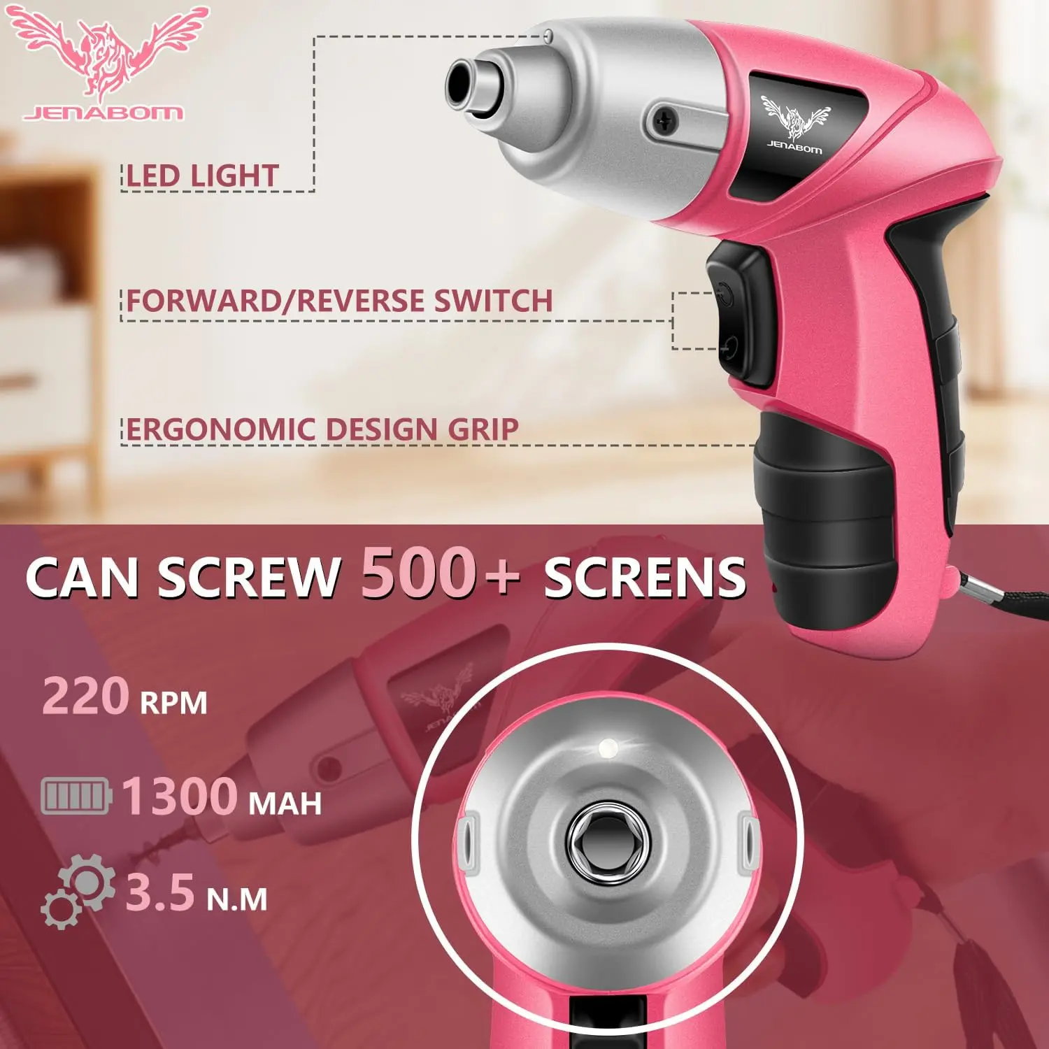 [Pink Cordless Screwdriver with LED]The 3.6V Power Cordless Srewdriver can be used for tightening/loosening screws.Equiped with built-in LED light, and the net weight of the hand power screwdriver is only 250g, and it is easy to operate with one hand.
