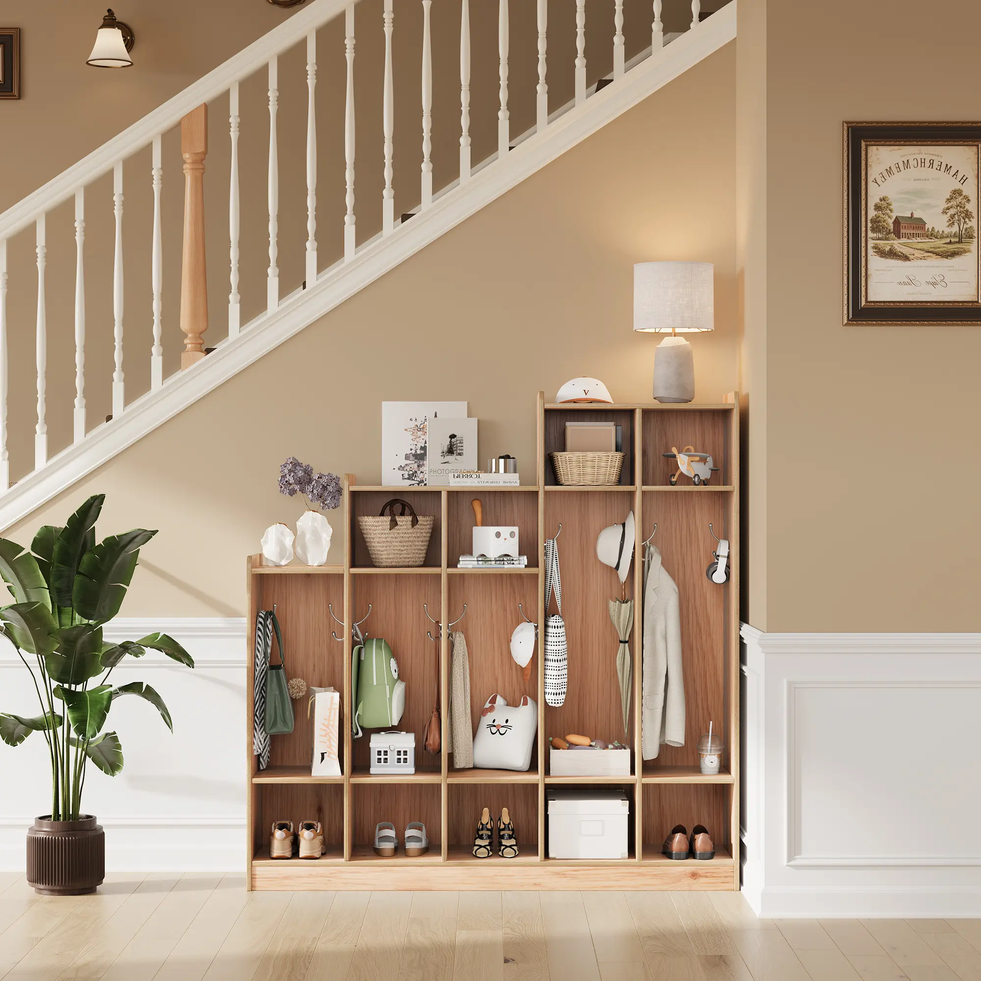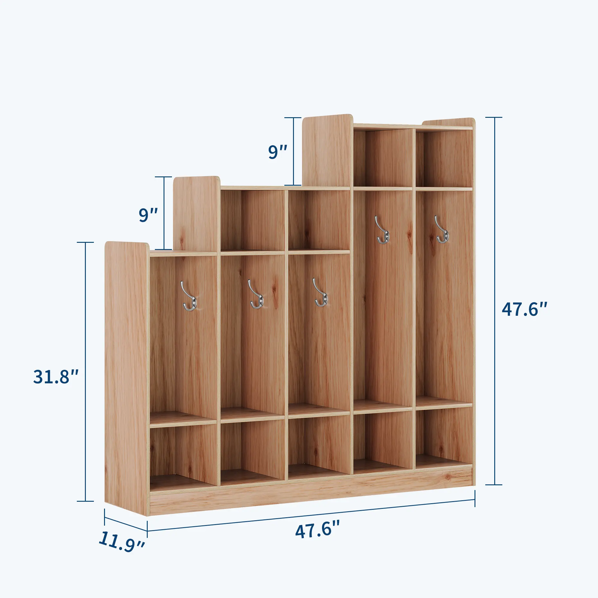 Storage design: 5 sections, 9 cubbies, 10 double hooks