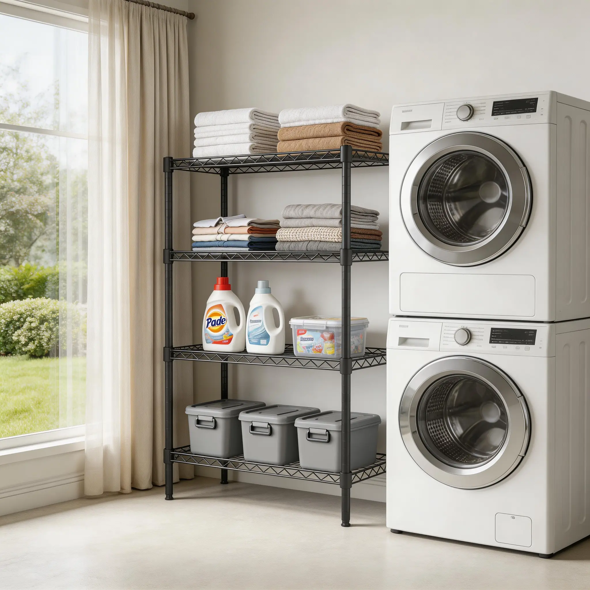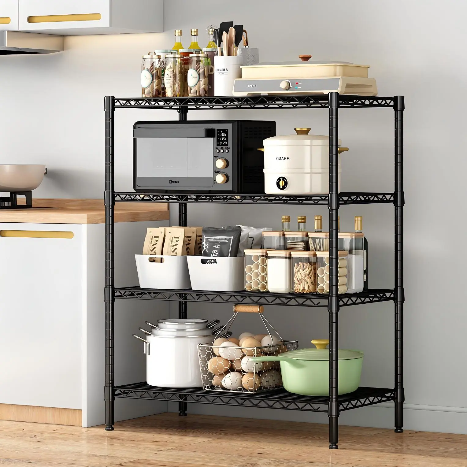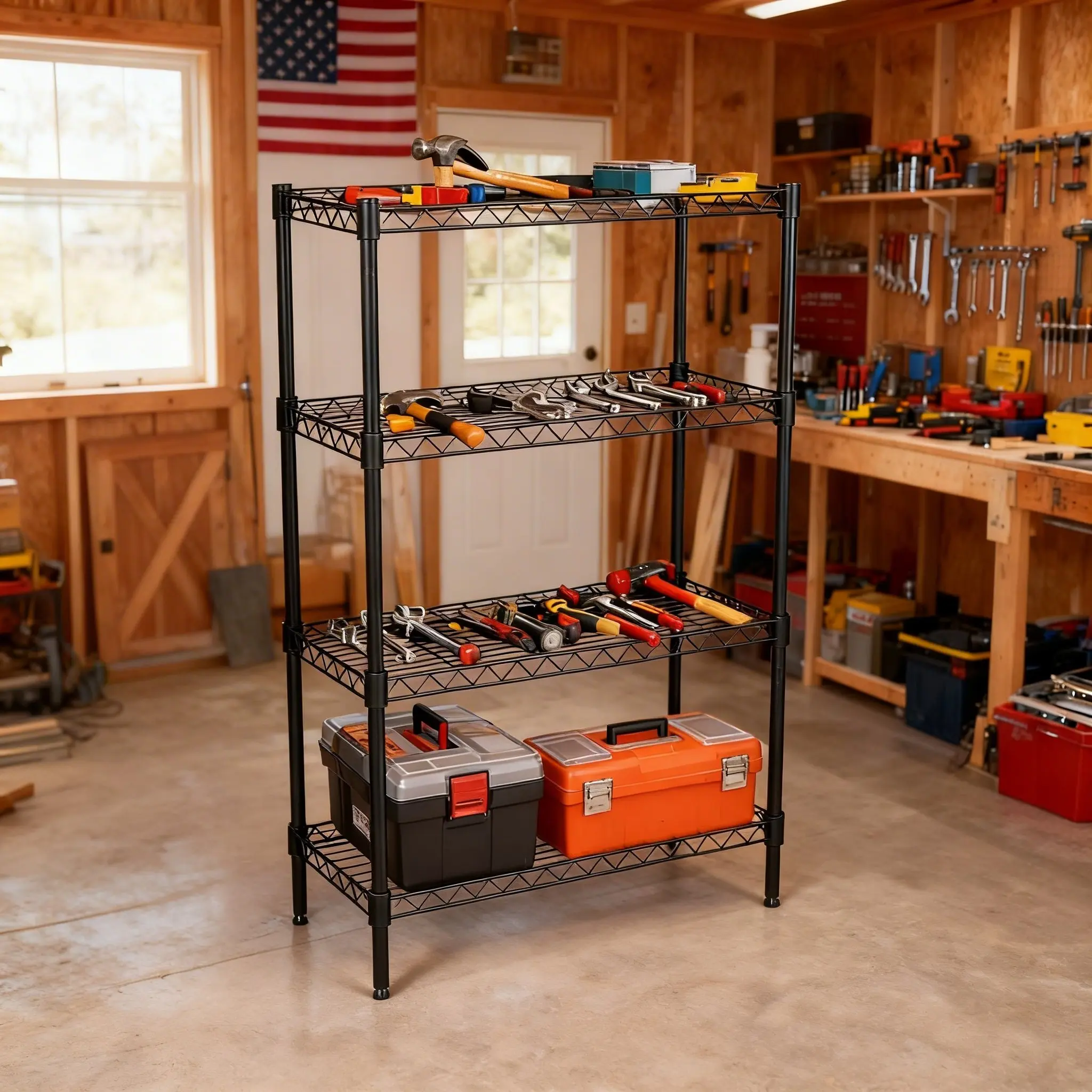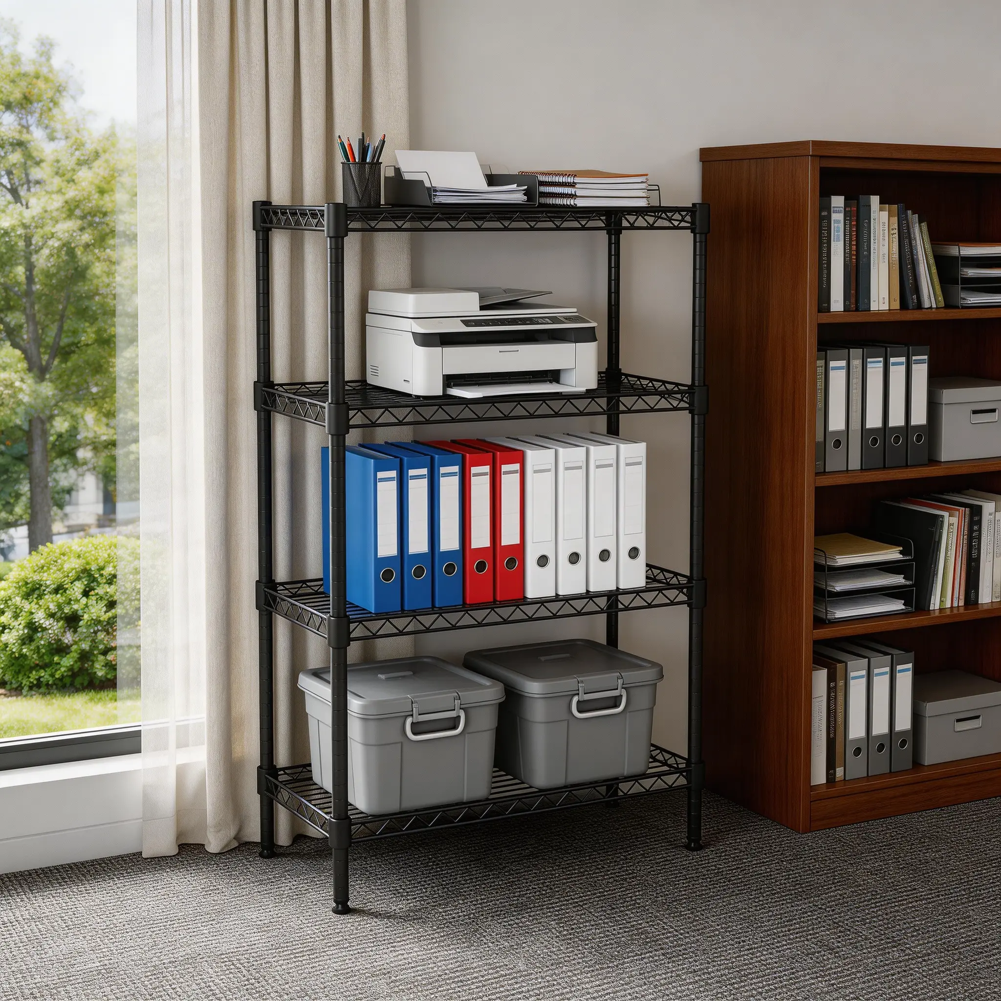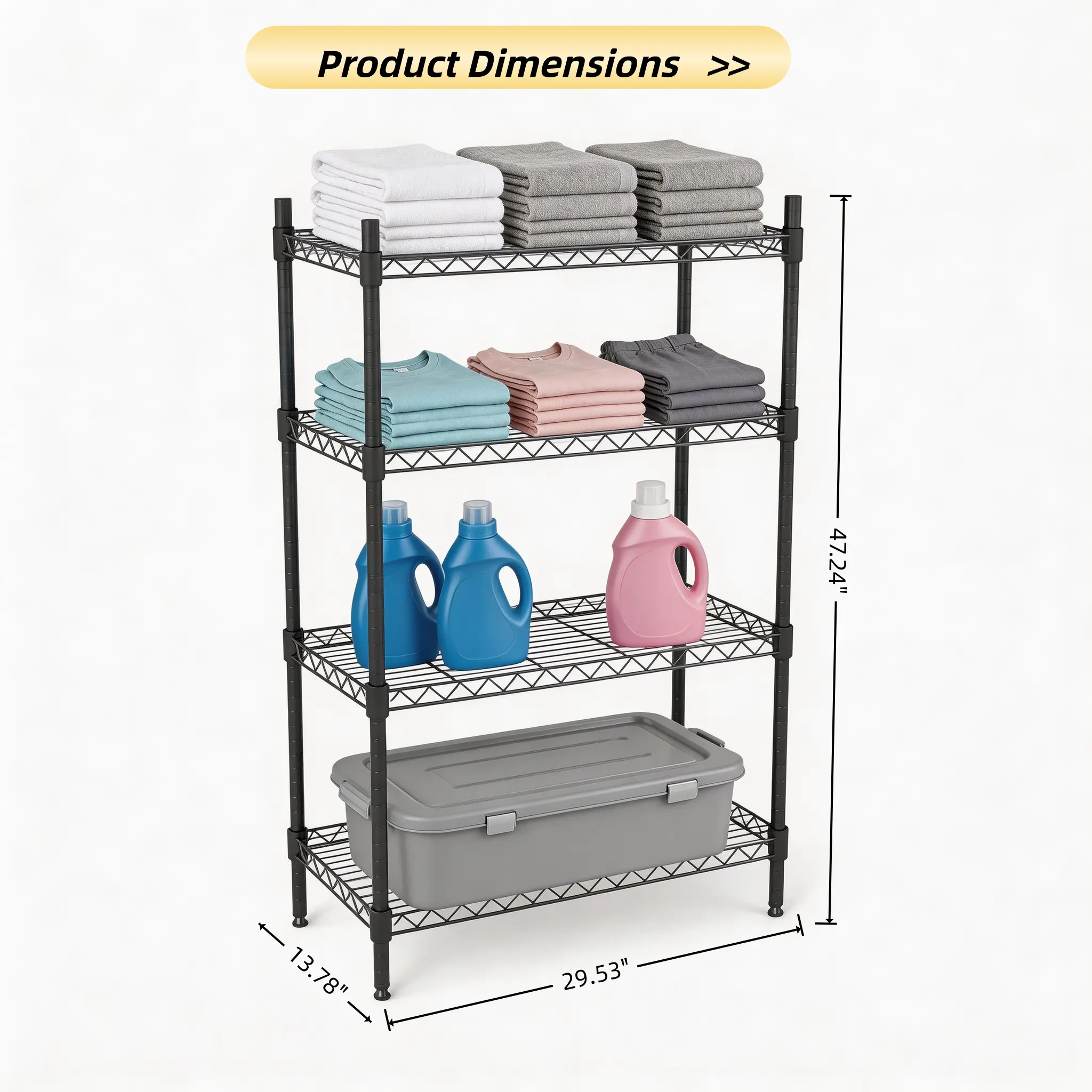 ·This 4 tier metal storage shelf is carefully crafted from heavy-duty steel, ensuring durability. It features a vertical support rod with a diameter of 7.48 inches, paired with a sturdy metal frame made of metal , ensuring excellent strength and stability. Its compact overall dimensions of 29.53 inches (length) x 13.78 inches (width) x 47.24 inches (height) make it suitable for placement in any corner or space, save space.