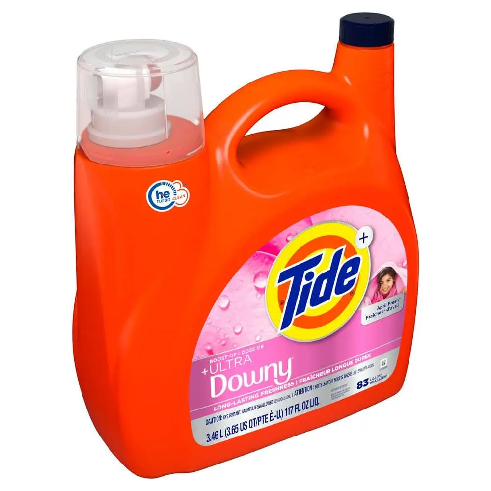 ·Tide + Downy Liquid Detergent cleans and freshens.