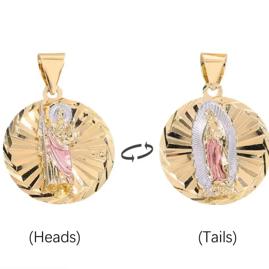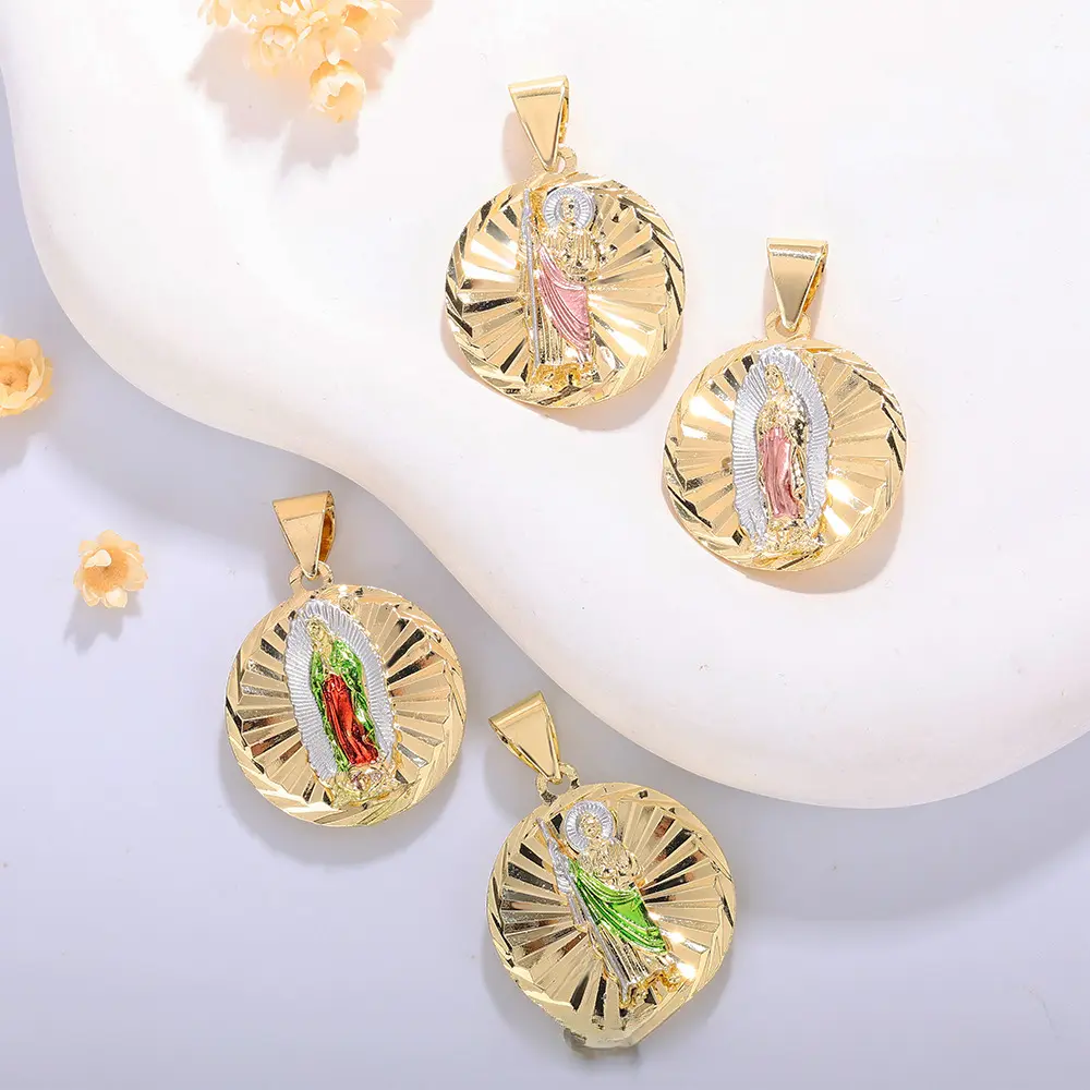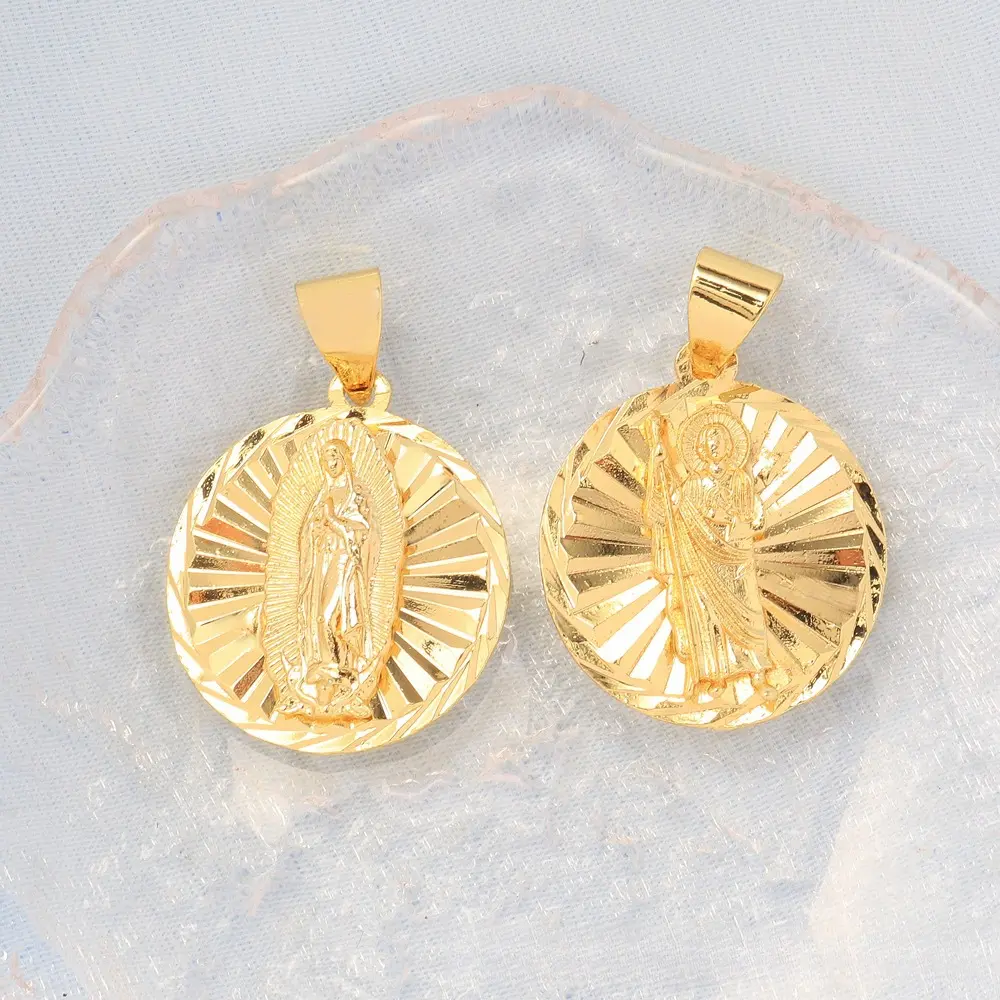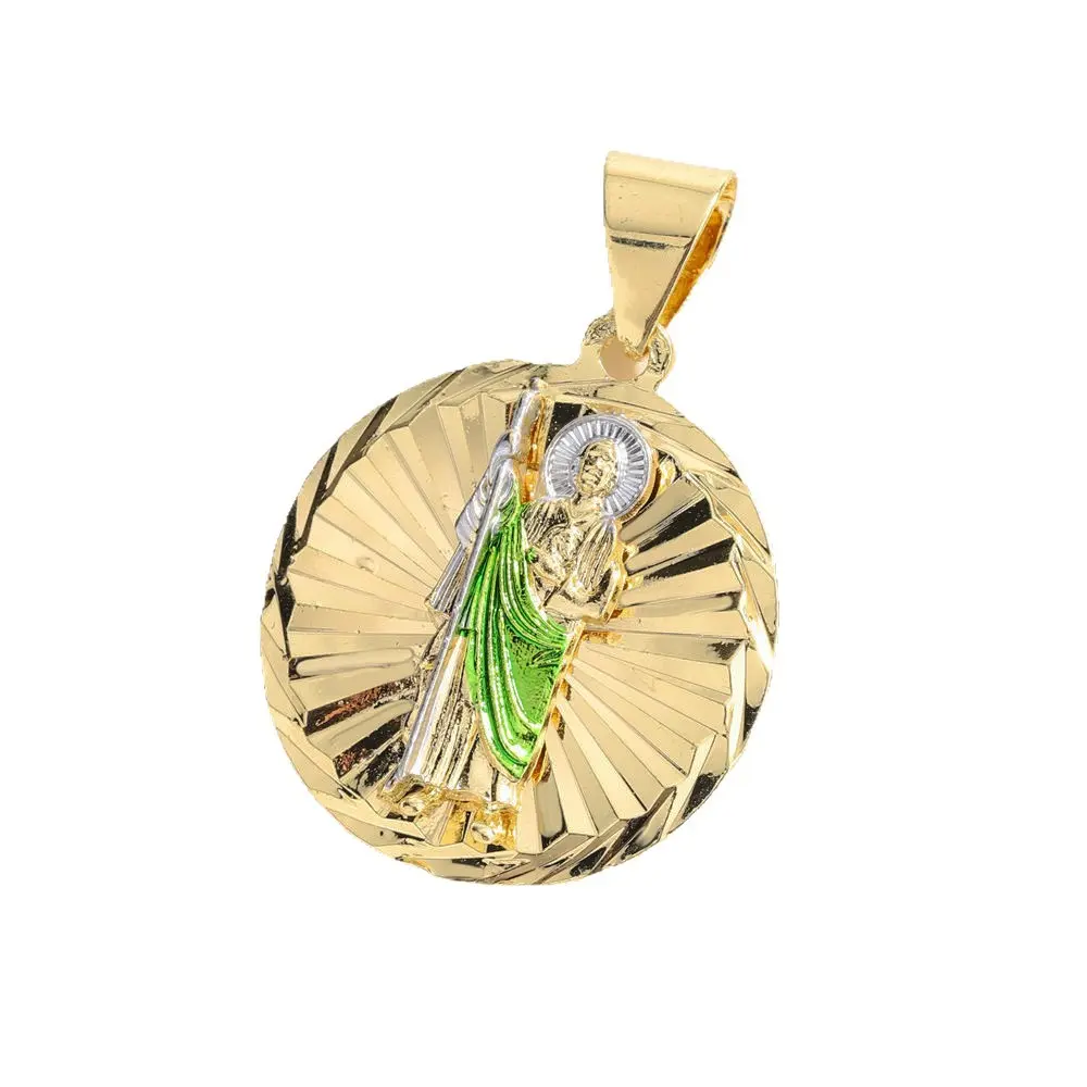 14K gold-plated Saint Jude medal pendant, religious Catholic jewelry, featuring green enamel details and a sunburst design. Suitable for both men and women, offering divine protection