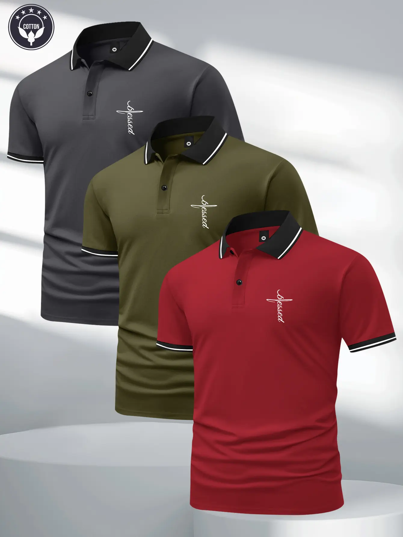 3-pack men’s summer cotton short-sleeve polo shirts with artistic font patterns; classic retro style; lightweight, versatile athletic casual outdoor fashion golf apparel; trendy black short sleeves—the best gift for men.