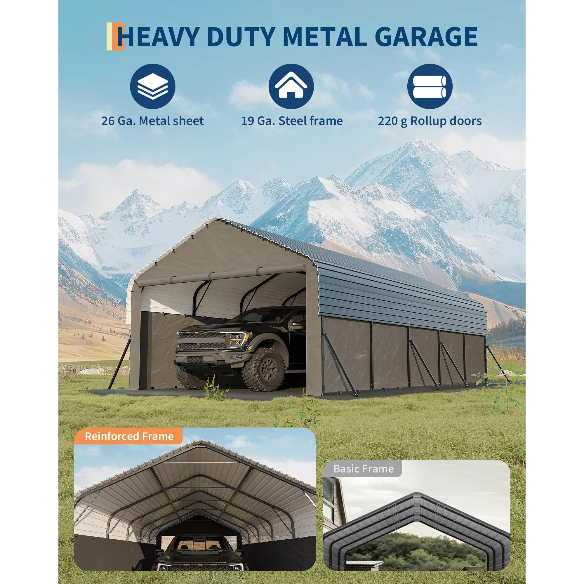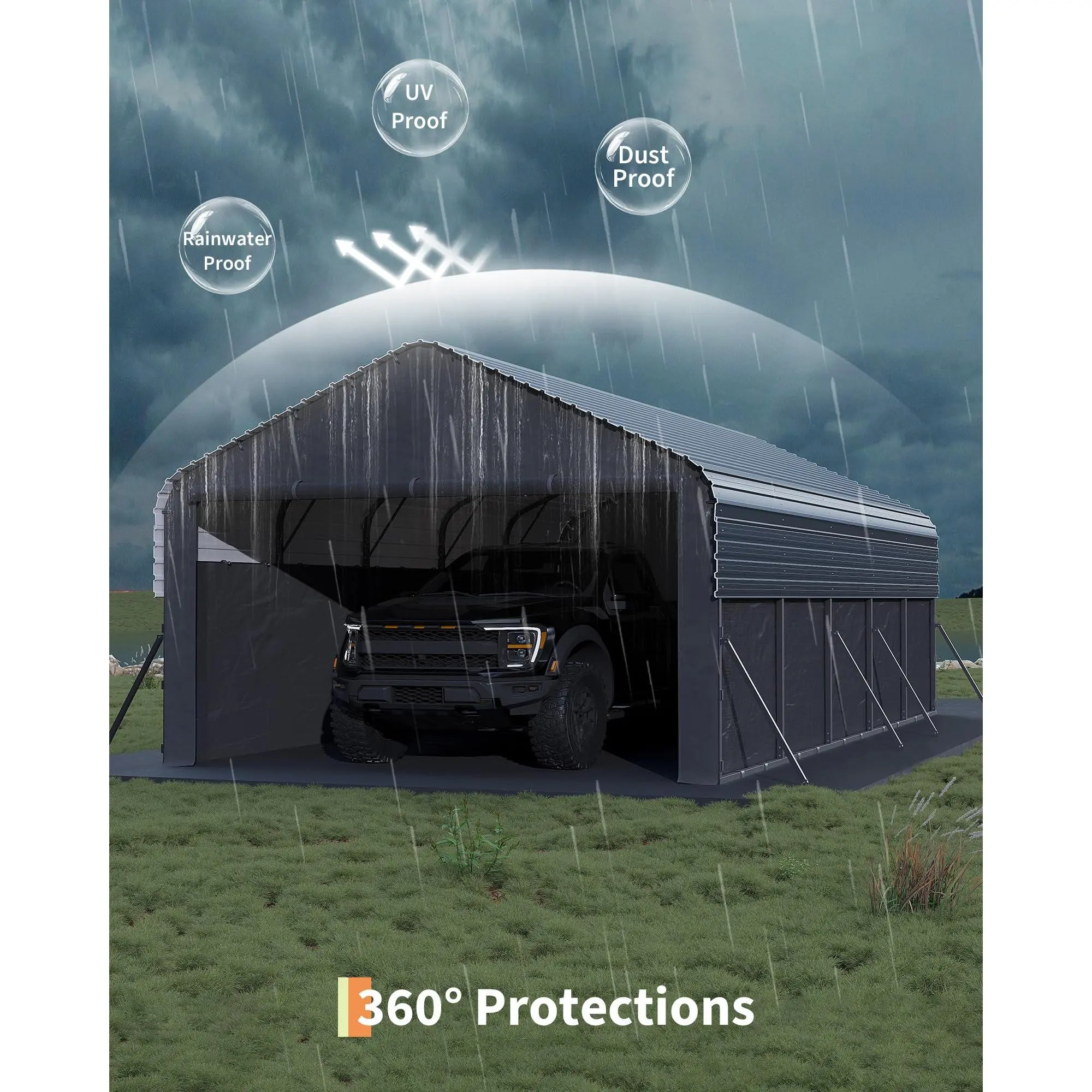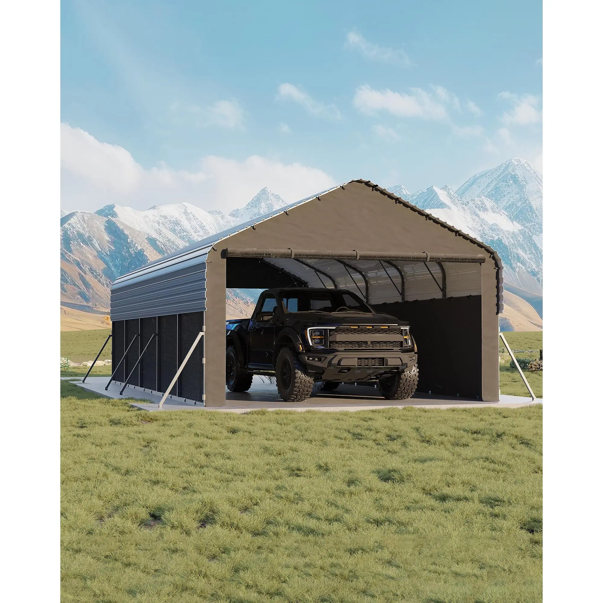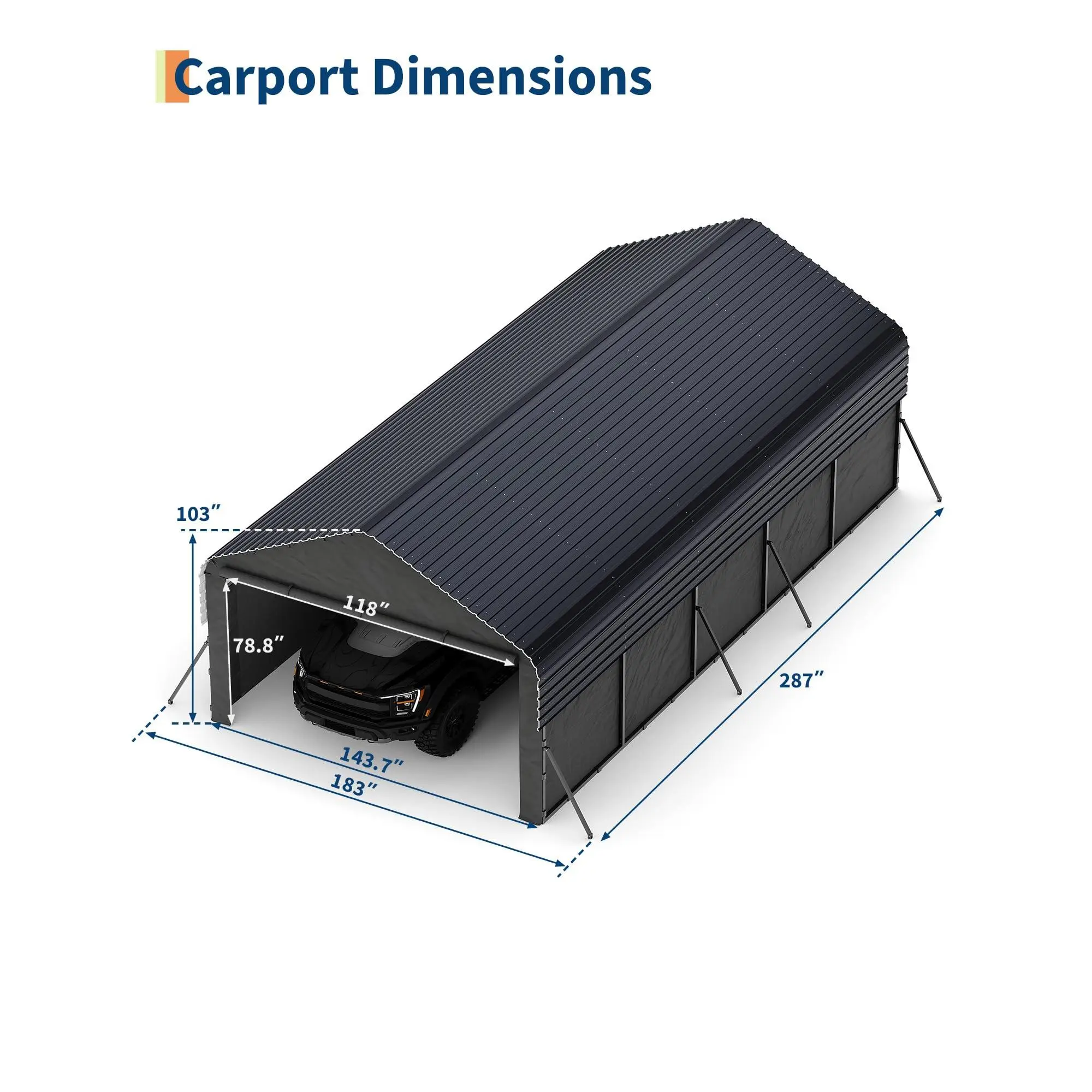 [Ample Space] L x W x H: 287'' x 144'' x 103''; you can easily park a full-sized pickup truck; side height 6'4'' allows you to put a compact trailer or RV inside