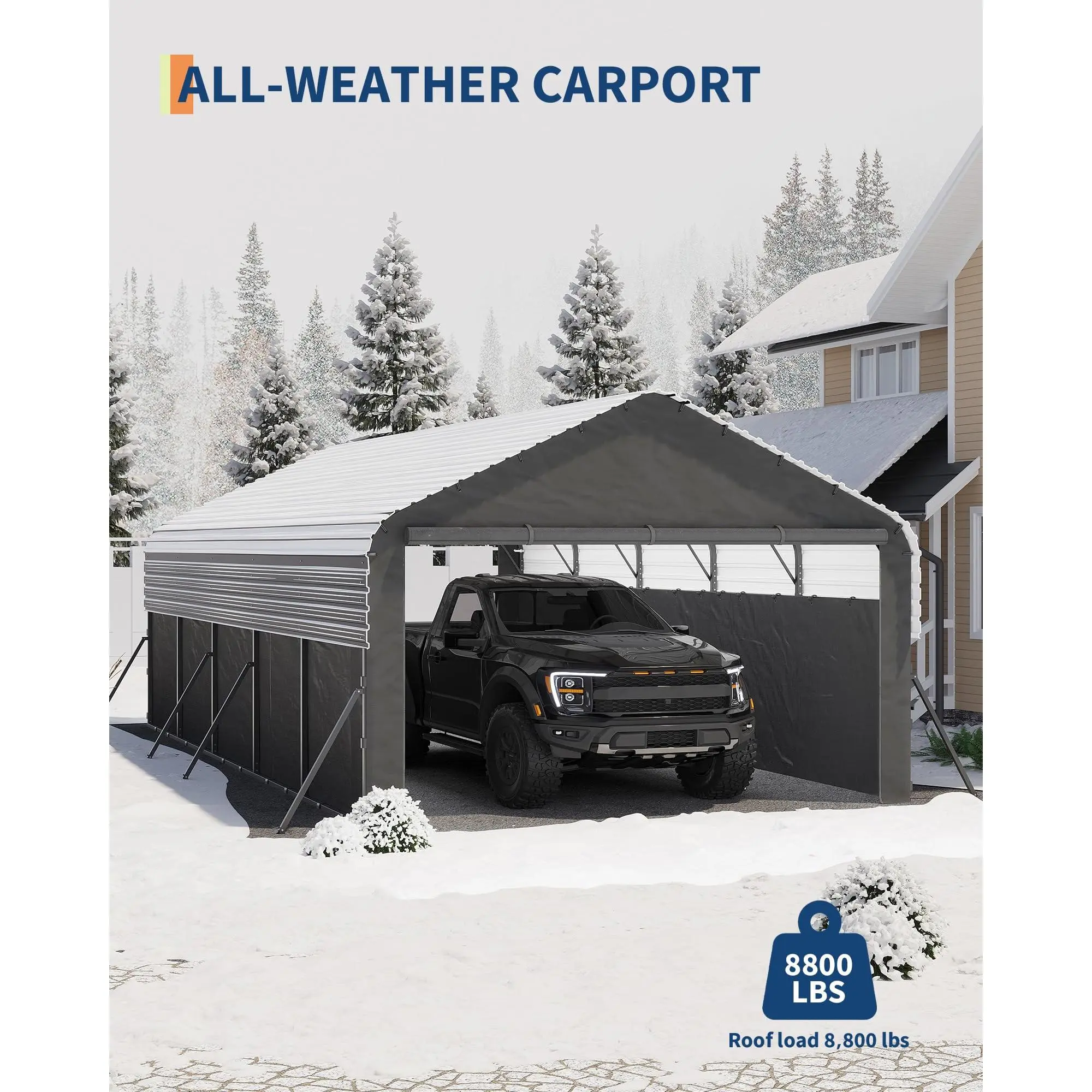 [Built to Last] 130° roof angle design to increase the top load-bearing capacity by 40%(compared to other 160° flat top carports); with multiple roof & side reinforced bars improving anti-high wind performance up to Beaufort 12