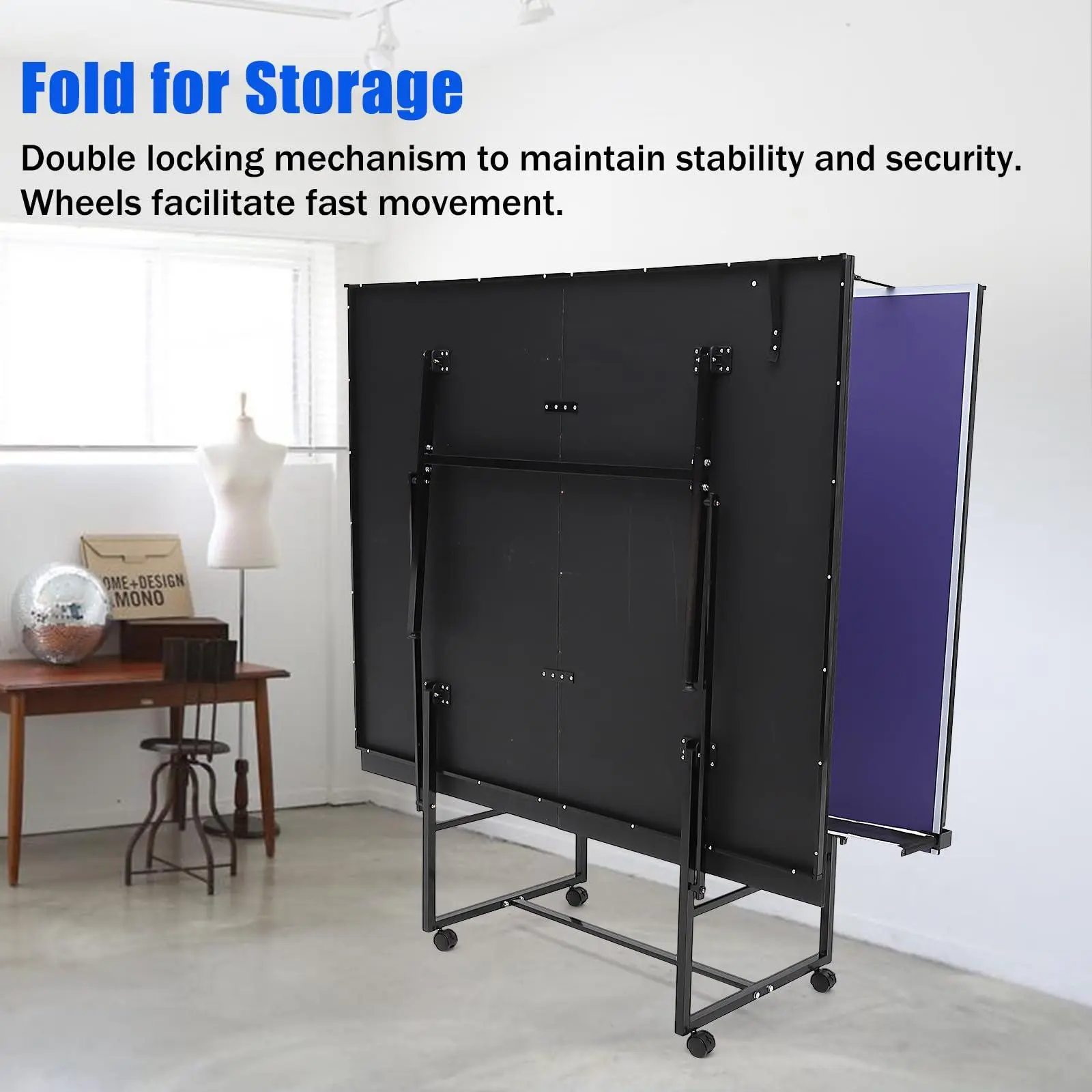 【COMPACT STORAGE】Our table tennis table features a foldable design on each half with a double locking mechanism for effortless storage. Equipped with wheels at the bottom (6 ft/8 ft/9ft), it can be easily moved and securely locked into the storage place or playing field.