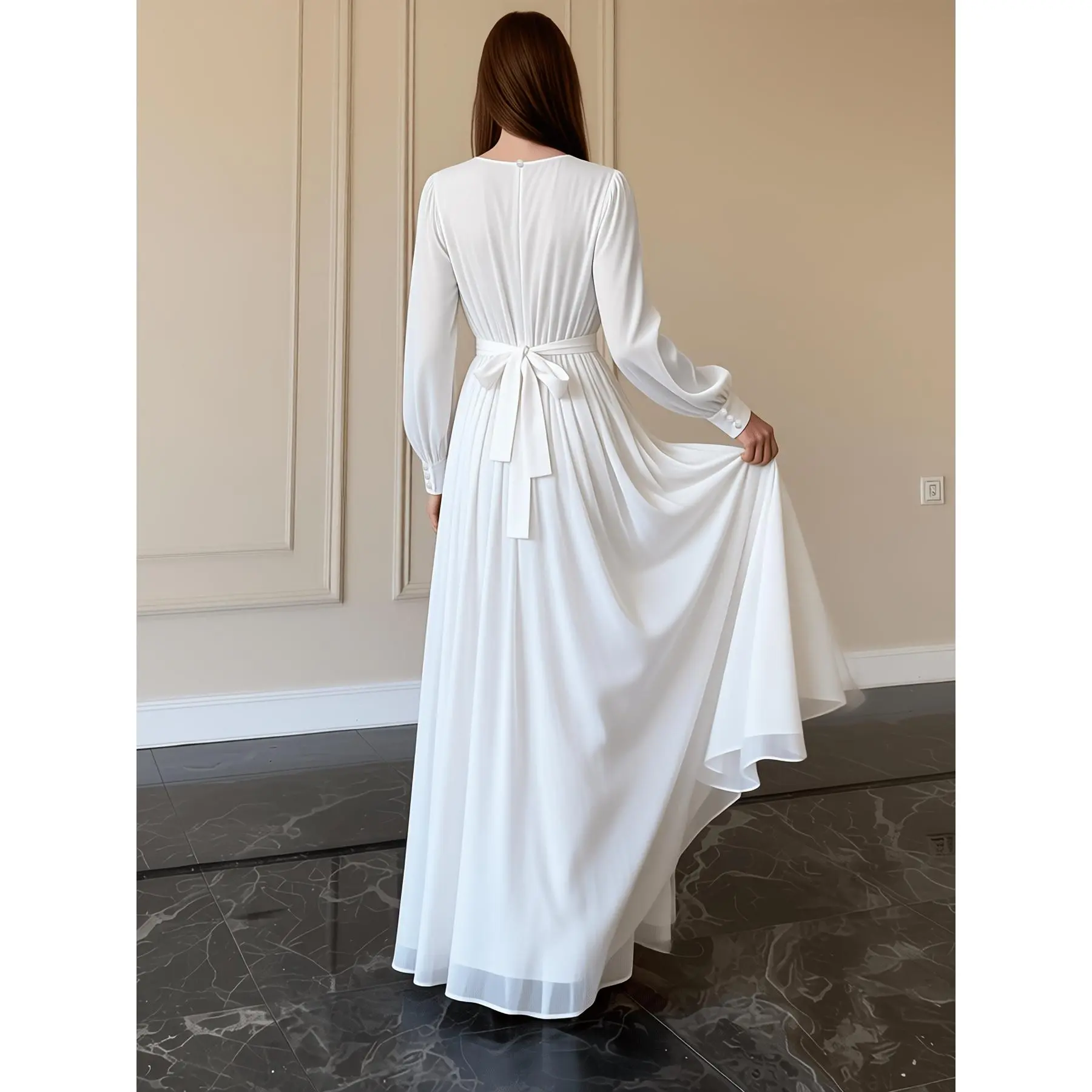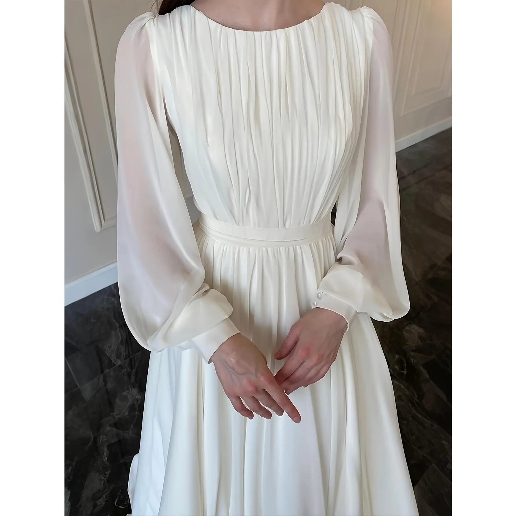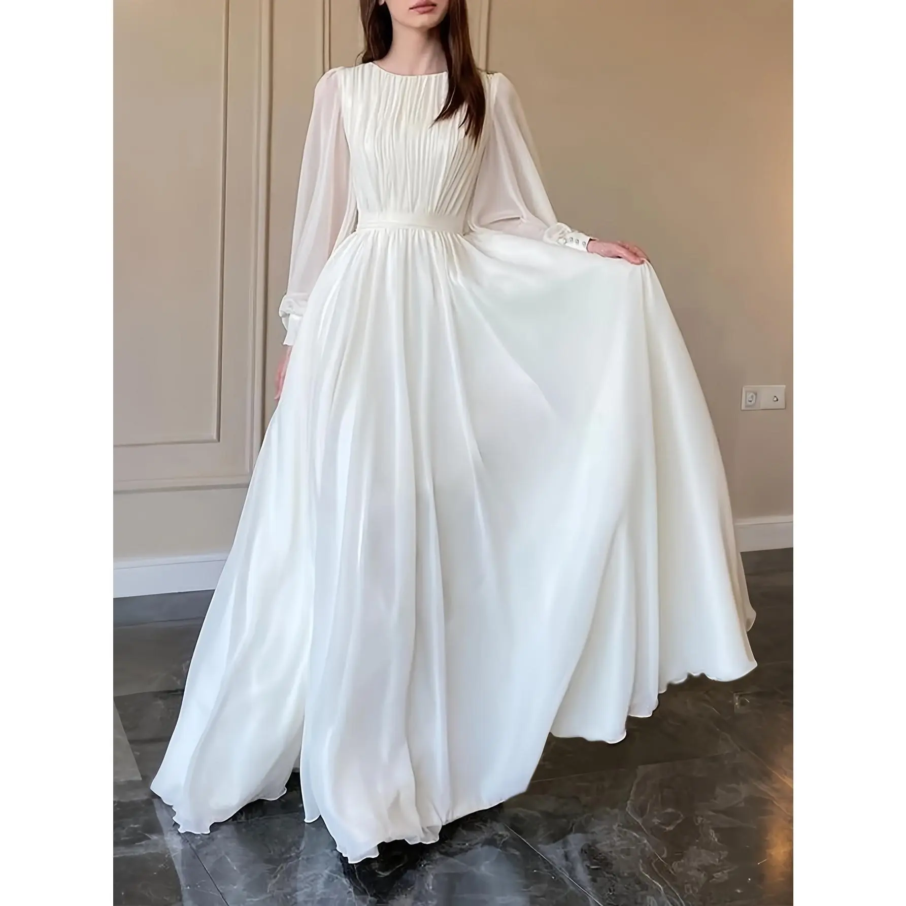 Modest Muslim Maxi Dress, New Arrival Spring Summer, Long Chiffon Sleeve Crew Neck, Pleated Waist Flowy Gown