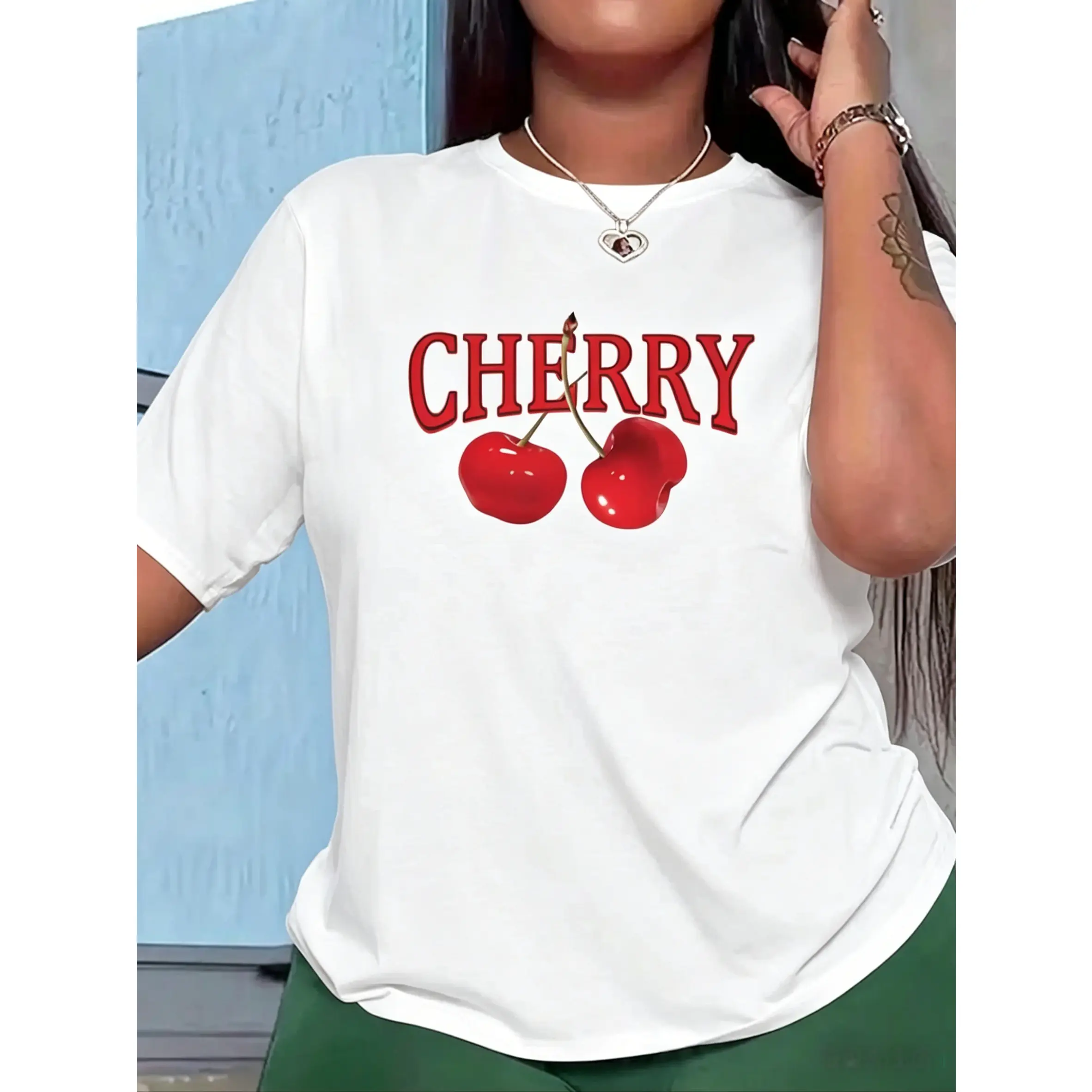 Plus Size Cherry & Letter Print Round Neck Tee, Trendy Casual Short Sleeve Crew Neck T-Shirt for Summer, Women's Plus Clothing for Daily Wear