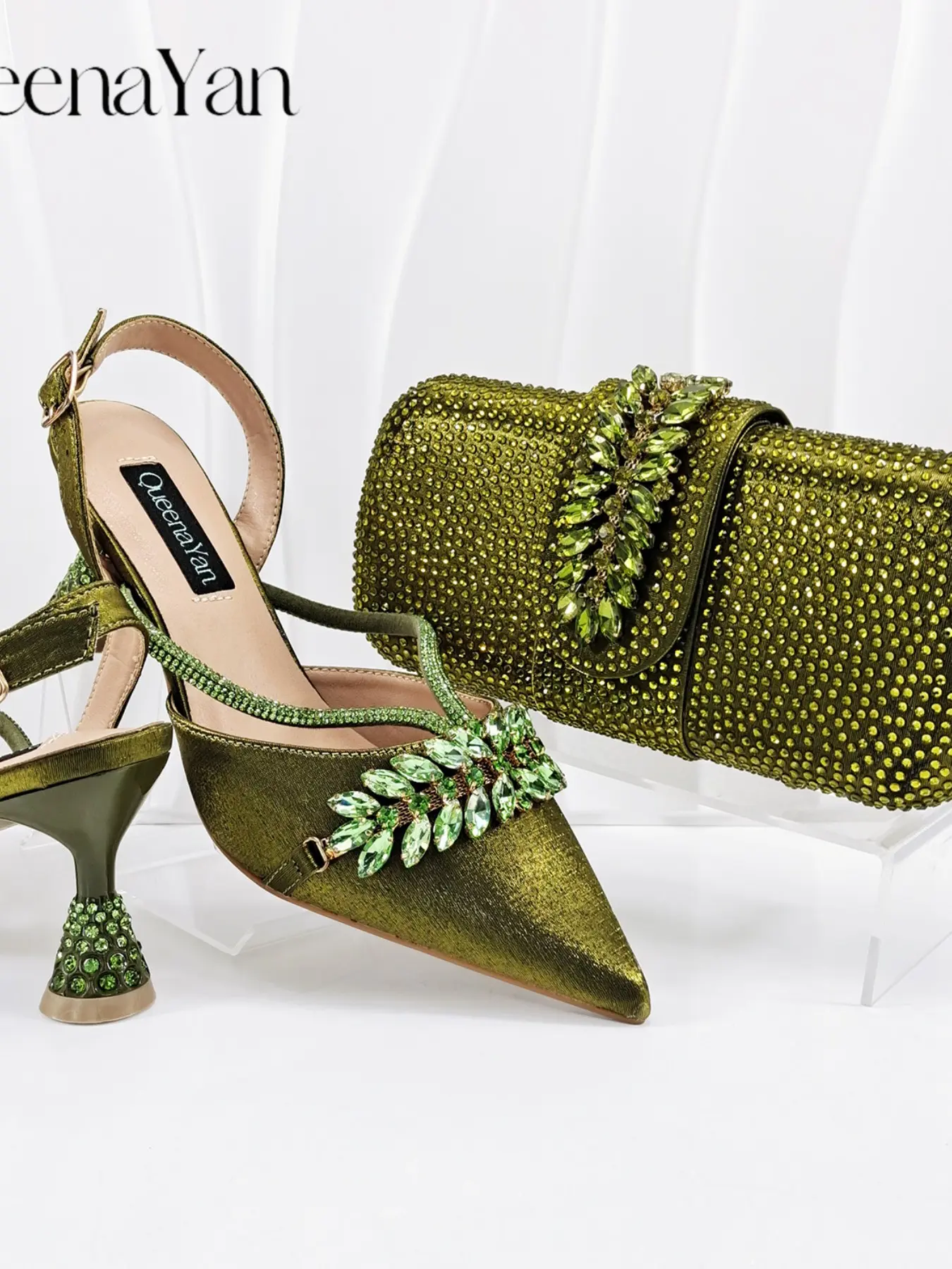 2026 New Designer Fashion Open-Toe High Heels, Elegant Party Olive Color Diamond Decorated Slip-On Shoes, Italian Shoe Bag Set