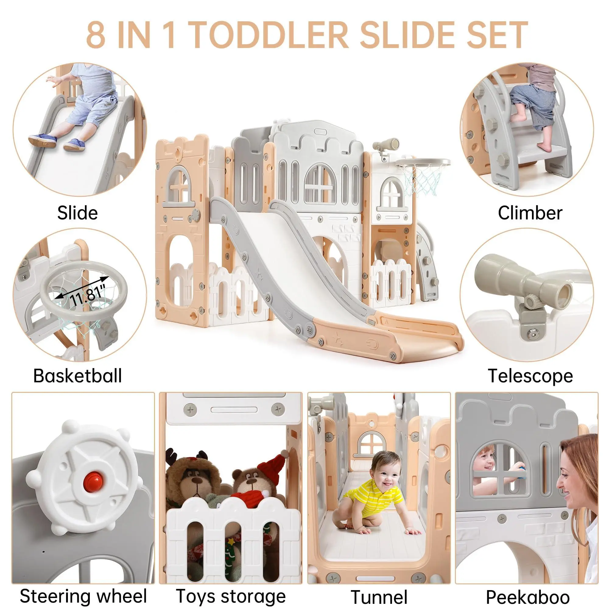 Indoor & Outdoor Use :This 8 in-1 slide designed for toddlers aged 1-3 is simple to assemble and easy to move, making it ideal for both indoor and outdoor play. Its space-saving size fits perfectly in kids’ playrooms, daycares, backyards, and even living rooms.