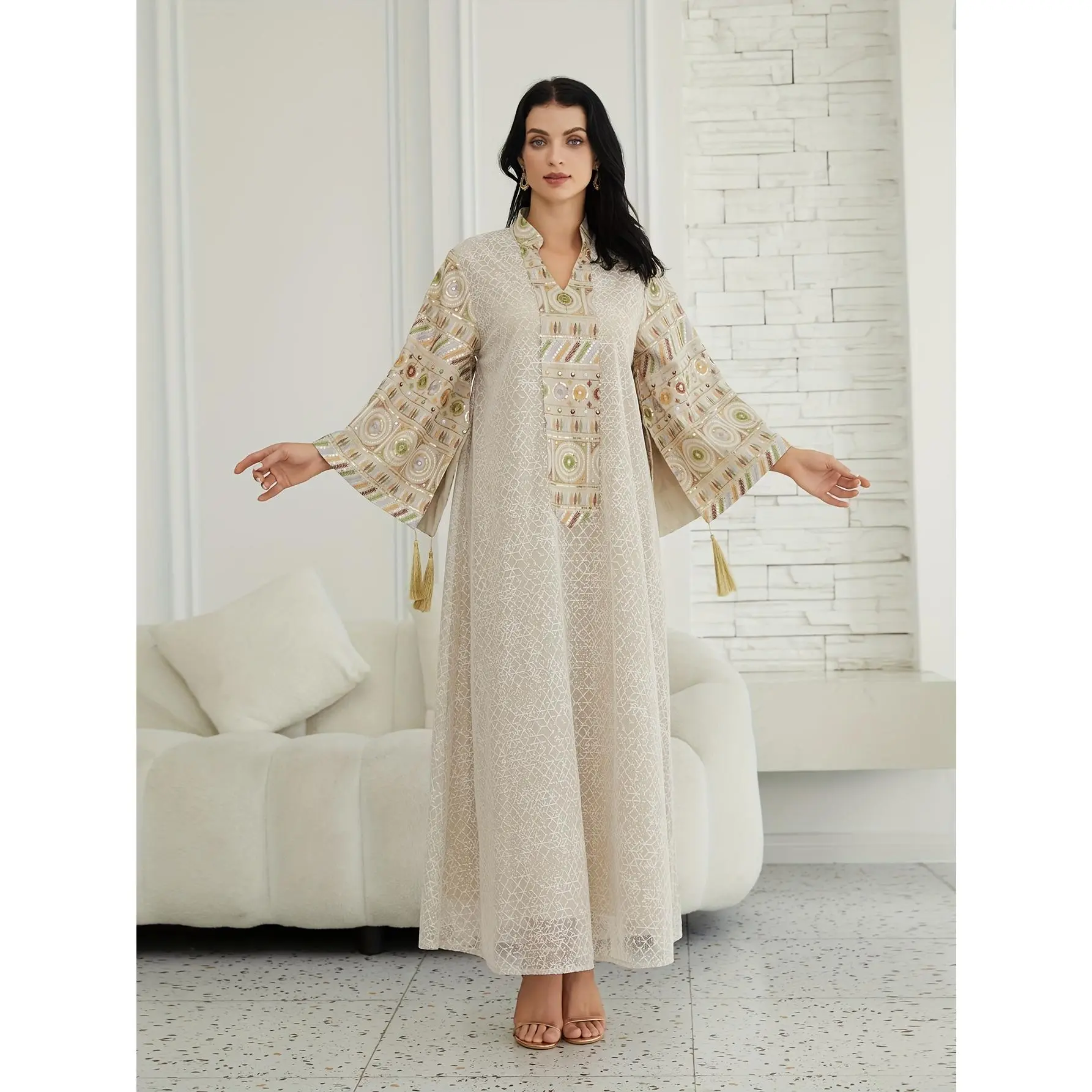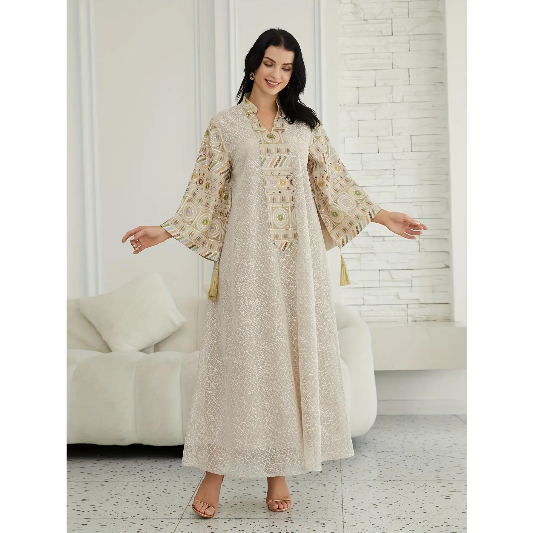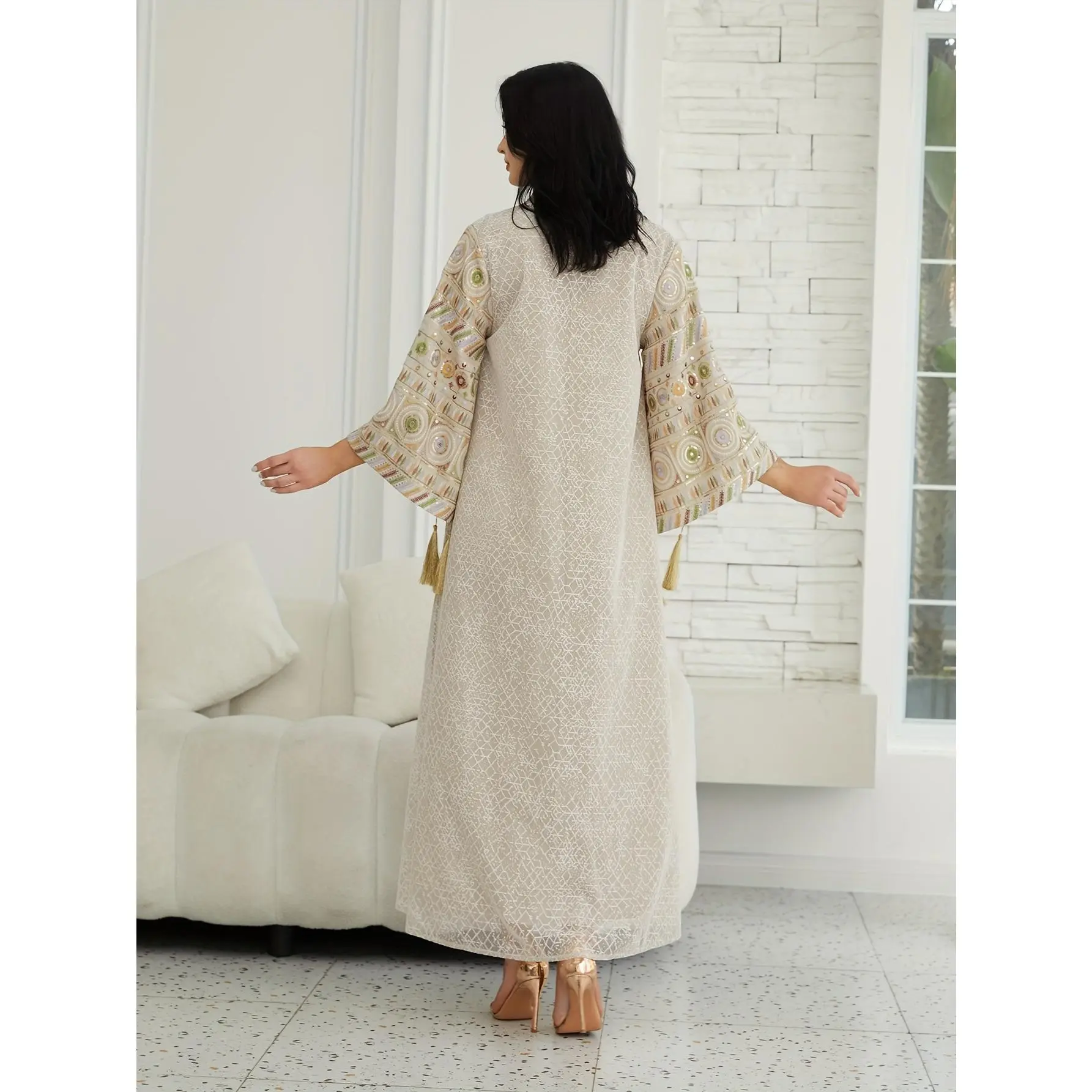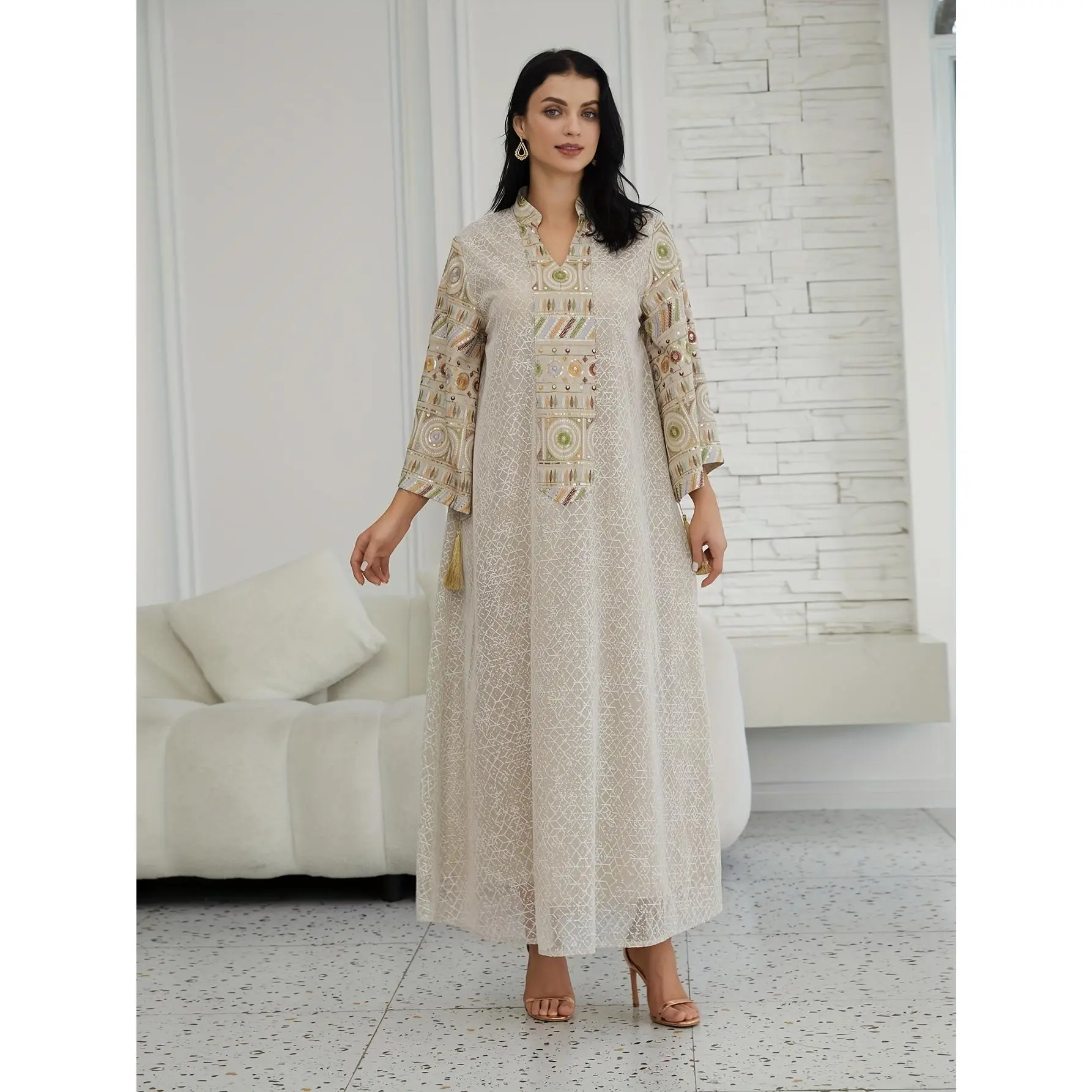 Directional Stock Middle Eastern Women'S Ramadan New Traditional Style Fashion Elegant Sequin Mesh Dress Jalabiya Evening Gown, Abayas Women'S Robe Kaftan Gown, Suitable for Festive Occasions And Parties