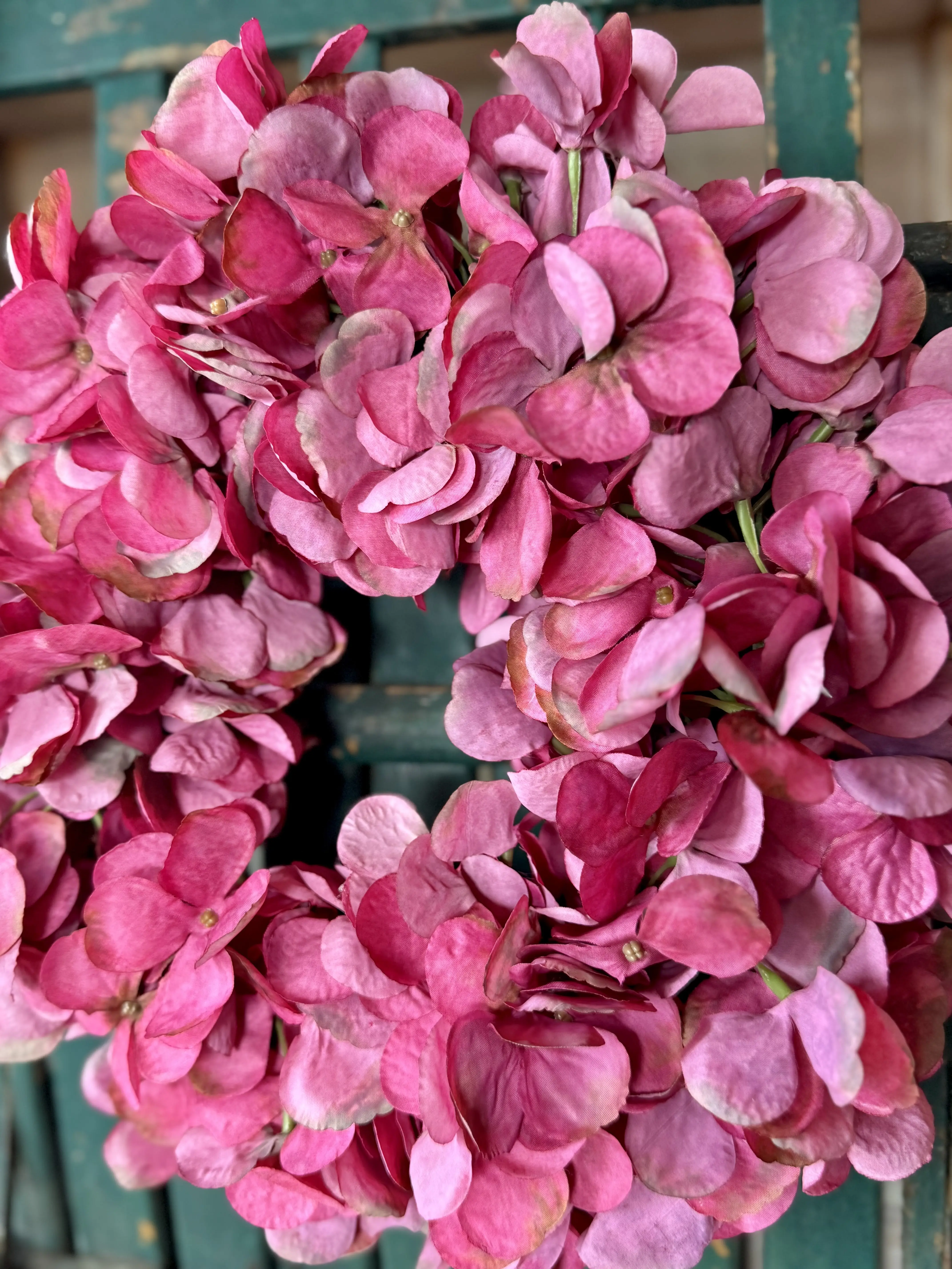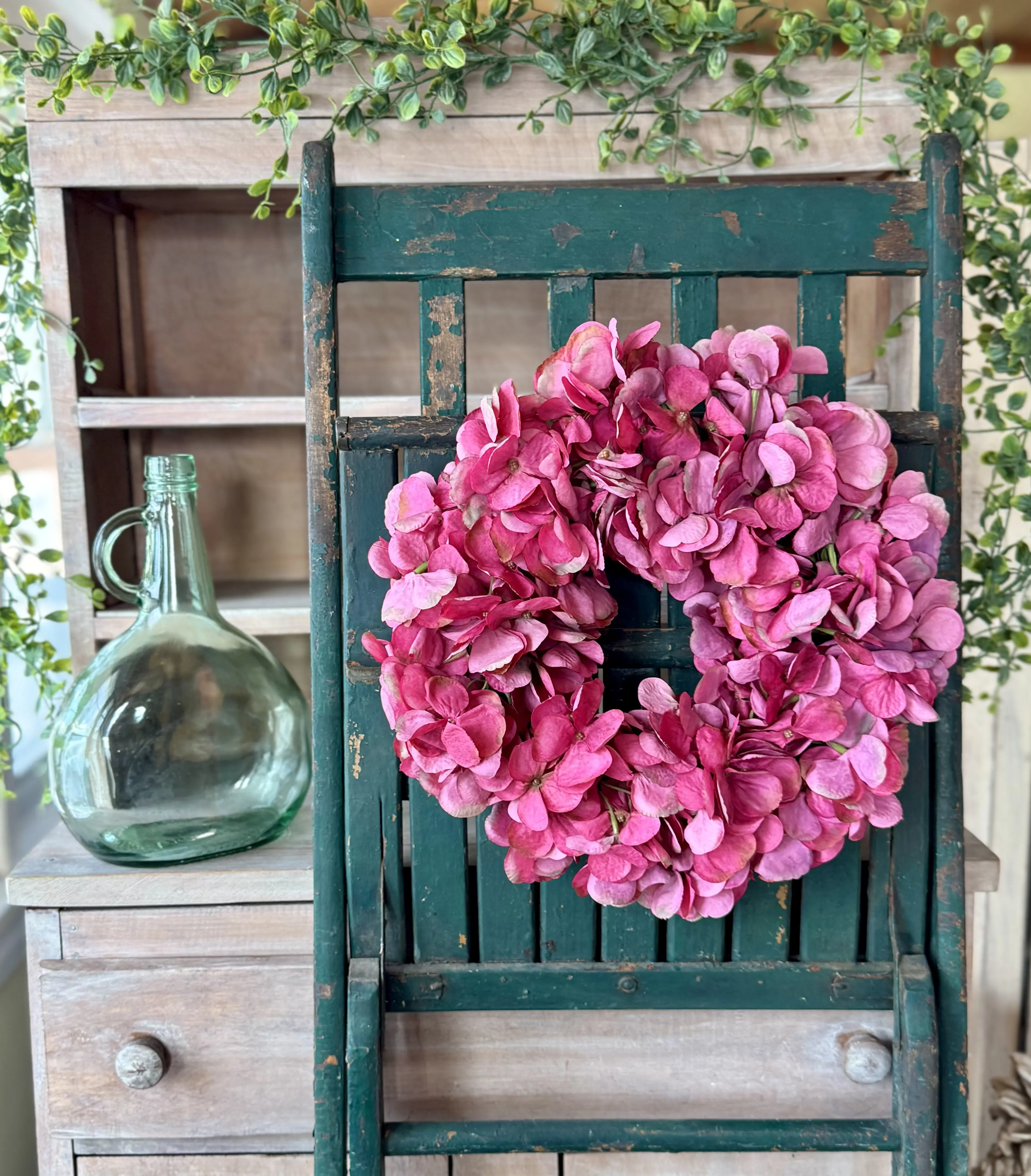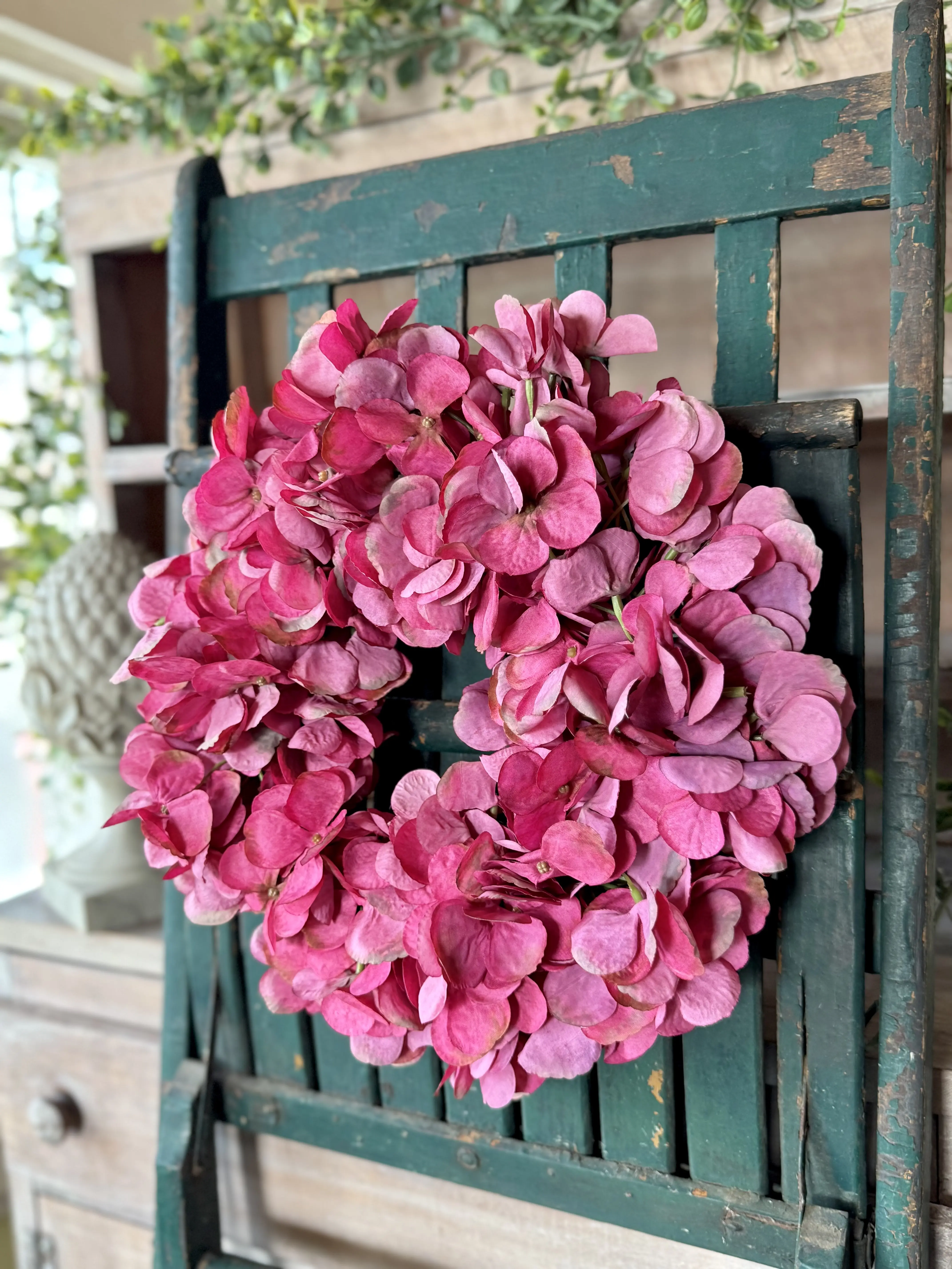 A delightful bouquet of dark magenta pink hydrangea flowers in wreath form. Hang it up or use it as a candle wreath. Either way, it’s sure to add the add joy to your home. Perfect for Mother’s Day and even into Spring and Summer! Works best as an accent wreath, candle wreath, or table wreath