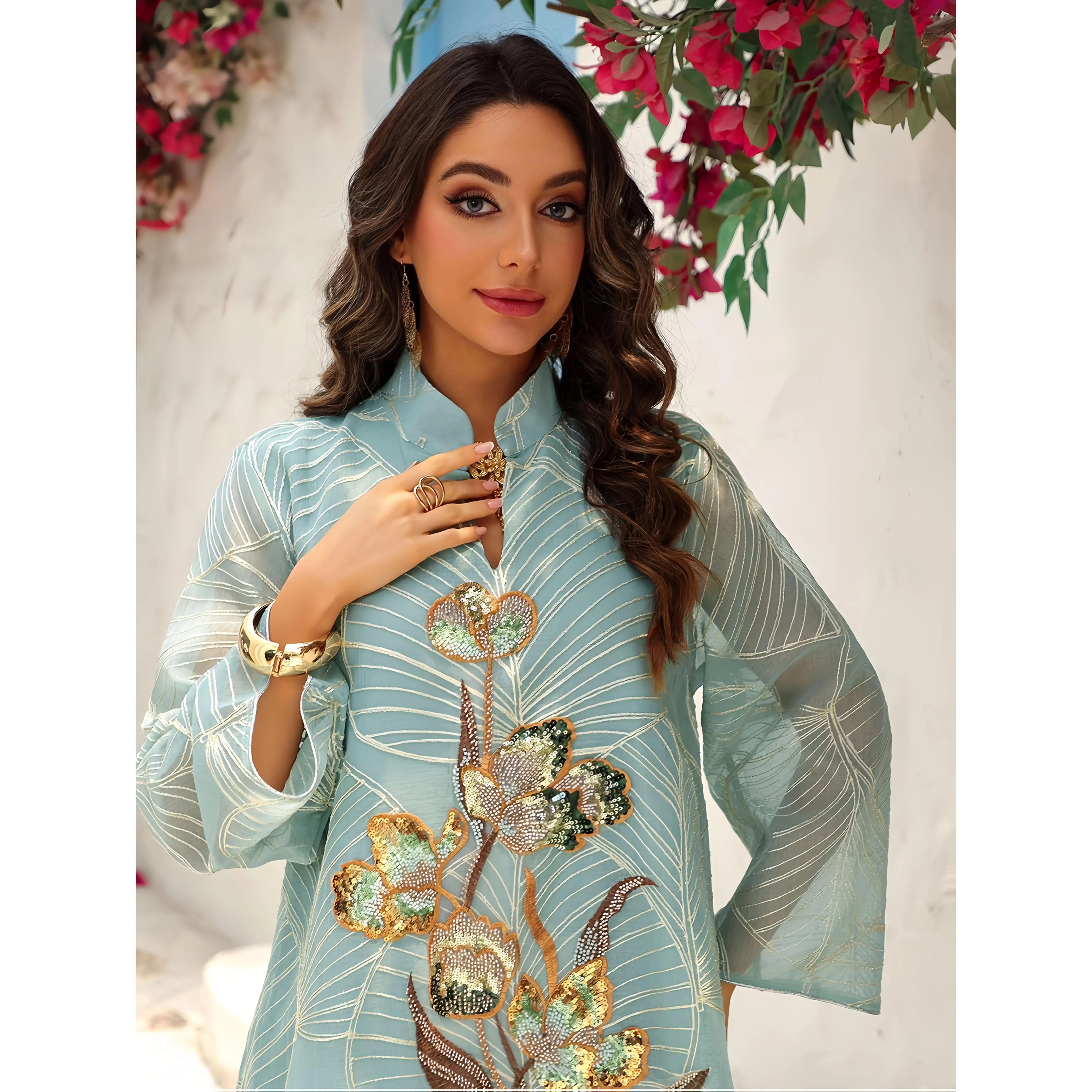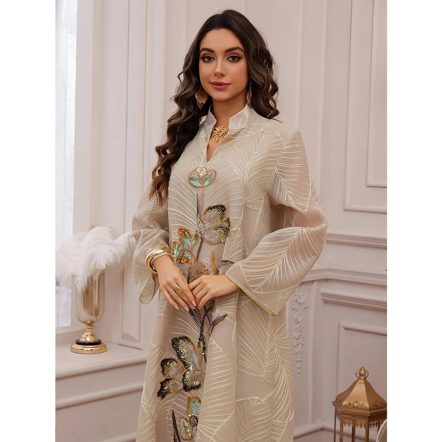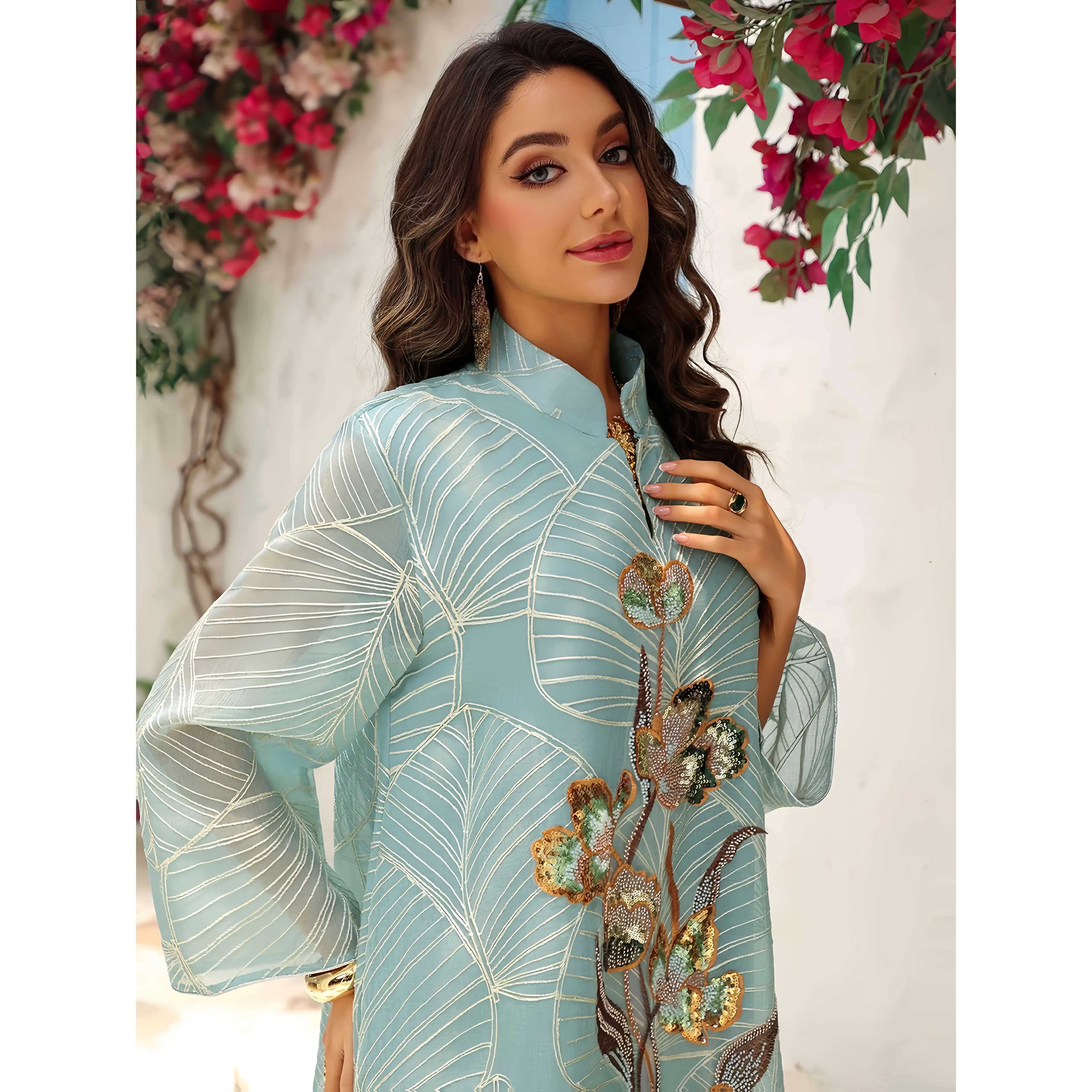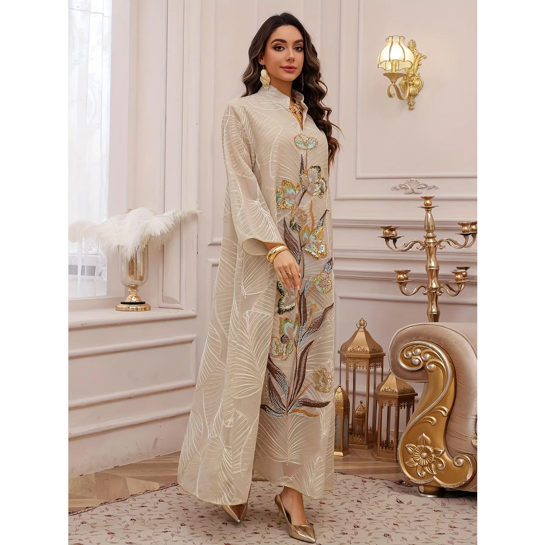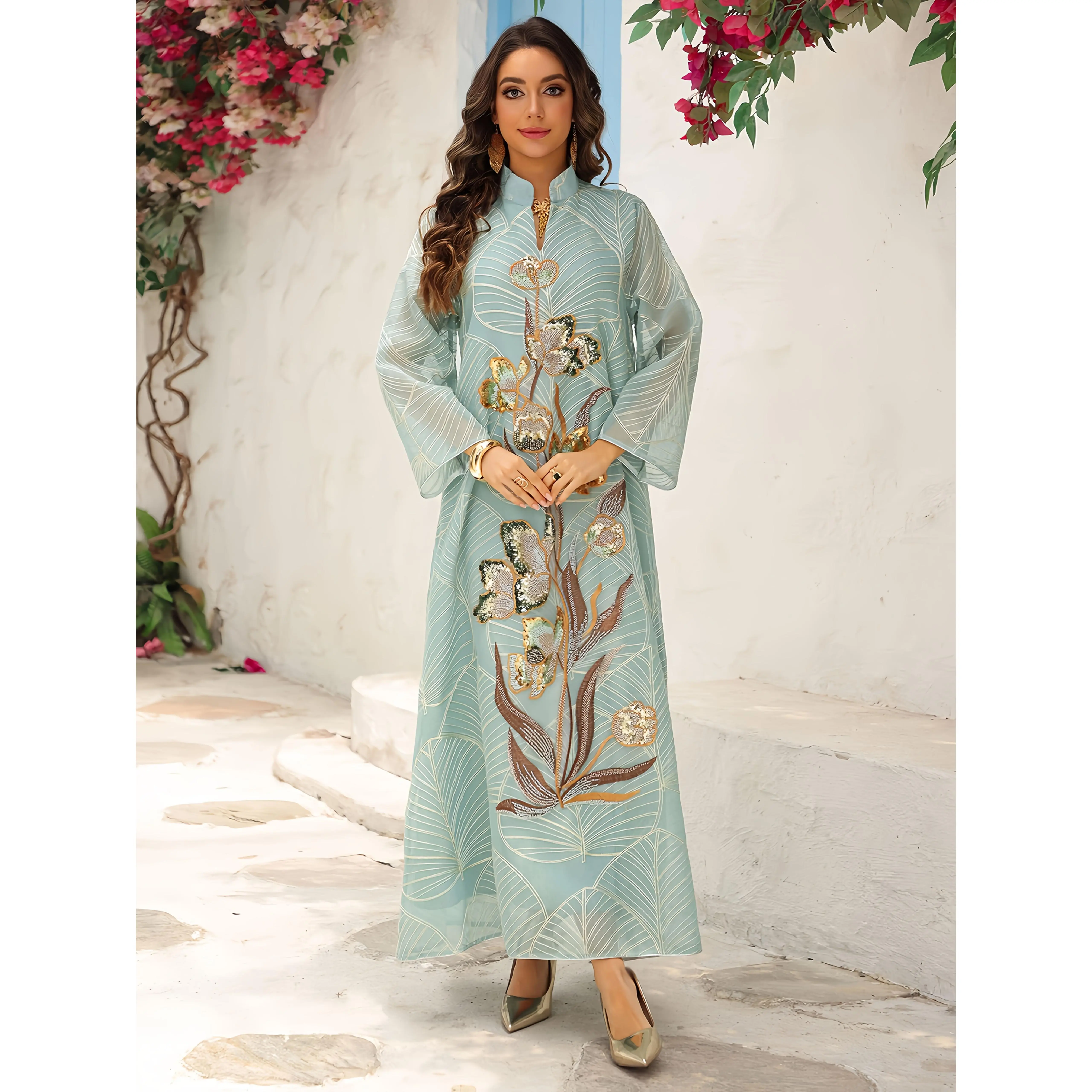1pc Women's Jalabaya Abaya Gown - Elegant Dubai Party Dress with Floral embroidery, Long Formalrobe for Wedding, Gala, Ramadan - Non-Stretchy Muslim Formal Attire, Galaxy Event Wear, Intricate Embroidery